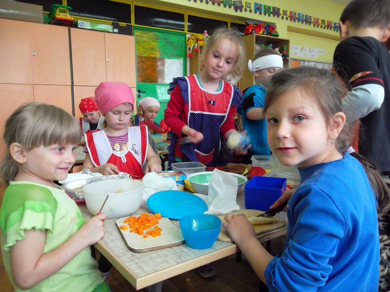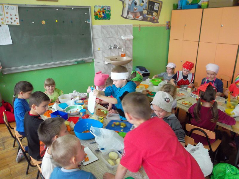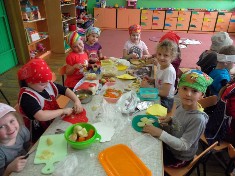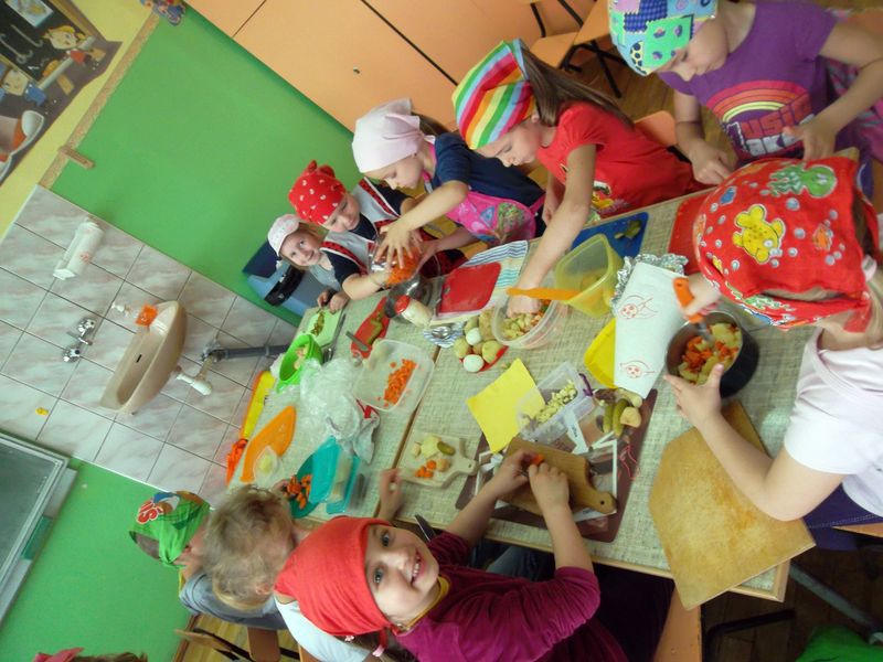 Tym razem, polem eksperymentowania była zabawa w gotowanie. Dzieci były wdrażane do poprawnych nawyków higienicznych niezbędnych przy kontakcie z żywnością oraz bezpiecznego posługiwania się ostrymi narzędziami kuchennymi.