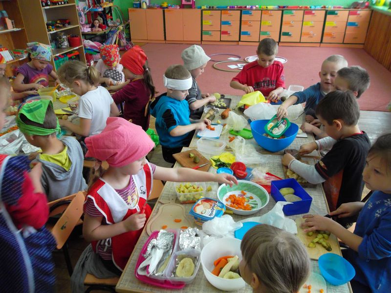 Kształtowanie poprawnych nawyków żywieniowych już od najmłodszych lat, to długotrwały proces. Największe efekty uzyskuje się poprzez eksperymentowanie, dlatego grupa pierwsza poznając nawyki zdrowego żywienia, wykonała kolorową sałatkę warzywną.