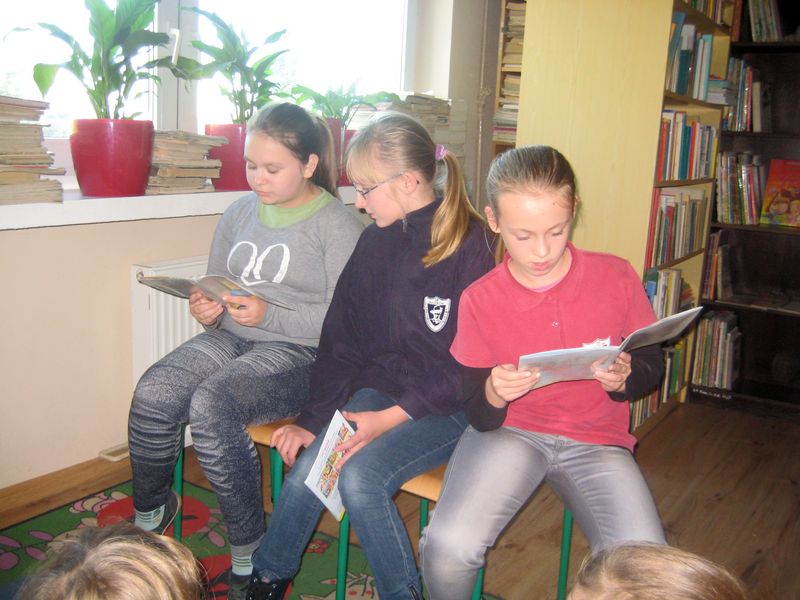 - klasy 0 – I wysłuchały w bibliotece słuchowisko „Czerwony Kapturek”, wysłuchały bajek czytanych przez bibliotekarza, wykonały kolorowanki z bajkowymi postaciami,