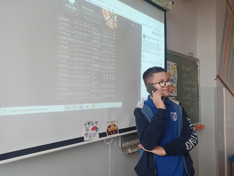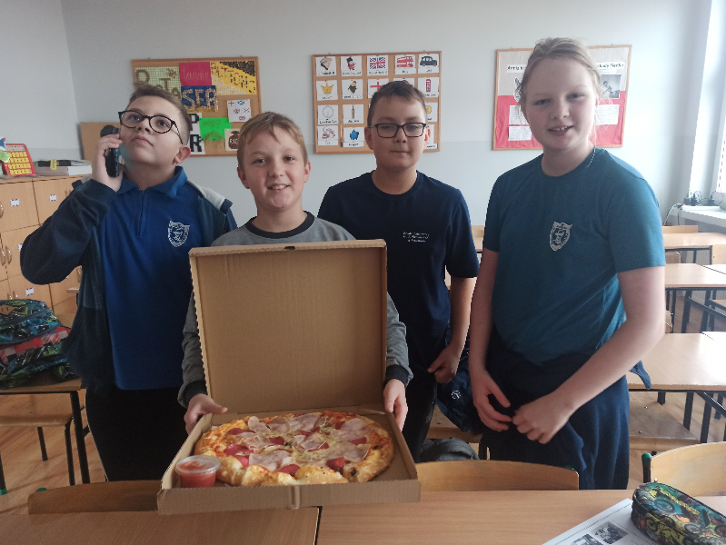 Uczniowie klasy 5 a postanowili w praktyce wykorzystać wiedzę zdobytą na lekcjach języka angielskiego, w czasie których poznali słownictwo i zwroty związane z zamawianiem jedzenia przez telefon. W czasie zajęć rozwijających prowadzonych przez panią Małgorzatę Palczewską zadzwonili do raszkowskiej pizzerii „Dolinka Smaku”. Rozmowę w języku angielskim przeprowadził Adam Nowacki i zamówił dla całej grupy pizzę. Dziękujemy „Dolince Smaku” za zrealizowanie zamówienia i pyszną pizzę
