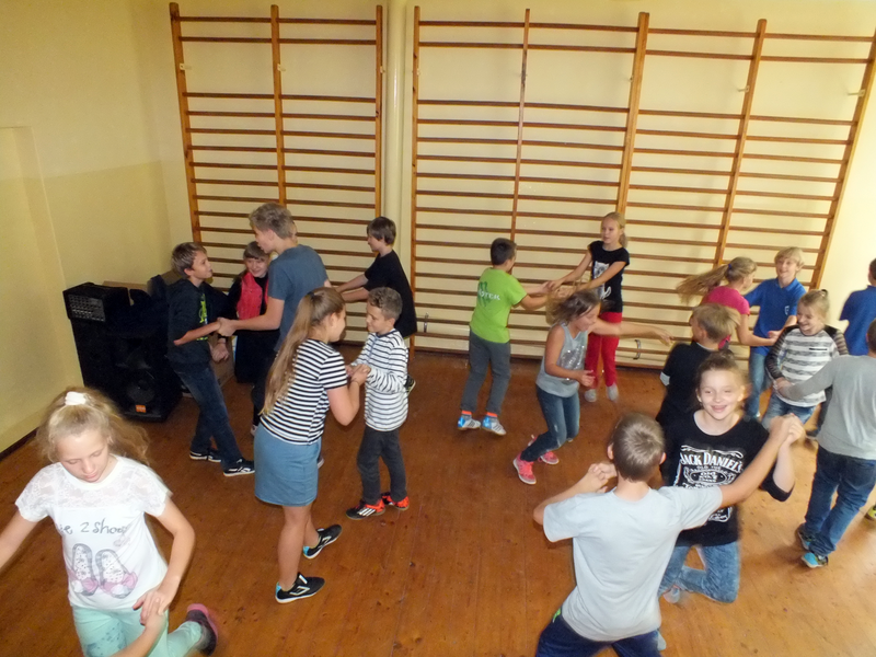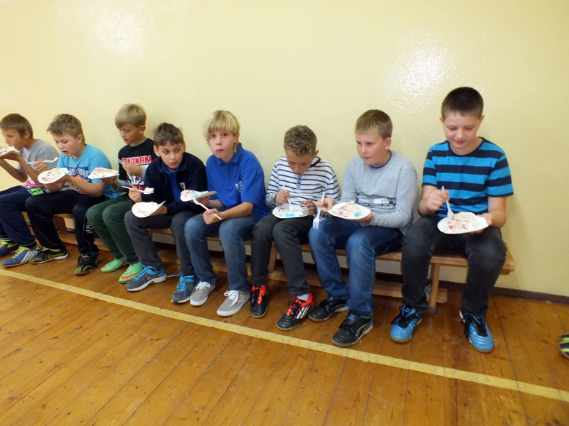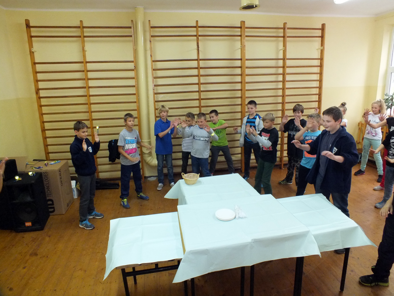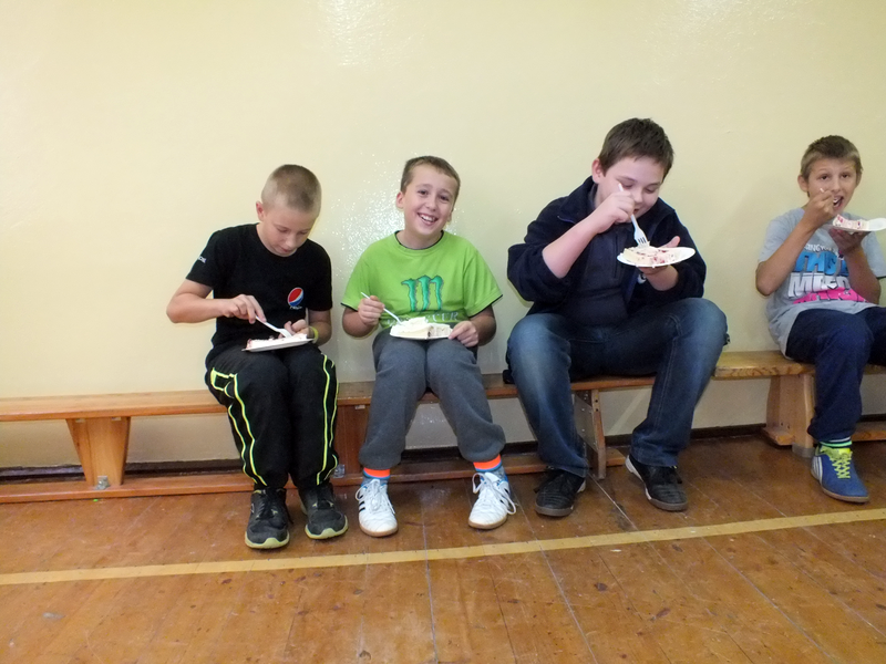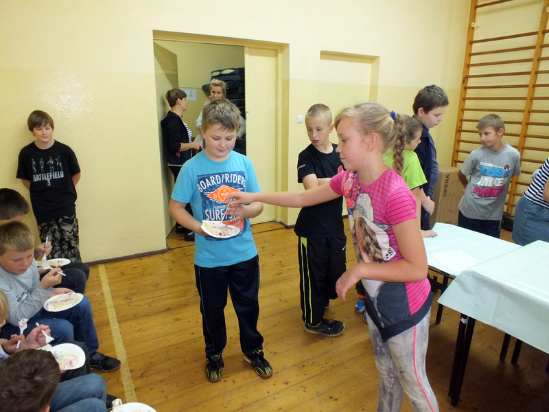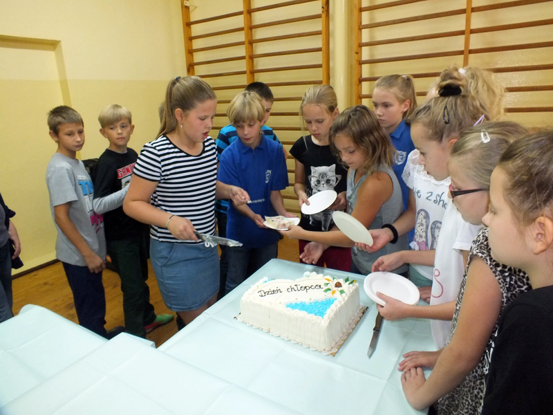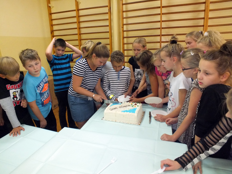 Po tańcu była następna niespodzianka czyli specjalny, pyszny tort. Zuzia z wielką wprawą pokroiła tort i wszyscy (no prawie) ze smakiem go zjedli. Gdy już się wszyscy posilili nastąpił ostatni punkt programu czyli wspólne tańce. Pan Dutkowski udzielił krótkiego tanecznego instruktażu dotyczącego prostych kroków, z czego wielu skwapliwie skorzystało.