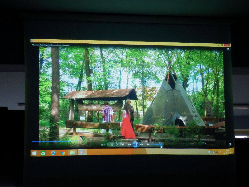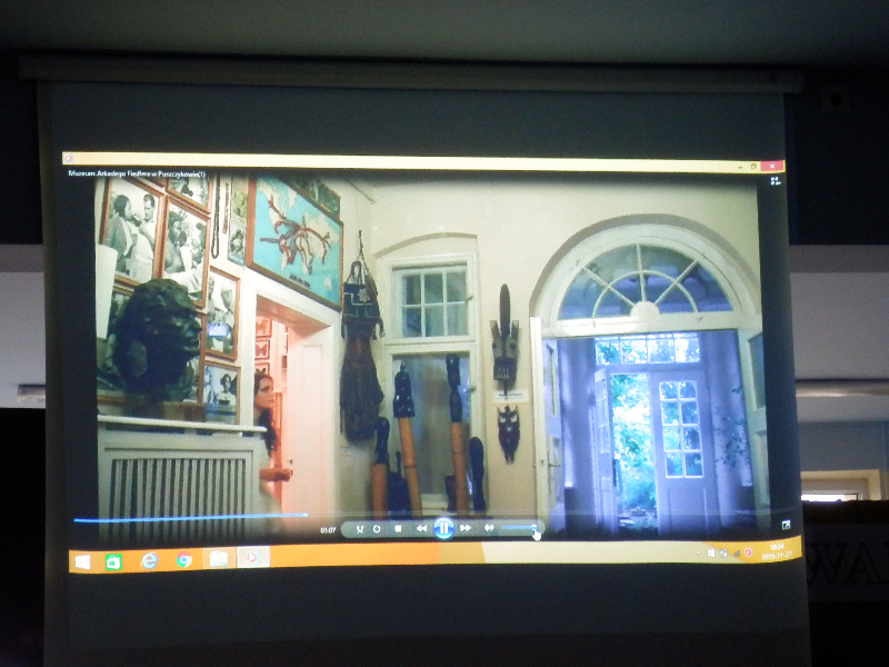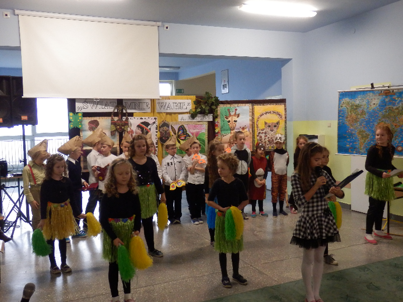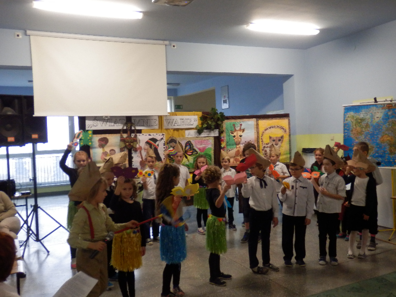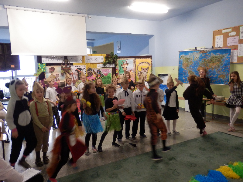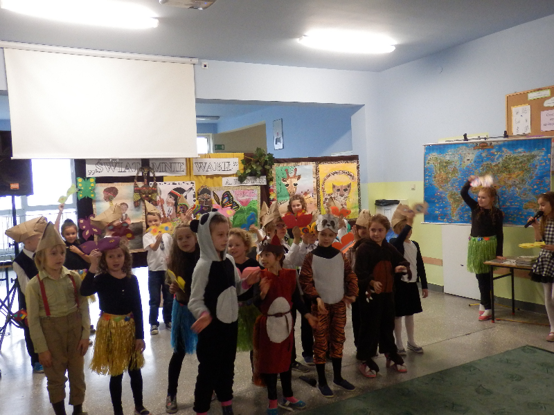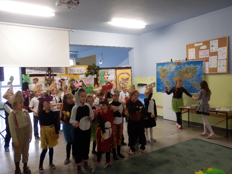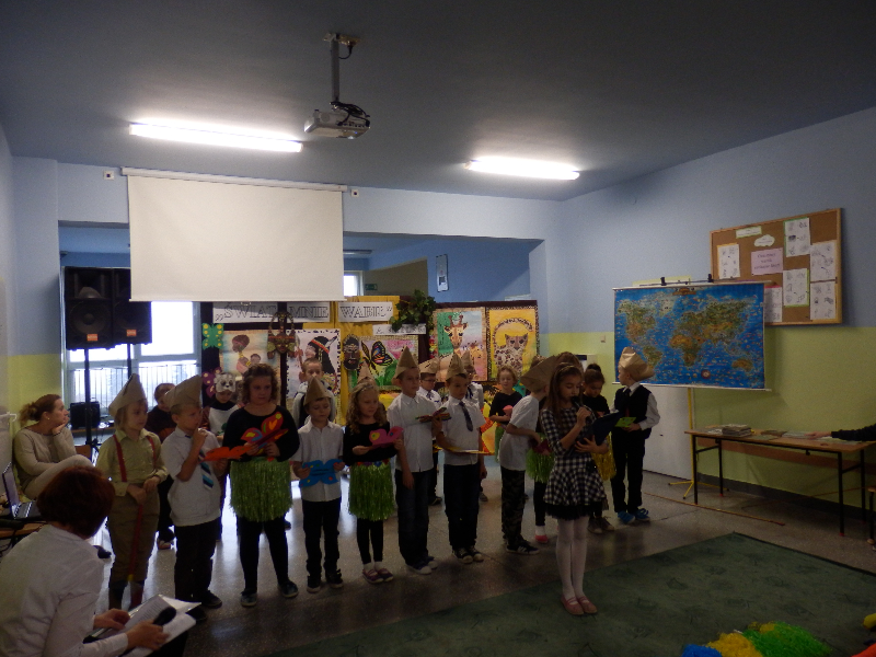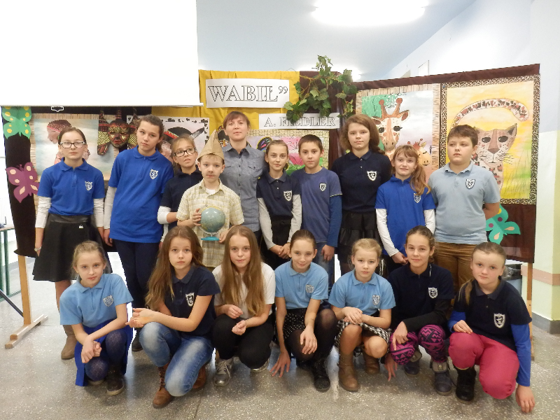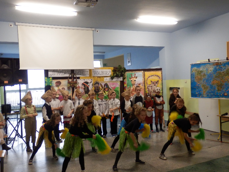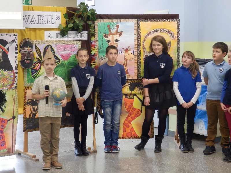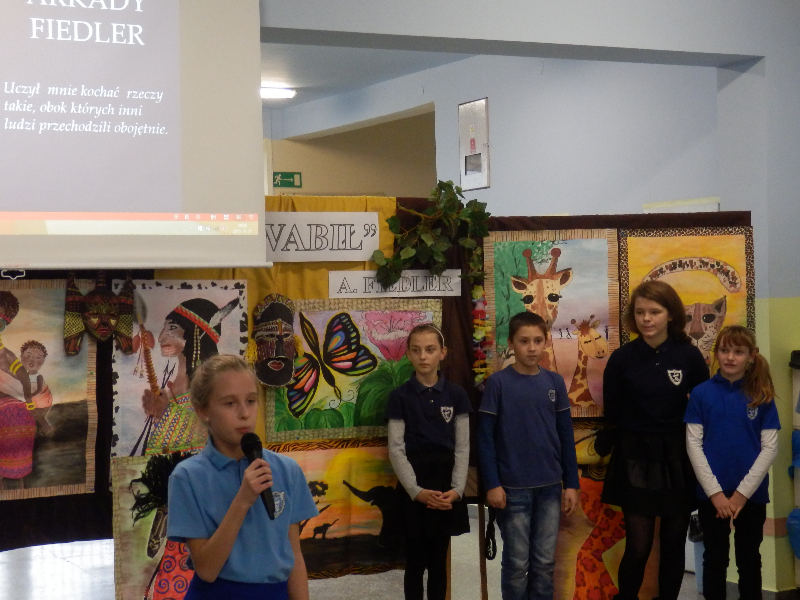 Również klasy IV –VI wzięły udział w apelu przypominającym sylwetkę i twórczość Arkadego Fiedlera. Został odśpiewany hymn szkoły. Następnie koło polonistyczne zaprezentowało program podróżniczy w formie wywiadu pt. Świat mnie wabił. Dominik Kłopocki z klasy Va wcielił się w rolę samego Arkadego Fiedlera. Opowiadał o odbytych podróżach, wspomnieniach z dzieciństwa, marzeniach, genezie napisanych książek i swoich przeżyciach, także tych trudnych- wojennych. Podczas występu artystycznego wypowiedzianych zostało wiele sentencji. Podkreślony został zachwyt przyrodą i otaczającym światem. Warto pielęgnować w sobie miłość do przyrody, rozwijać swoje pasje i kultywować tradycje. Uczniowie odbyli fascynującą podróż geograficzną i wędrówkę w czasie razem z naszym patronem. Całość wzbogaciła prezentacja multimedialna.