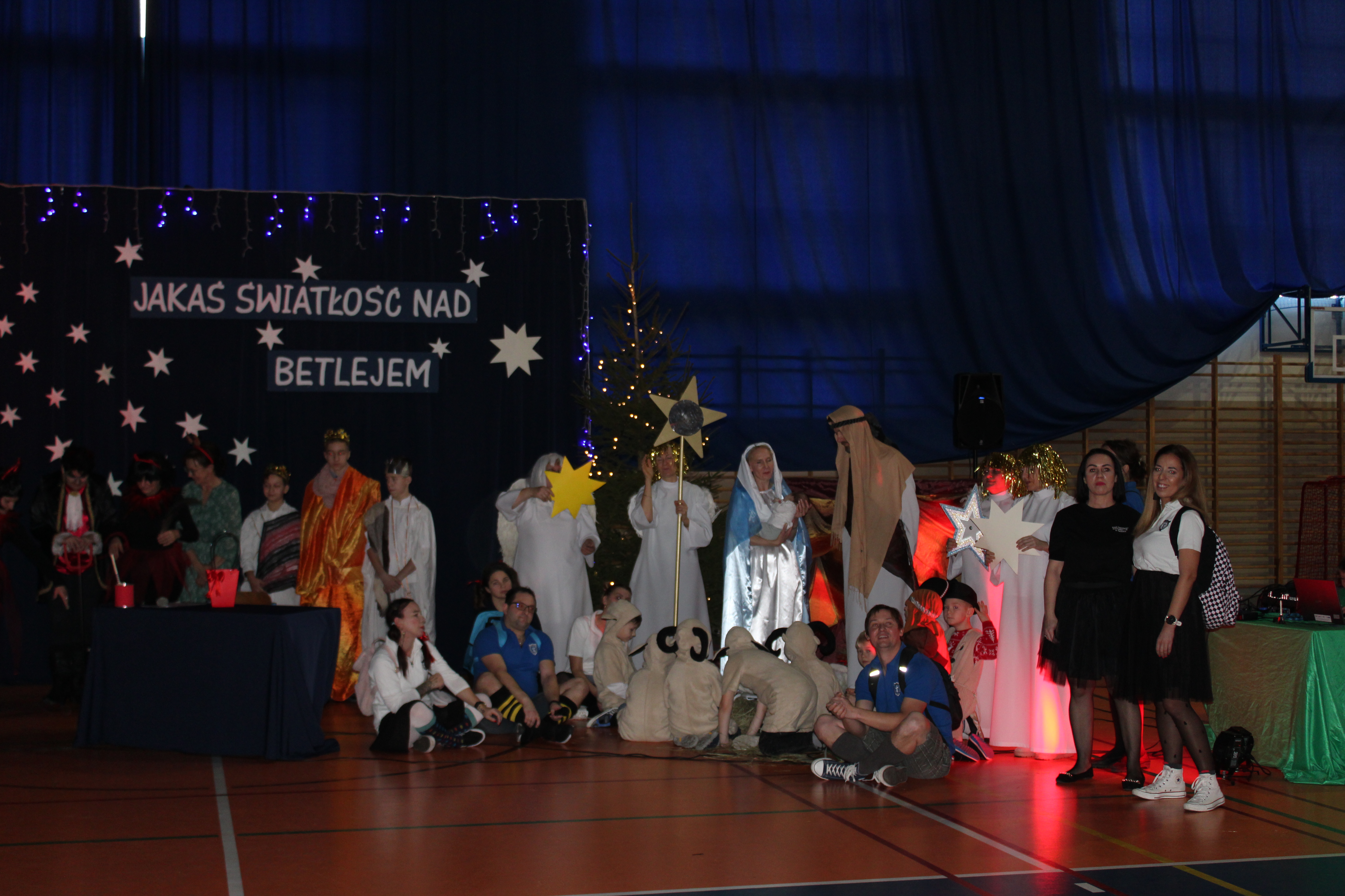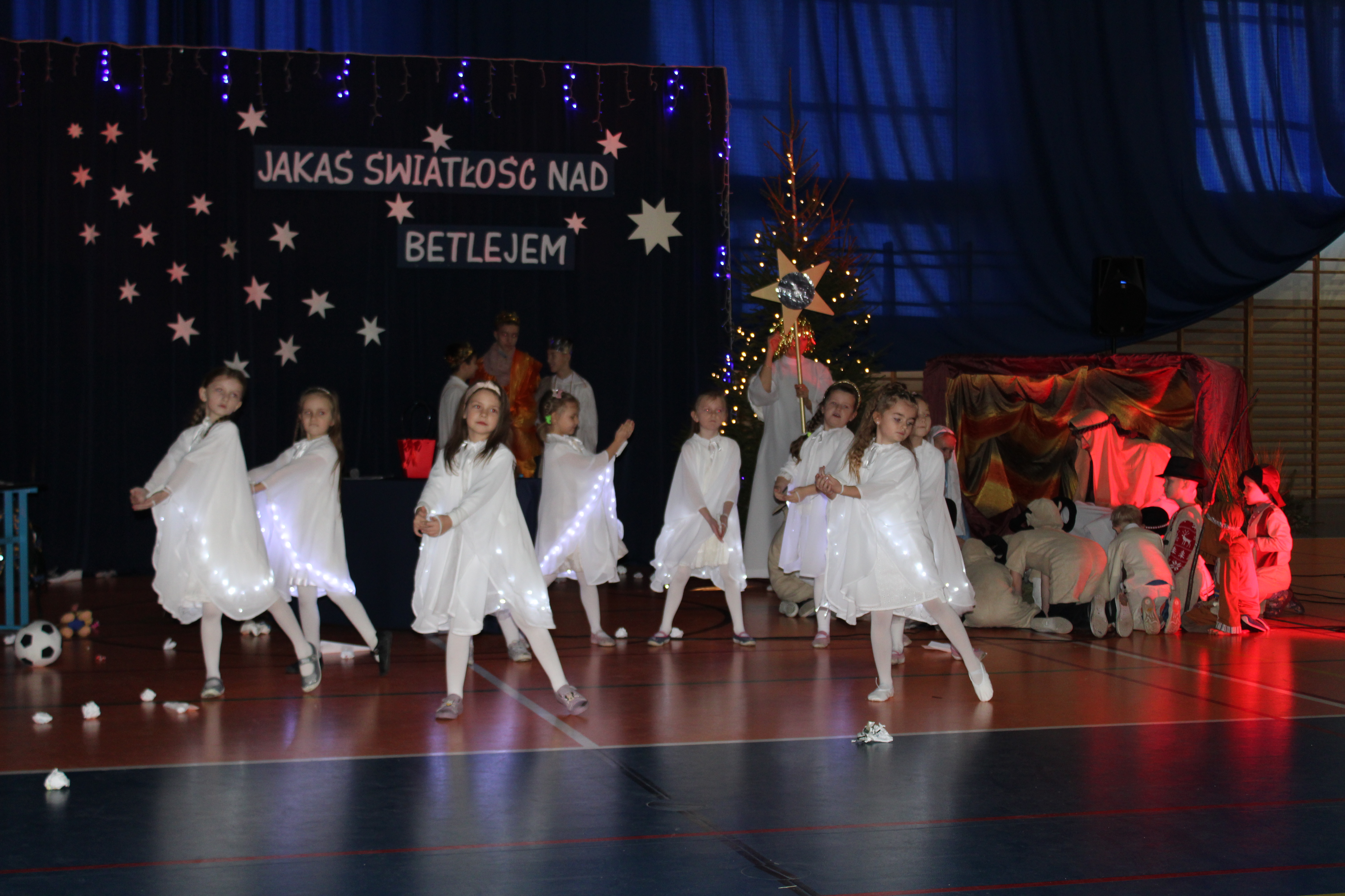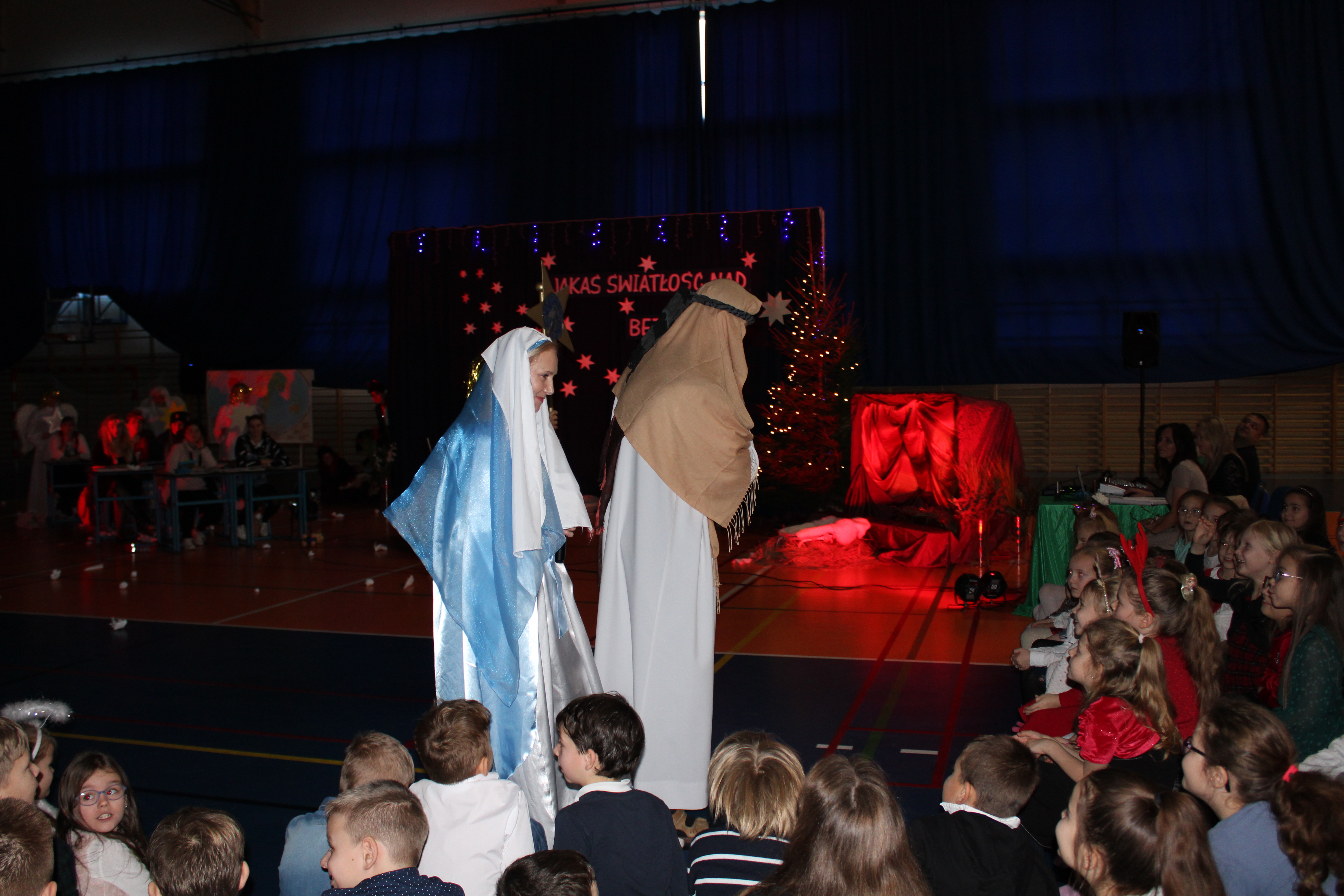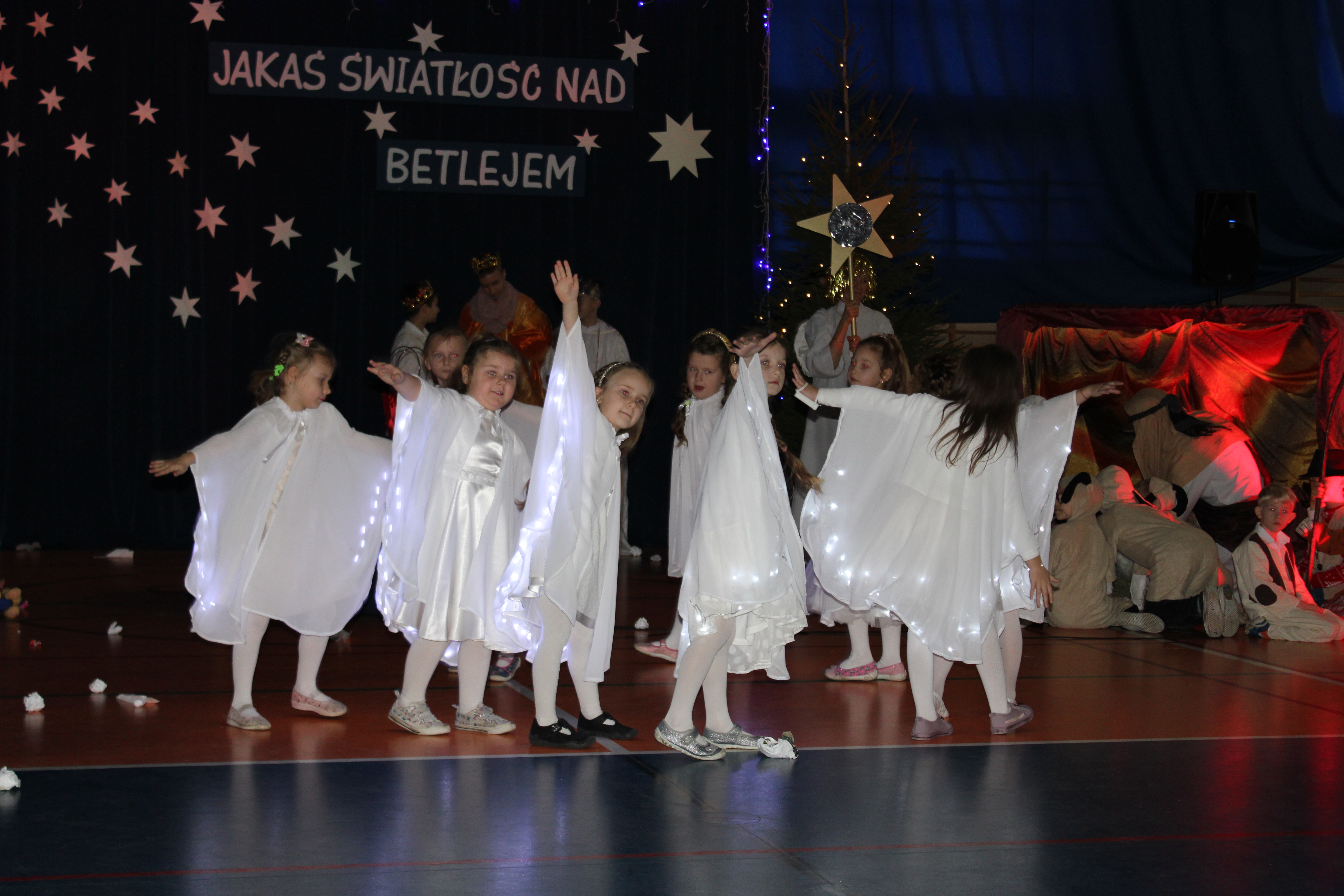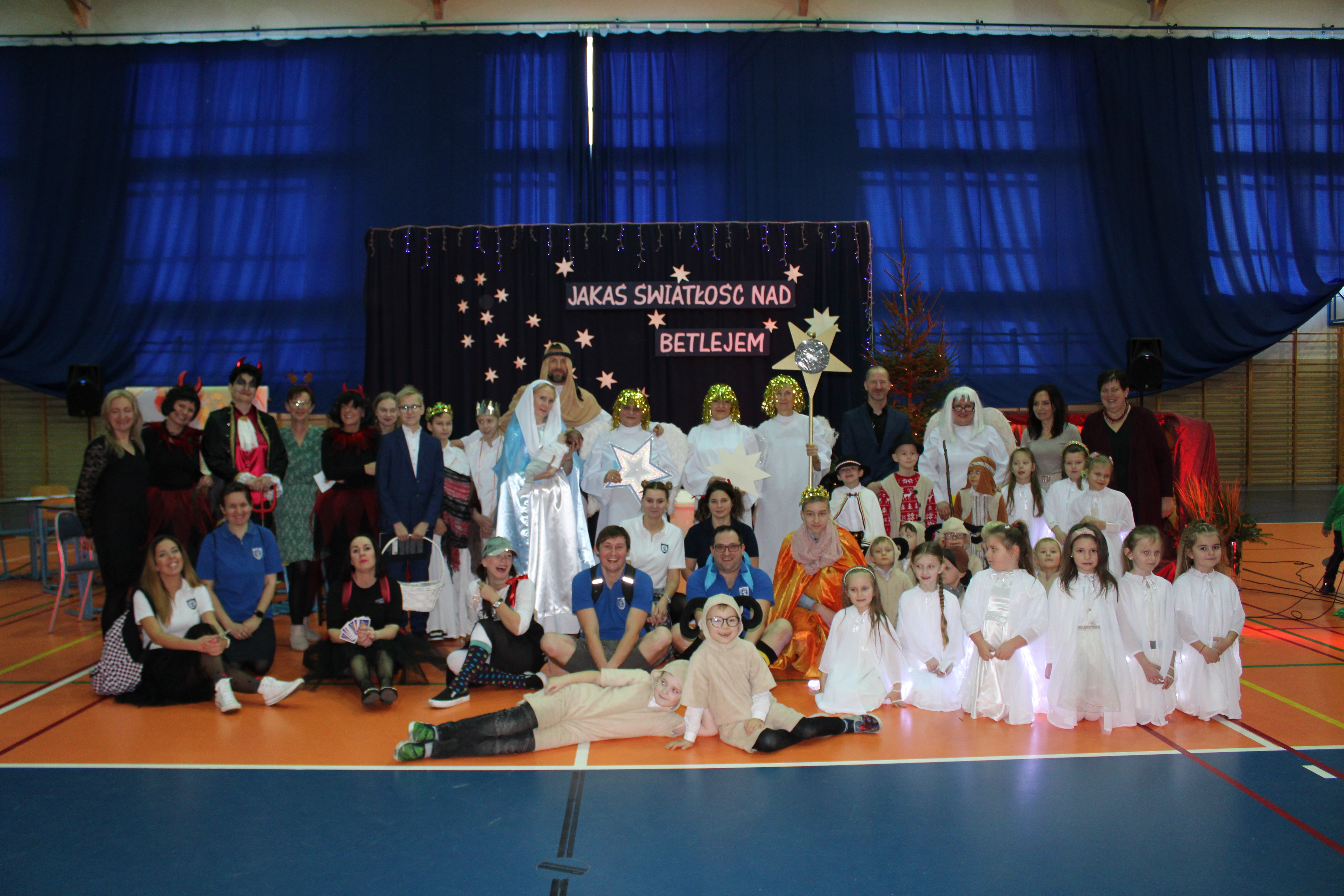 Zbliżające się święta Bożego Narodzenia to czas wyczekiwany szczególnie przez dzieci, ale także przez dorosłych. Magię świąt w naszej szkole można było poczuć w miniony czwartek, który był jednocześnie ostatnim dniem nauki w bieżącym roku. Jasełka to widowisko o Bożym Narodzeniu, które od wieków wpisane są w polską tradycję oraz corocznie wystawiane w naszej szkole. Przedstawienie jasełkowe pt. „Jakaś światłość nad Betlejem” miało przybliżyć uczniom okoliczności narodzin Pana Jezusa. Scenariusz jasełek zawierał najważniejsze wydarzenia towarzyszące narodzinom Jezusa. Główni bohaterowie jasełek – niesforna klasa, dostąpiła zaszczytu obecności przy narodzeniu małego Jezusa. Droga to tego spotkania usłana była różnymi przeciwnościami – podstępne diabły chciały namówić dzieci na naukę w piekielnej klasie! Jednak opieka cudownych Aniołów, pozwoliła dzieciom uwolnić się spod wpływu diabłów i w sposób godny, doniosły przeżyć czas Bożego Narodzenia. W jasełkach bożonarodzeniowych udział wzięli rodzice naszych uczniów: panie Iwona Piotrowicz, Sylwia Konczyńska, Bogumiła Hejdysz i pan Dariusz Drygas. Nauczycielska kadra występująca w tym dniu to: Alina Stefańska, Renata Bartoś, Małgorzata Hajdziony, Anna Sztok, Anna Szymankiewicz, Mariola Janiak, Violeta Rostalska, Izabela Urbaniak, Małgorzata Palczewska, Daria Sobczak, Beata Lisiak, Katarzyna Zaworska, Karol Marciszewski i Sławomir Krawczyk. Piękne piosenki nawiązujące do dnia Bożego Narodzenia wykonały uczennice Sara Janoś i Małgorzata Pluta. Dziewczynki z oddziałów przedszkolnych zatańczyły przy żłóbku, przy którym czuwali pastuszkowie i owieczki. Trzej Królowie: Mateusz Wandelt, Kacper Gościaniak i Krystian Gwóźdź złożyli dary i pokłonili się Maleńkiemu – w tym roku nowonarodzonego Jezuska cudownie zagrała maleńka Zuzia. O oprawę muzyczną zadbał pan Łukasz Naczke, nad całością spektaklu czuwały panie: Marzena Klimek i Justyna Żurkiewicz. Szkolny zespół Mariposa wykonał układy taneczne do popularnych piosenek świątecznych.
