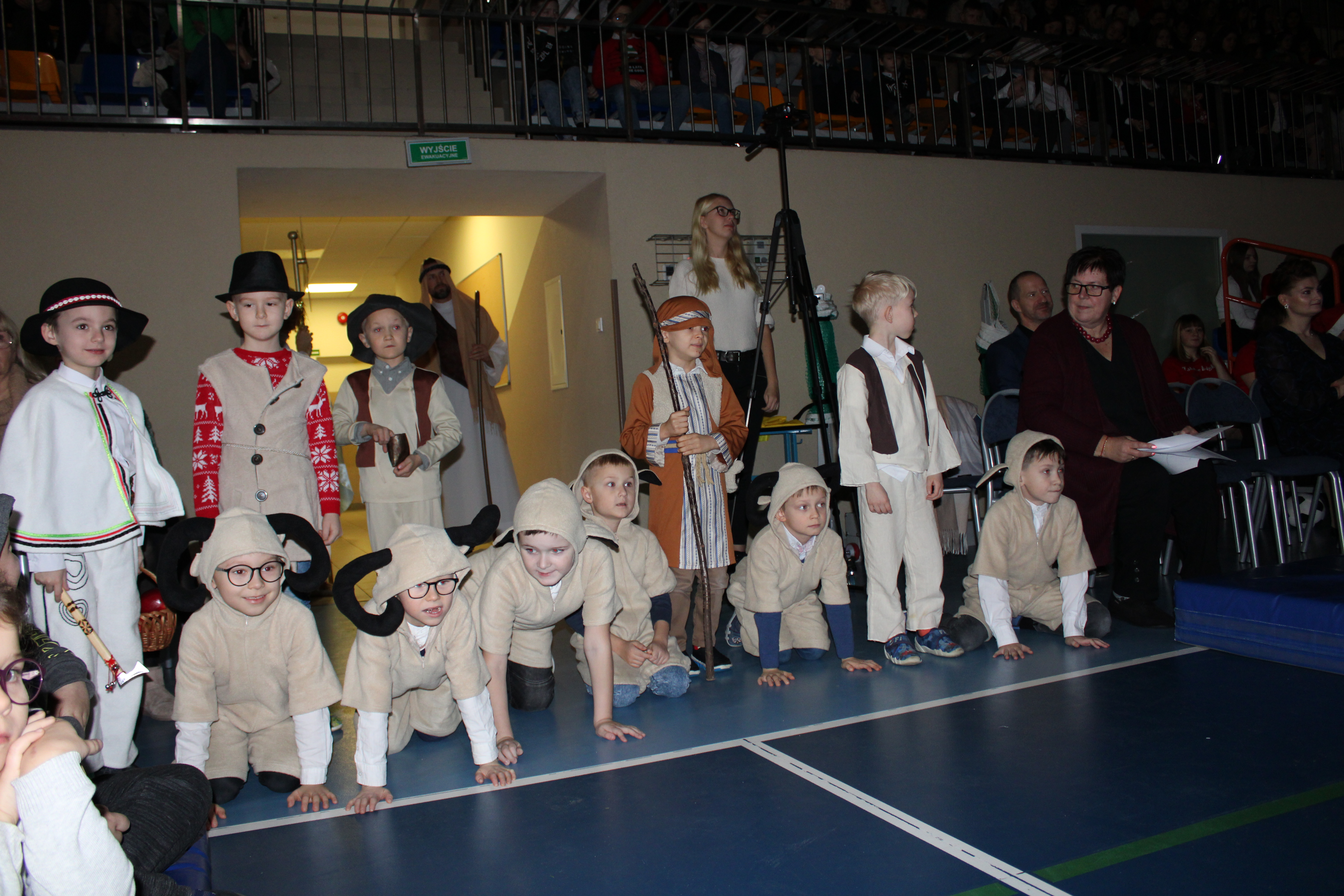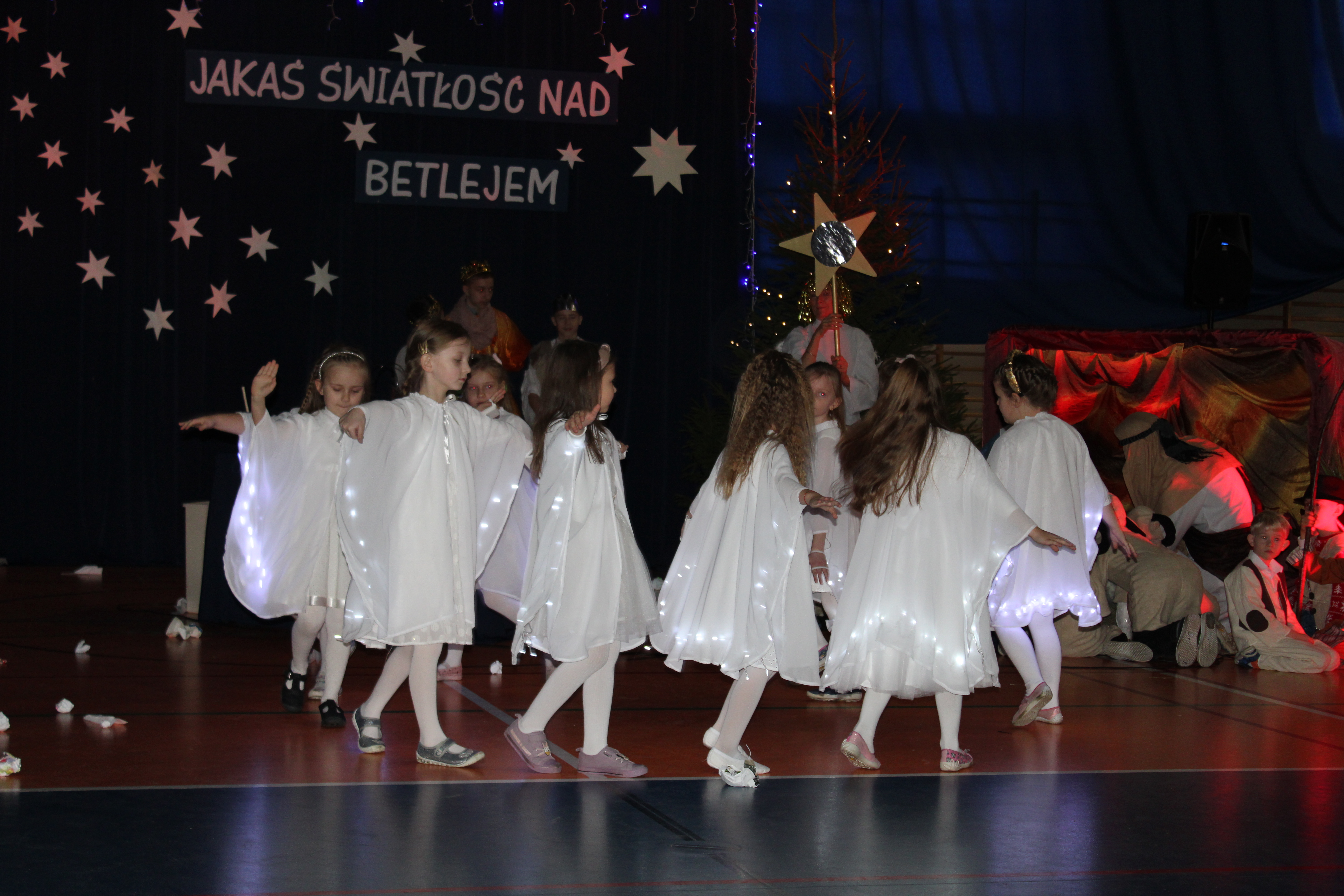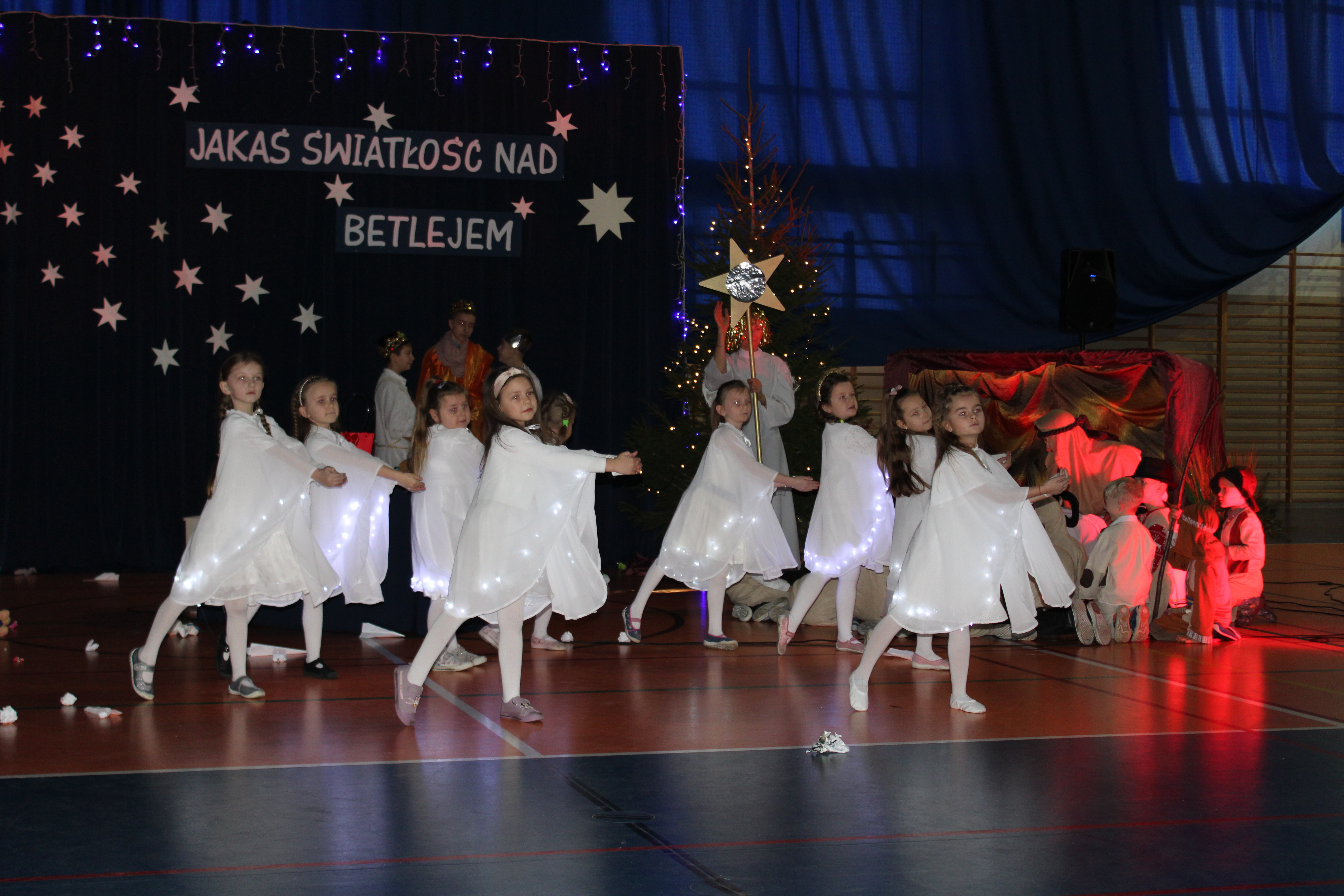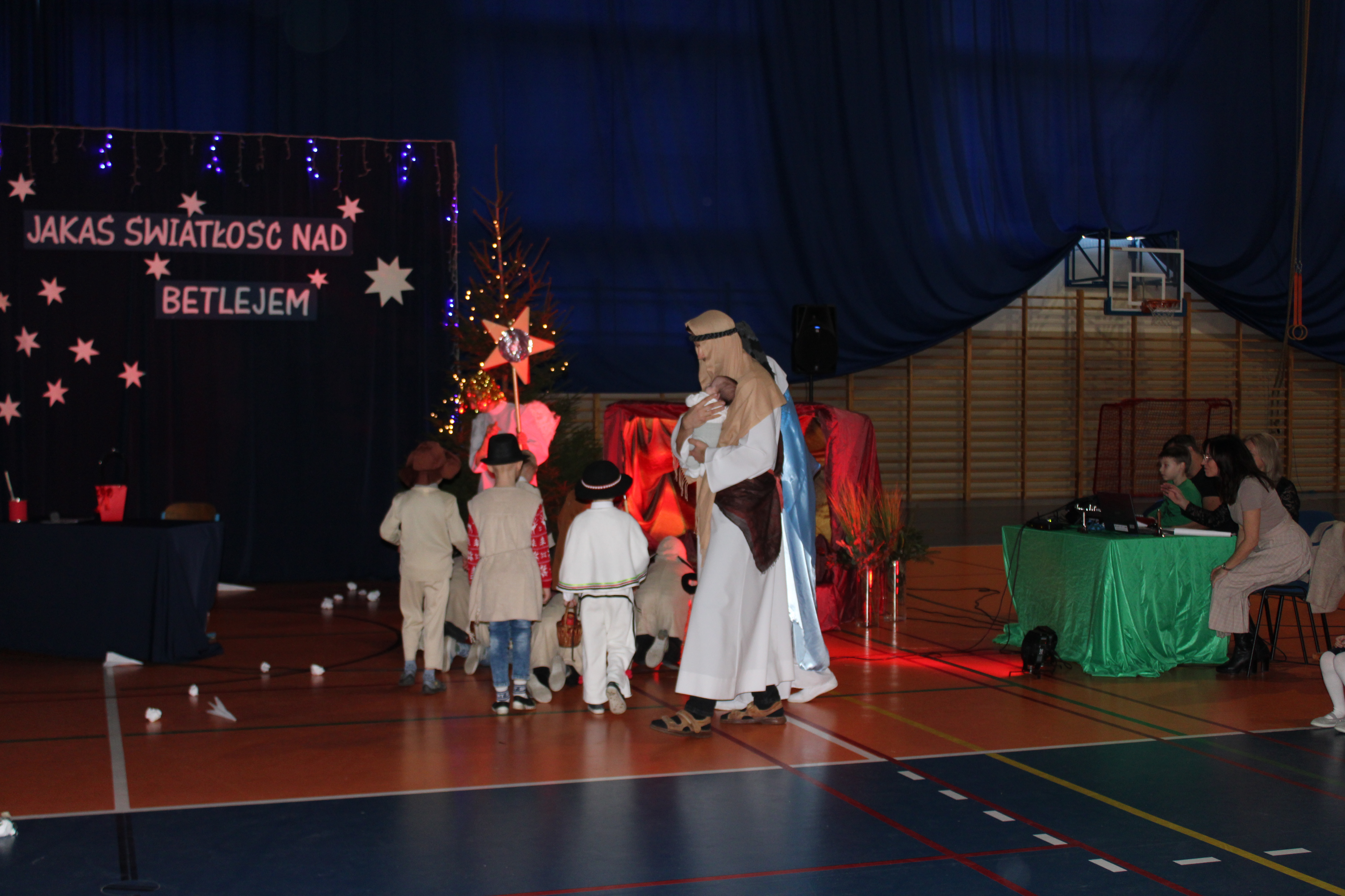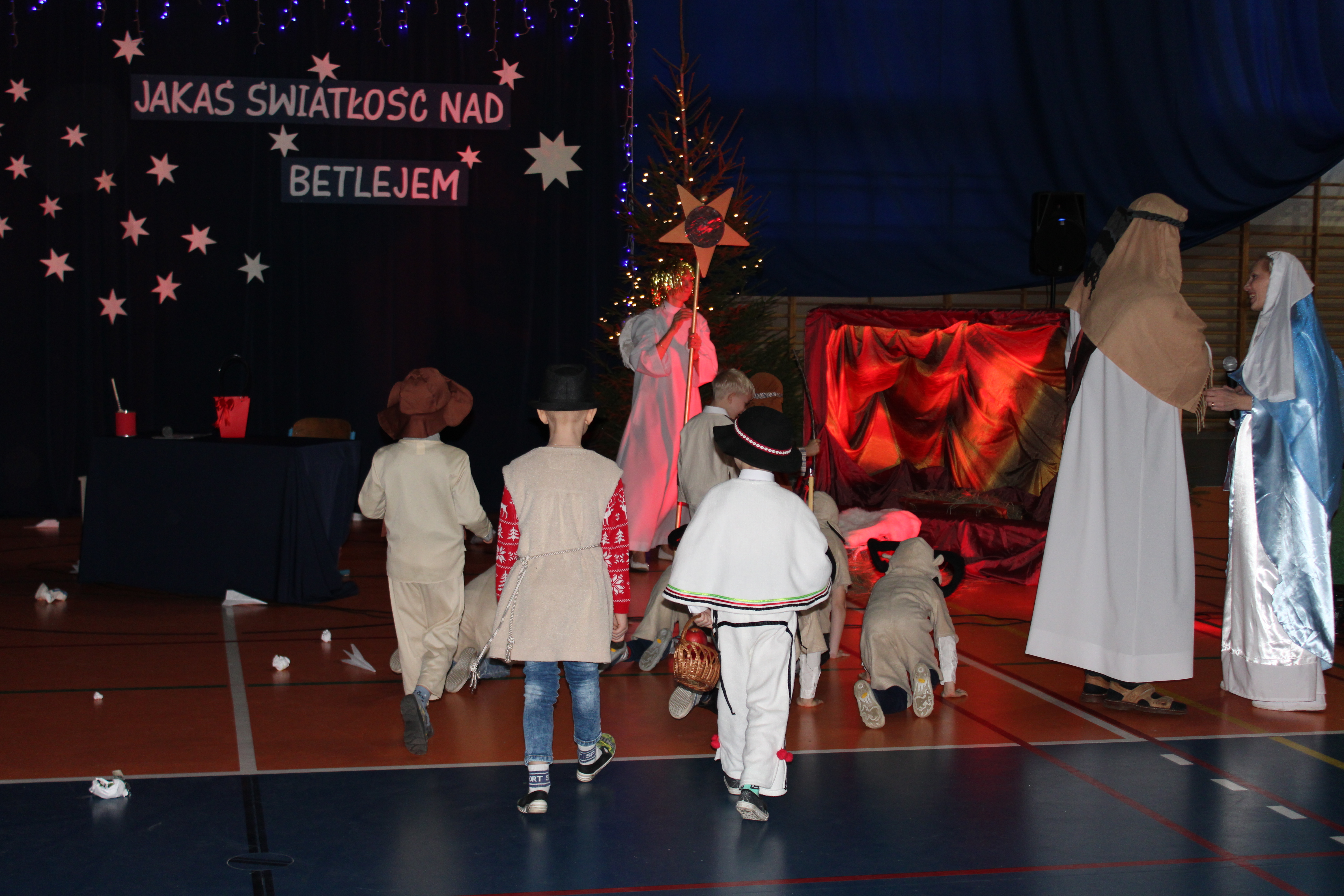 Zbliżające się święta Bożego Narodzenia to czas wyczekiwany szczególnie przez dzieci, ale także przez dorosłych. Magię świąt w naszej szkole można było poczuć w miniony czwartek, który był jednocześnie ostatnim dniem nauki w bieżącym roku. Jasełka to widowisko o Bożym Narodzeniu, które od wieków wpisane są w polską tradycję oraz corocznie wystawiane w naszej szkole. Przedstawienie jasełkowe pt. „Jakaś światłość nad Betlejem” miało przybliżyć uczniom okoliczności narodzin Pana Jezusa. Scenariusz jasełek zawierał najważniejsze wydarzenia towarzyszące narodzinom Jezusa. Główni bohaterowie jasełek – niesforna klasa, dostąpiła zaszczytu obecności przy narodzeniu małego Jezusa. Droga to tego spotkania usłana była różnymi przeciwnościami – podstępne diabły chciały namówić dzieci na naukę w piekielnej klasie! Jednak opieka cudownych Aniołów, pozwoliła dzieciom uwolnić się spod wpływu diabłów i w sposób godny, doniosły przeżyć czas Bożego Narodzenia. W jasełkach bożonarodzeniowych udział wzięli rodzice naszych uczniów: panie Iwona Piotrowicz, Sylwia Konczyńska, Bogumiła Hejdysz i pan Dariusz Drygas. Nauczycielska kadra występująca w tym dniu to: Alina Stefańska, Renata Bartoś, Małgorzata Hajdziony, Anna Sztok, Anna Szymankiewicz, Mariola Janiak, Violeta Rostalska, Izabela Urbaniak, Małgorzata Palczewska, Daria Sobczak, Beata Lisiak, Katarzyna Zaworska, Karol Marciszewski i Sławomir Krawczyk. Piękne piosenki nawiązujące do dnia Bożego Narodzenia wykonały uczennice Sara Janoś i Małgorzata Pluta. Dziewczynki z oddziałów przedszkolnych zatańczyły przy żłóbku, przy którym czuwali pastuszkowie i owieczki. Trzej Królowie: Mateusz Wandelt, Kacper Gościaniak i Krystian Gwóźdź złożyli dary i pokłonili się Maleńkiemu – w tym roku nowonarodzonego Jezuska cudownie zagrała maleńka Zuzia. O oprawę muzyczną zadbał pan Łukasz Naczke, nad całością spektaklu czuwały panie: Marzena Klimek i Justyna Żurkiewicz. Szkolny zespół Mariposa wykonał układy taneczne do popularnych piosenek świątecznych.
