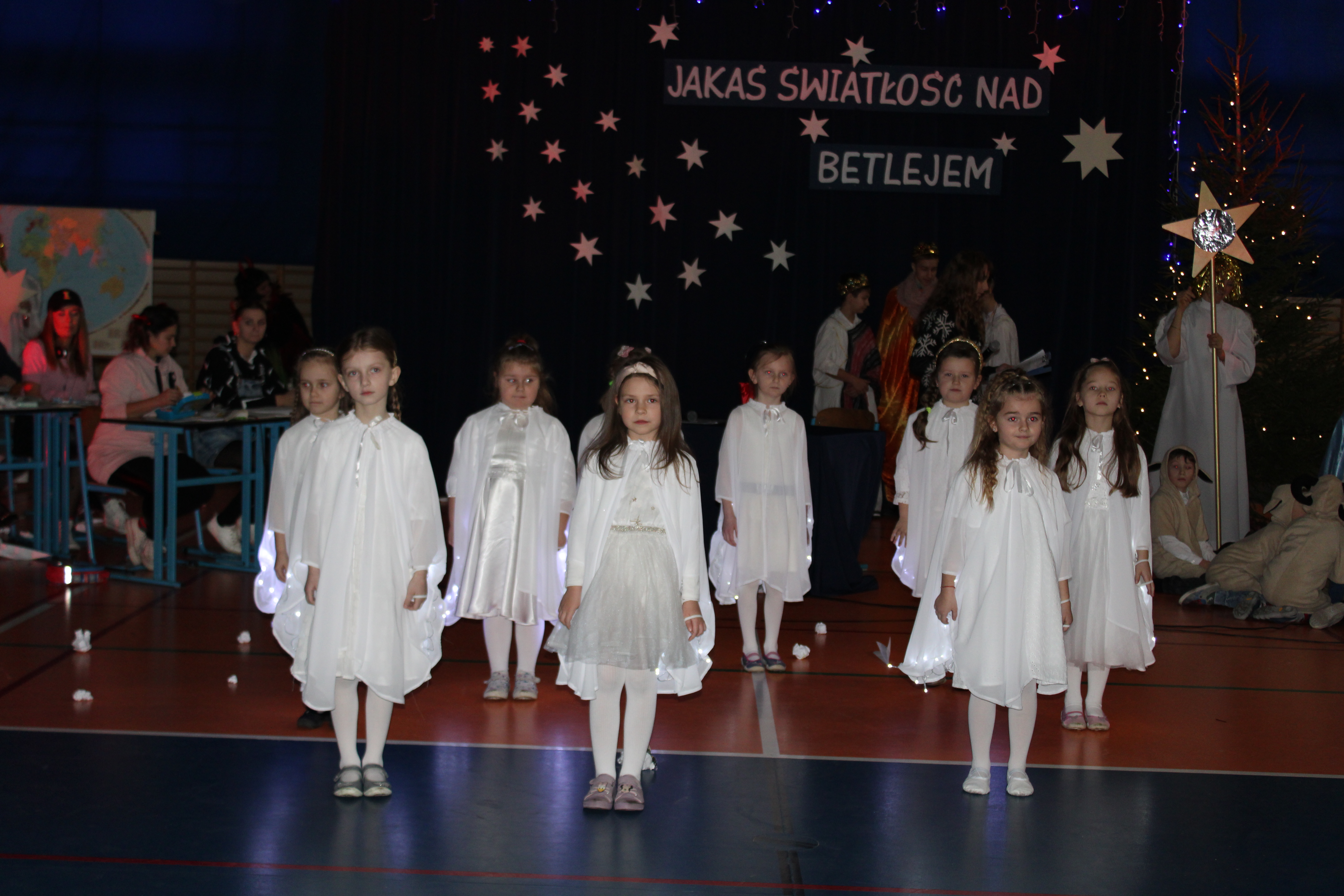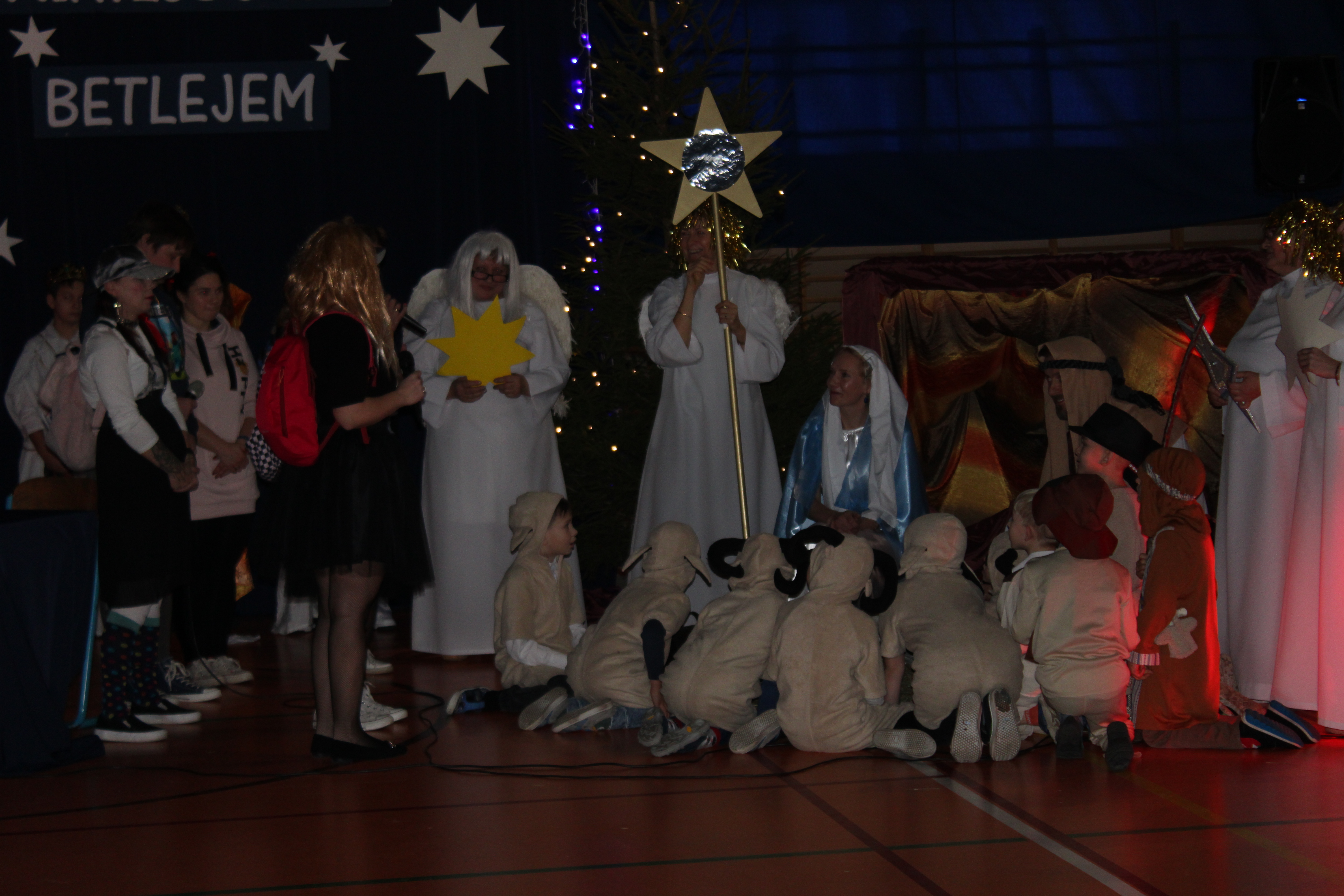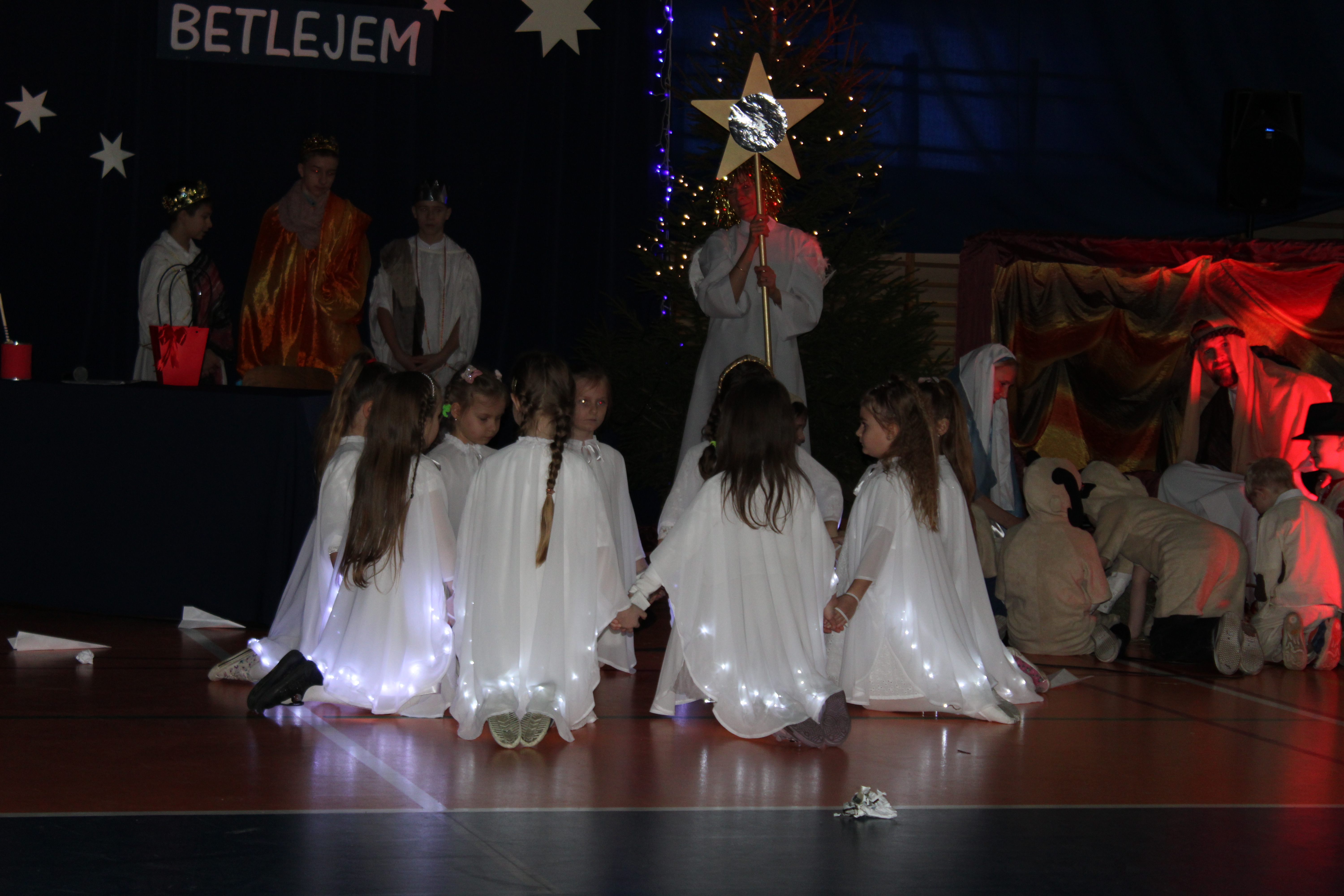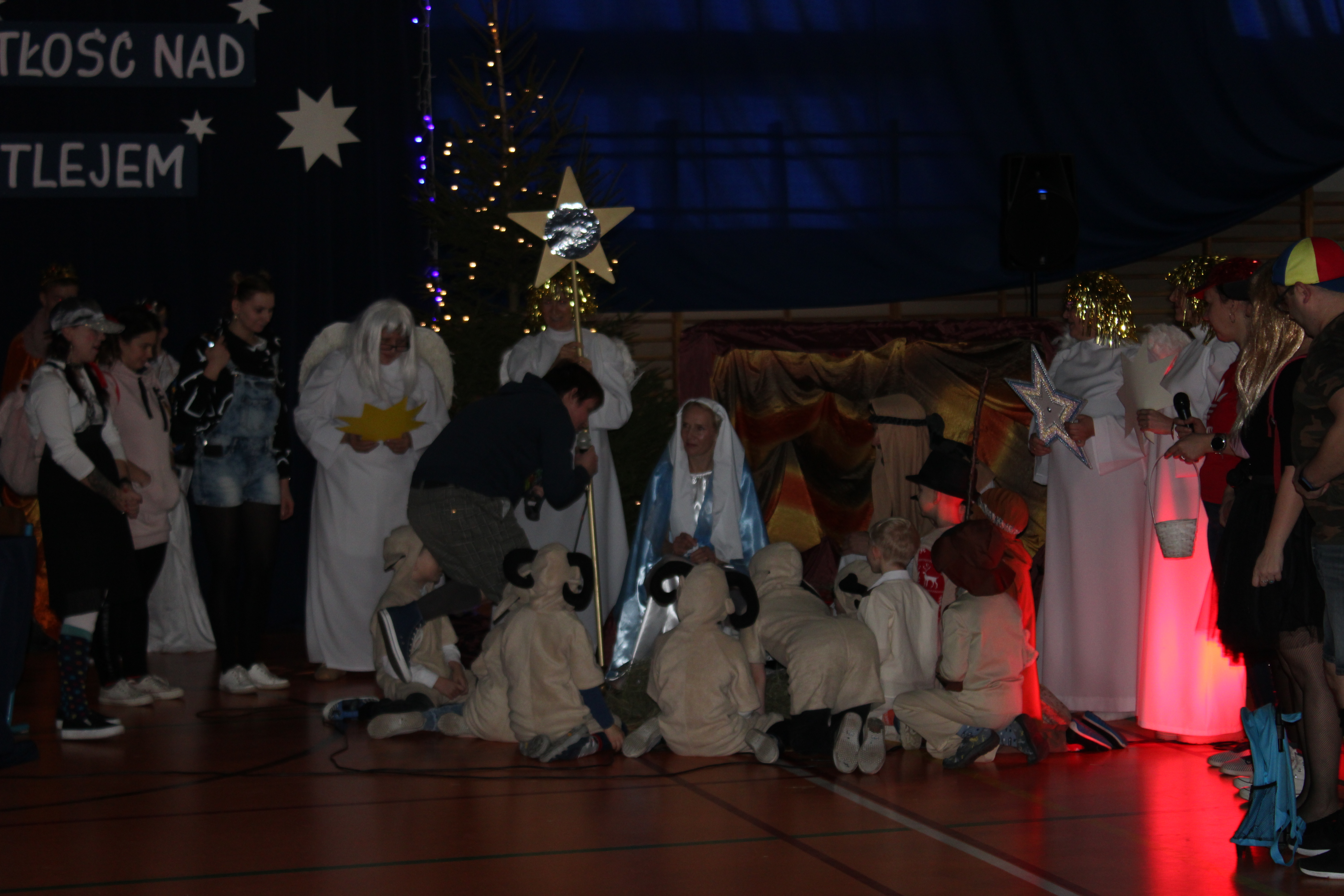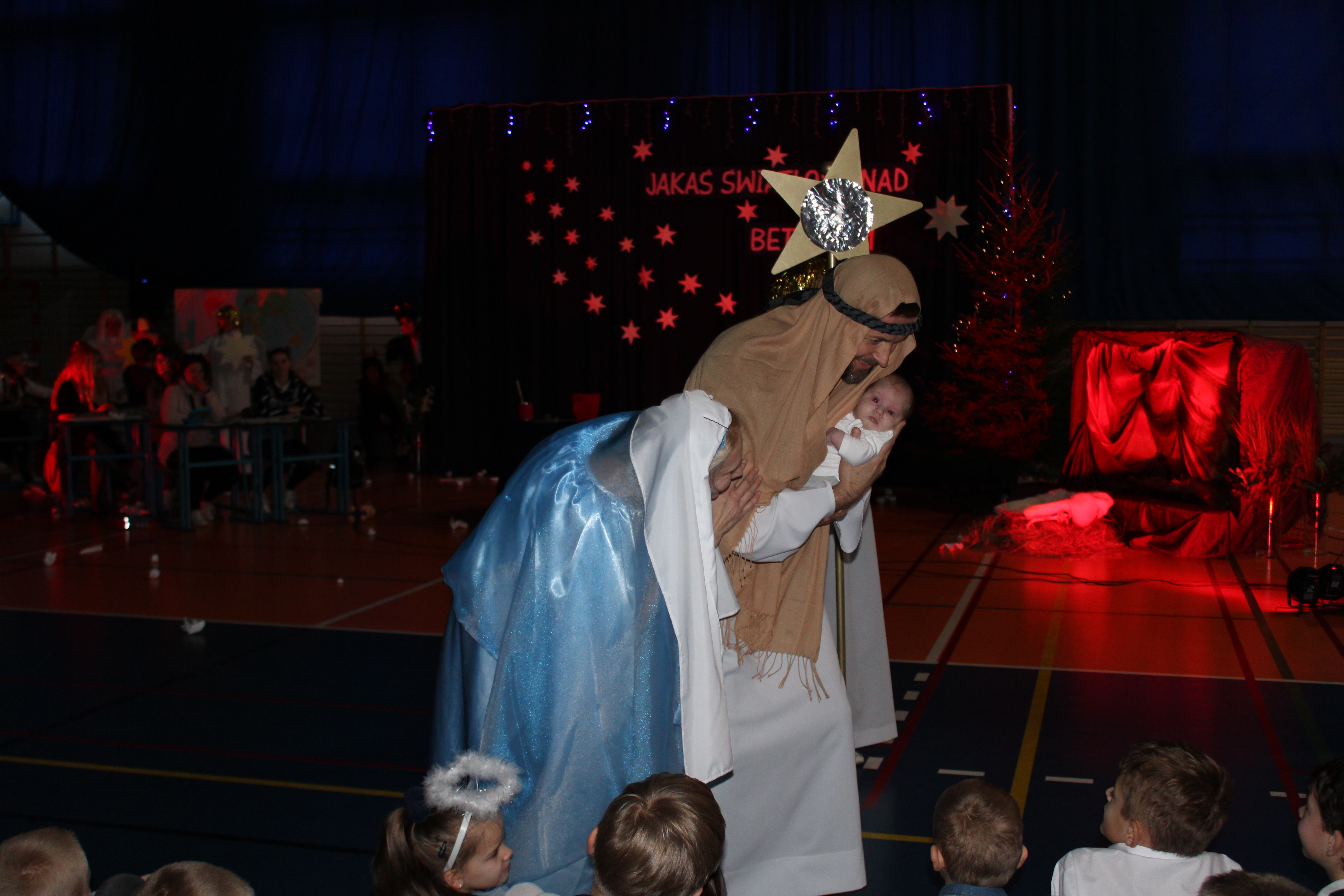 Zbliżające się święta Bożego Narodzenia to czas wyczekiwany szczególnie przez dzieci, ale także przez dorosłych. Magię świąt w naszej szkole można było poczuć w miniony czwartek, który był jednocześnie ostatnim dniem nauki w bieżącym roku. Jasełka to widowisko o Bożym Narodzeniu, które od wieków wpisane są w polską tradycję oraz corocznie wystawiane w naszej szkole. Przedstawienie jasełkowe pt. „Jakaś światłość nad Betlejem” miało przybliżyć uczniom okoliczności narodzin Pana Jezusa. Scenariusz jasełek zawierał najważniejsze wydarzenia towarzyszące narodzinom Jezusa. Główni bohaterowie jasełek – niesforna klasa, dostąpiła zaszczytu obecności przy narodzeniu małego Jezusa. Droga to tego spotkania usłana była różnymi przeciwnościami – podstępne diabły chciały namówić dzieci na naukę w piekielnej klasie! Jednak opieka cudownych Aniołów, pozwoliła dzieciom uwolnić się spod wpływu diabłów i w sposób godny, doniosły przeżyć czas Bożego Narodzenia. W jasełkach bożonarodzeniowych udział wzięli rodzice naszych uczniów: panie Iwona Piotrowicz, Sylwia Konczyńska, Bogumiła Hejdysz i pan Dariusz Drygas. Nauczycielska kadra występująca w tym dniu to: Alina Stefańska, Renata Bartoś, Małgorzata Hajdziony, Anna Sztok, Anna Szymankiewicz, Mariola Janiak, Violeta Rostalska, Izabela Urbaniak, Małgorzata Palczewska, Daria Sobczak, Beata Lisiak, Katarzyna Zaworska, Karol Marciszewski i Sławomir Krawczyk. Piękne piosenki nawiązujące do dnia Bożego Narodzenia wykonały uczennice Sara Janoś i Małgorzata Pluta. Dziewczynki z oddziałów przedszkolnych zatańczyły przy żłóbku, przy którym czuwali pastuszkowie i owieczki. Trzej Królowie: Mateusz Wandelt, Kacper Gościaniak i Krystian Gwóźdź złożyli dary i pokłonili się Maleńkiemu – w tym roku nowonarodzonego Jezuska cudownie zagrała maleńka Zuzia. O oprawę muzyczną zadbał pan Łukasz Naczke, nad całością spektaklu czuwały panie: Marzena Klimek i Justyna Żurkiewicz. Szkolny zespół Mariposa wykonał układy taneczne do popularnych piosenek świątecznych.
