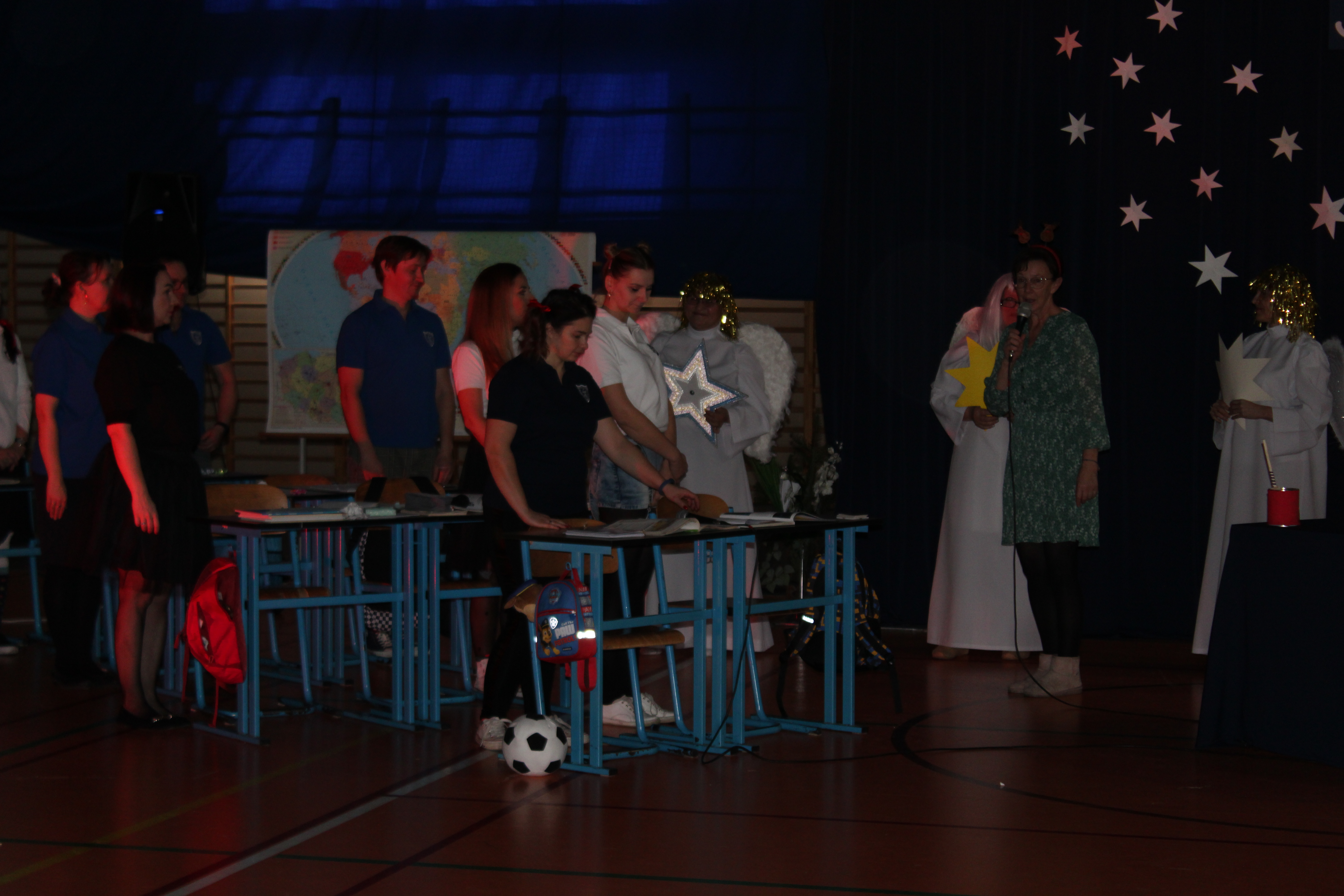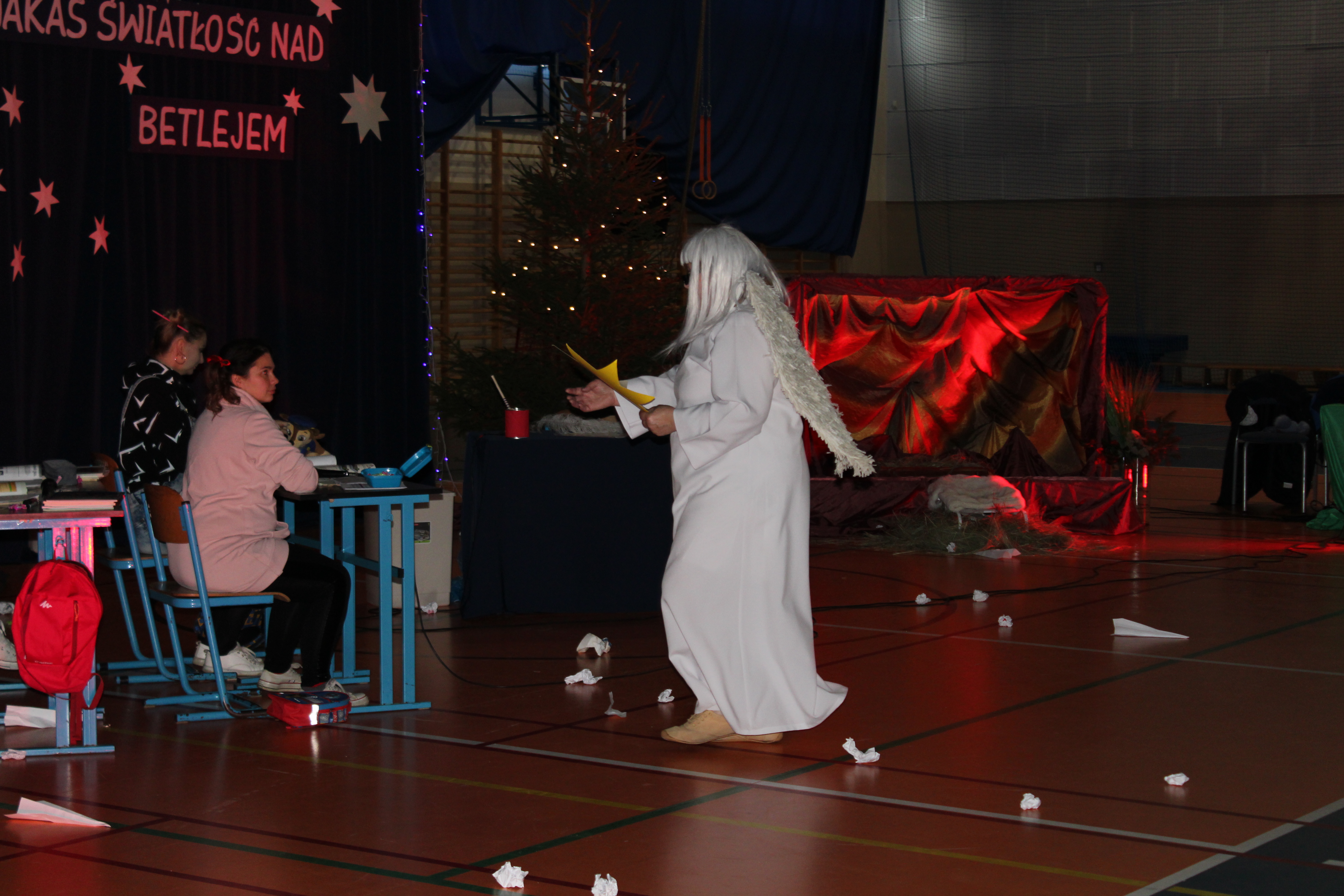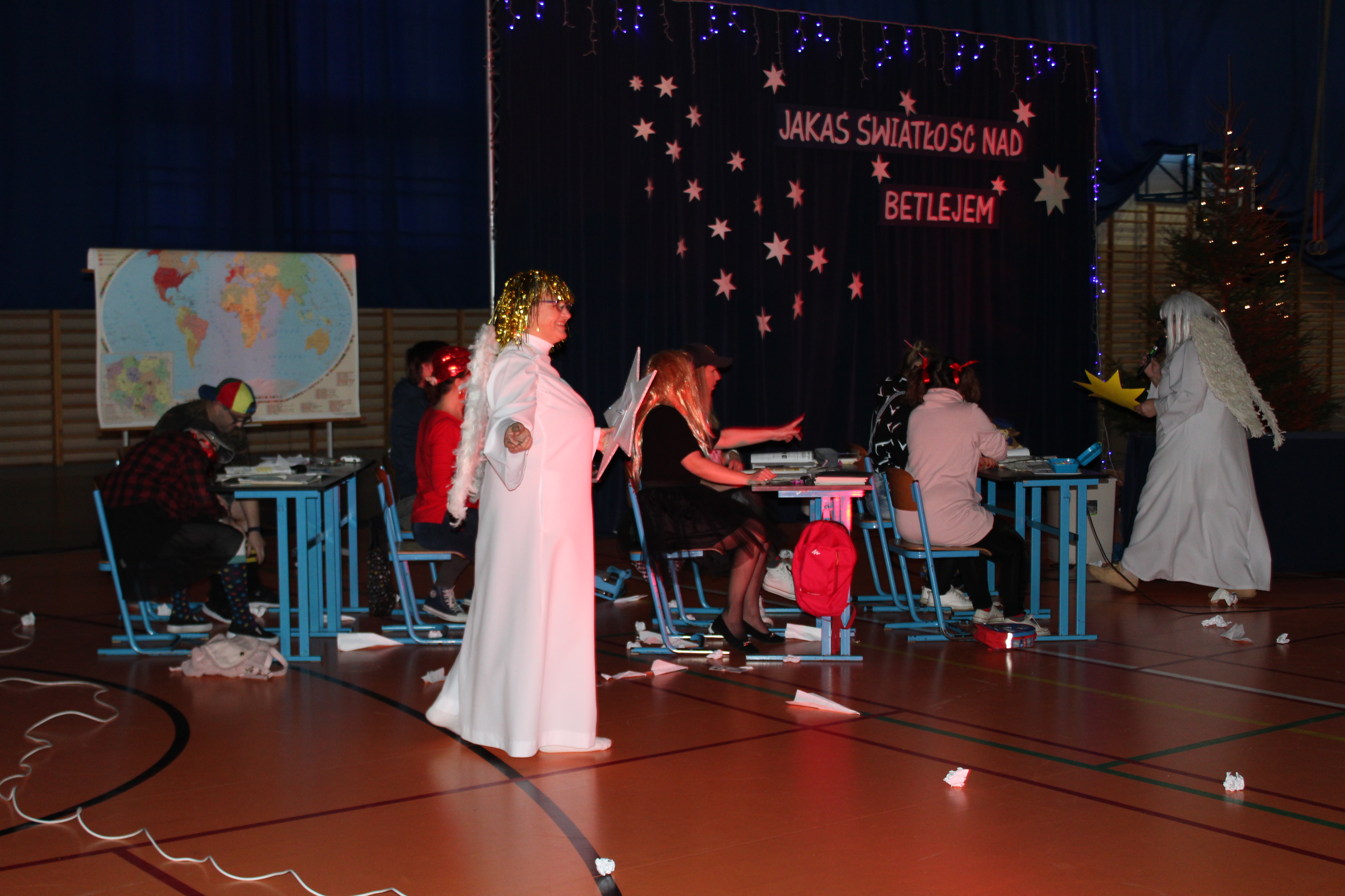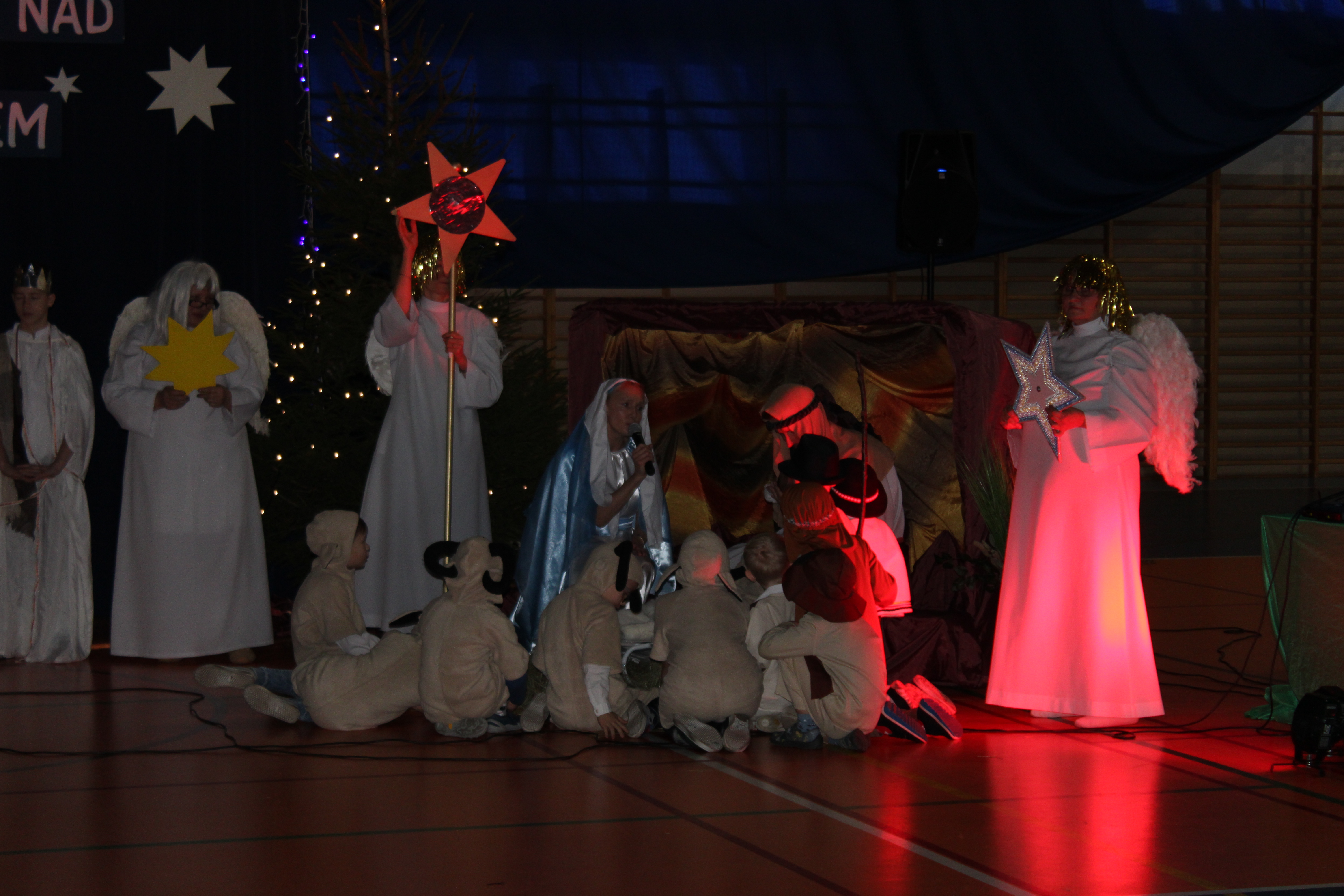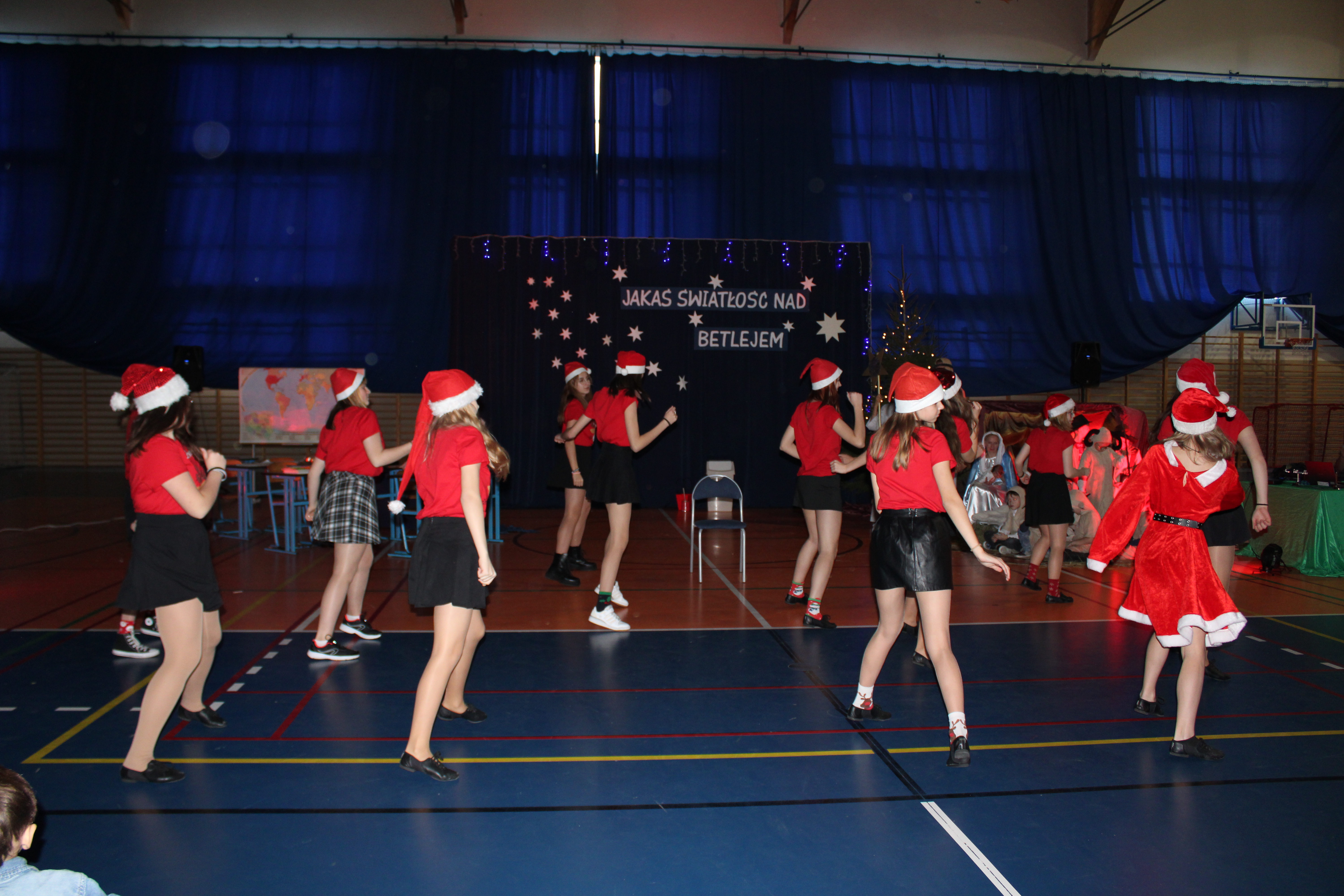 Zbliżające się święta Bożego Narodzenia to czas wyczekiwany szczególnie przez dzieci, ale także przez dorosłych. Magię świąt w naszej szkole można było poczuć w miniony czwartek, który był jednocześnie ostatnim dniem nauki w bieżącym roku. Jasełka to widowisko o Bożym Narodzeniu, które od wieków wpisane są w polską tradycję oraz corocznie wystawiane w naszej szkole. Przedstawienie jasełkowe pt. „Jakaś światłość nad Betlejem” miało przybliżyć uczniom okoliczności narodzin Pana Jezusa. Scenariusz jasełek zawierał najważniejsze wydarzenia towarzyszące narodzinom Jezusa. Główni bohaterowie jasełek – niesforna klasa, dostąpiła zaszczytu obecności przy narodzeniu małego Jezusa. Droga to tego spotkania usłana była różnymi przeciwnościami – podstępne diabły chciały namówić dzieci na naukę w piekielnej klasie! Jednak opieka cudownych Aniołów, pozwoliła dzieciom uwolnić się spod wpływu diabłów i w sposób godny, doniosły przeżyć czas Bożego Narodzenia. W jasełkach bożonarodzeniowych udział wzięli rodzice naszych uczniów: panie Iwona Piotrowicz, Sylwia Konczyńska, Bogumiła Hejdysz i pan Dariusz Drygas. Nauczycielska kadra występująca w tym dniu to: Alina Stefańska, Renata Bartoś, Małgorzata Hajdziony, Anna Sztok, Anna Szymankiewicz, Mariola Janiak, Violeta Rostalska, Izabela Urbaniak, Małgorzata Palczewska, Daria Sobczak, Beata Lisiak, Katarzyna Zaworska, Karol Marciszewski i Sławomir Krawczyk. Piękne piosenki nawiązujące do dnia Bożego Narodzenia wykonały uczennice Sara Janoś i Małgorzata Pluta. Dziewczynki z oddziałów przedszkolnych zatańczyły przy żłóbku, przy którym czuwali pastuszkowie i owieczki. Trzej Królowie: Mateusz Wandelt, Kacper Gościaniak i Krystian Gwóźdź złożyli dary i pokłonili się Maleńkiemu – w tym roku nowonarodzonego Jezuska cudownie zagrała maleńka Zuzia. O oprawę muzyczną zadbał pan Łukasz Naczke, nad całością spektaklu czuwały panie: Marzena Klimek i Justyna Żurkiewicz. Szkolny zespół Mariposa wykonał układy taneczne do popularnych piosenek świątecznych.