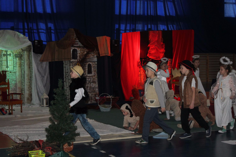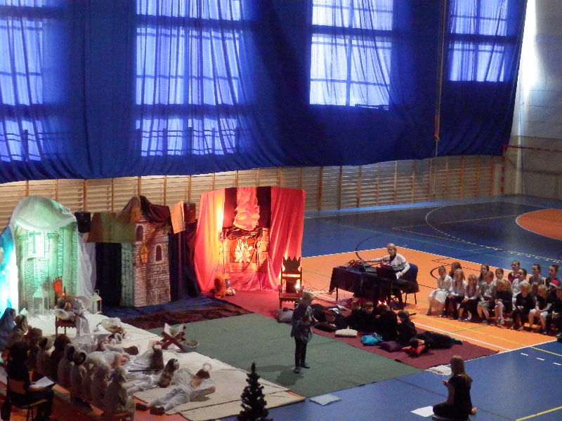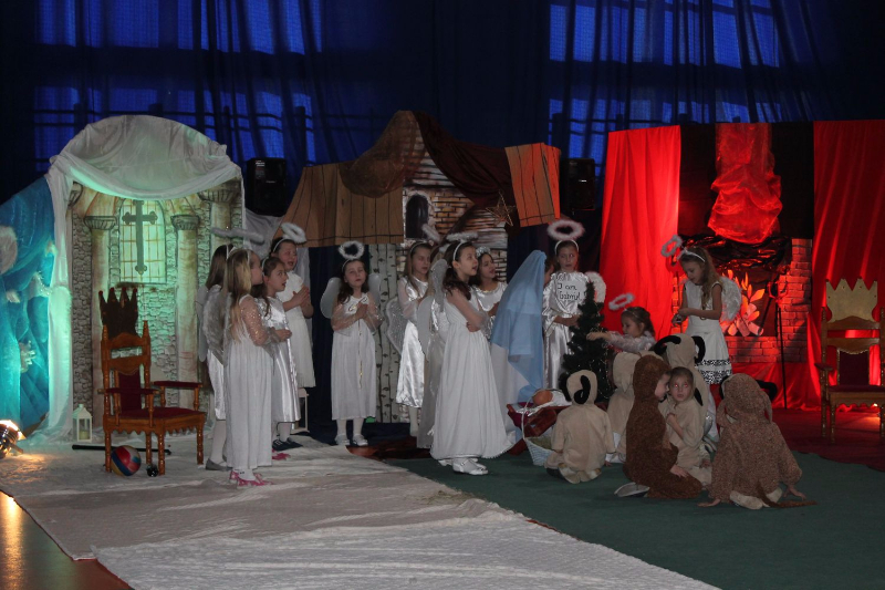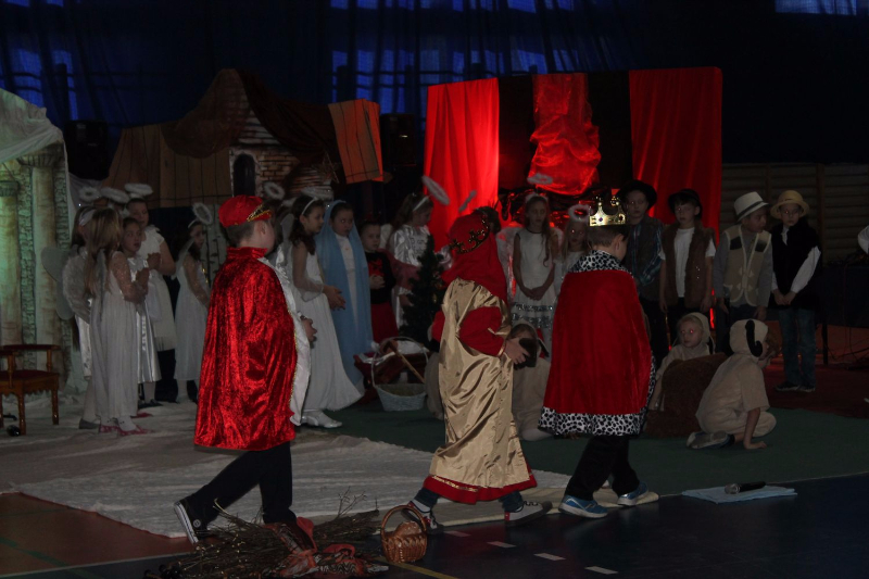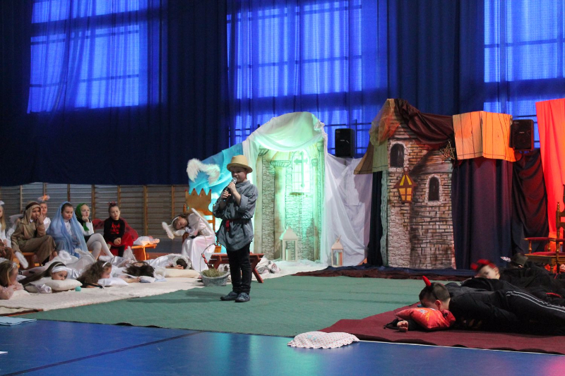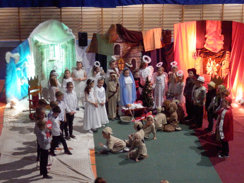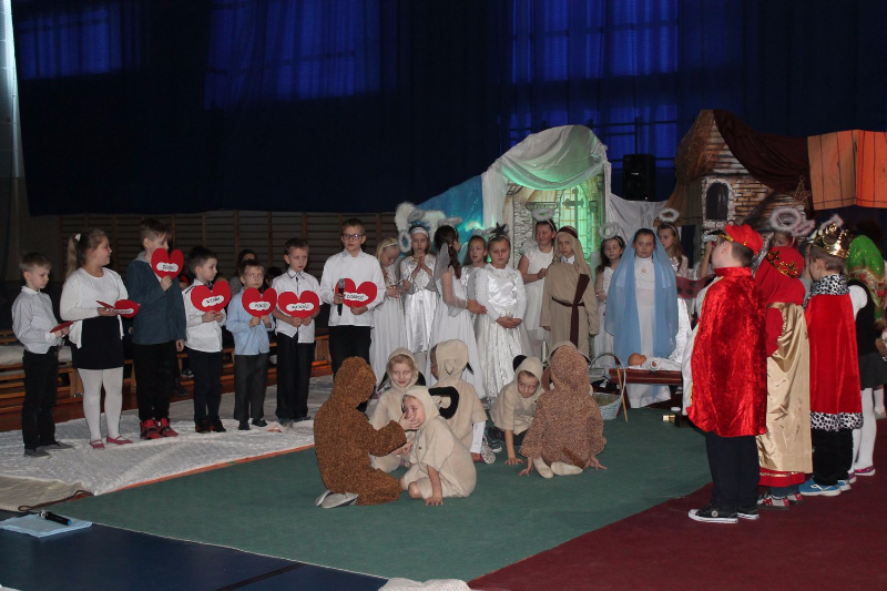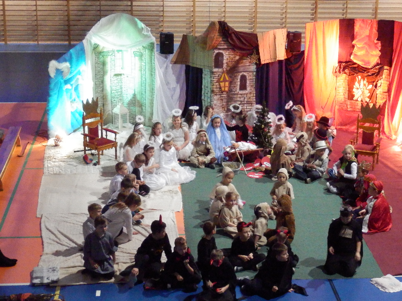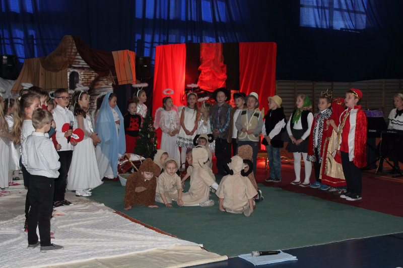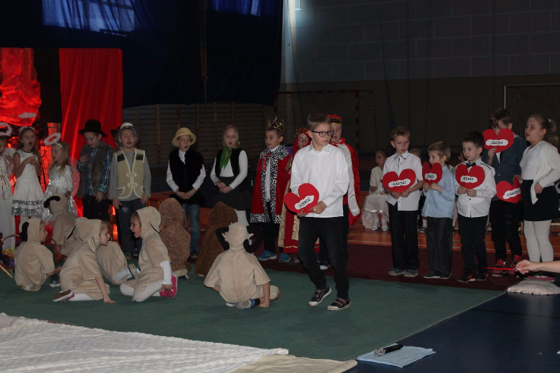 W przedświąteczny czwartek 22 grudnia 2016r. o godz. 10.00 cała społeczność szkolna wraz z dyrekcją, nauczycielami i rodzicami, zebrana w hali widowiskowo – sportowej, miała okazję przeżyć, jak co roku, tajemnicę Bożego Narodzenia, uczestnicząc w Jasełkach. Tegoroczne przedstawienie świąteczne nosiło tytuł „Jeden – zero dla Nieba”. Mali aktorzy z klas IId i IIe wspaniale wcielili się w role Świętej Rodziny, aniołów, diabełków, pasterzy, babci, biedroneczki, Trzech Króli oraz przedstawicieli dzieci. Z beztroską i radością wystąpiło też siedmioro dzieci z oddziału przedszkolnego w roli owieczek, koziołków i piesków. Głównym przesłaniem spektaklu było pragnienie, aby ludzie z wiarą i nadzieją przygotowali swoje serca na przyjście Syna Bożego na świat, by kierowali się dobrem, miłością, życzliwością oraz okazywali sobie miłosierdzie i pomoc. Pomocą w dobrym życiu ma służyć przekonanie, że dobro zawsze zwycięża zło. Nad całością występu dzieci czuwały panie Marzena Klimek i Alina Stefańska wraz z dziećmi z zespołu wokalnego. Wspaniałe dekoracje przygotowały panie Justyna Żurkiewicz i Dorota Gidaszewska – Burkietowicz. Dzięki pomocy rodziców dzieci wystąpiły w pięknych strojach. Jasełka będą powtórnie wystawione dla społeczności lokalnej dnia 6 stycznia 2017 r. o godz. 16.00, również w hali widowiskowo – sportowej.