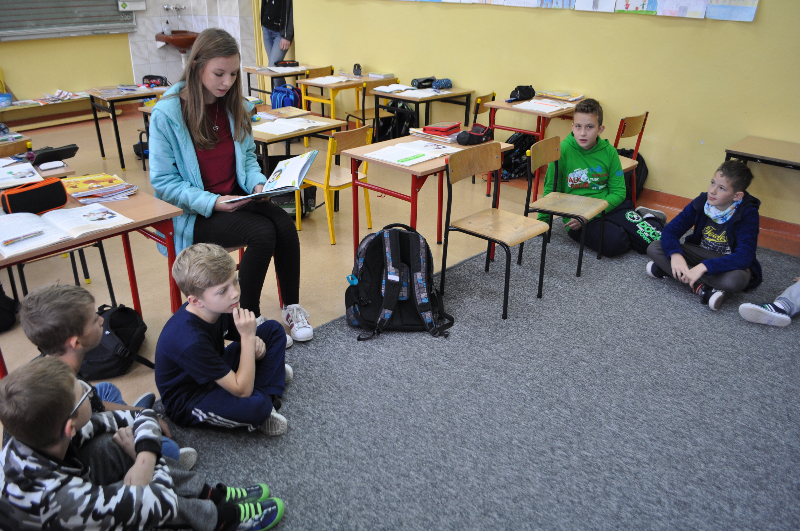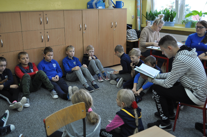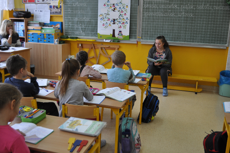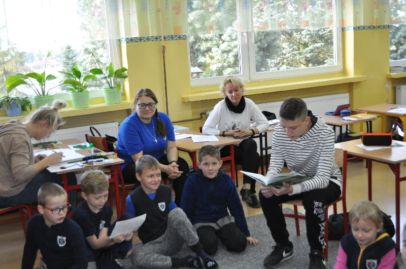 25 września  w naszej szkole rozpoczęliśmy akcję czytelniczą w bibliotece szkolnej z „Gangiem Słodziaków”. Celem konkursu było budowanie nawyku codziennego czytania wśród uczniów klas I – III. Czytanie pełni ważną rolę w rozwoju dziecka, ponieważ uczy samodzielnego myślenia, ćwiczy pamięć i koncentrację oraz pobudza wyobraźnię. We wrześniu   i październiku klasy: 2a, 2b, 2c, 3a oraz oddział przedszkolny wzięły  udział    w zajęciach bibliotecznych  z wykorzystaniem książki „Gang Słodziaków” autorstwa Renaty Piątkowskiej oraz maskotek przedstawiających zwierzęta żyjące w lesie. Obchody Dnia Głośnego Czytania objęły codziennie minimum 10 minutowe głośne czytanie ulubionych książek w domu pod opieką rodziców przez 21 dni. Codzienne głośne czytanie w domu (dowolnej książki) dokumentowane podpisem rodzica było nagradzane w szkole naklejką Słodziaka, umieszczaną w albumie ucznia „Czytaj codziennie”.  Podczas lekcji nauczyciele oraz gimnazjaliści: Kacper Zimniak , Alicja Janicka , Eliza Walensa z klasy IIId ,Dobrochna Spiżak , Arkadiusz Kożuch , Marcel Łyskawka, Julia Górska ,Wiktoria Franka ,Dominik Michalczak z klasy IIIc oraz Zuzanna Wyrwas i Patrycja Paszek z klasy IIIb, kreatywnie interpretowali tekst opowiadania, analizowali  ich treści, postawy bohaterów i przesłanie utworu. Uczniowie klas drugich  wzięli udział w konkursie związanym z „Gangiem Słodziaków” polegającym na narysowaniu  komiksu z dalszymi przygodami Słodziaków. Wszystkie prace wysłano na konkurs, w którym nagrodzonych zostanie  ogółem15 praca a ich autorzy otrzymają wyjątkowe gadżety ze Słodziakami oraz wygrają dofinansowanie dla swojej szkoły na zakup nowego księgozbioru do szkolnej biblioteki w wysokości po 3 000 złotych dla każdej placówki. Dodatkowo aż 500 klas otrzyma wyróżnienia i wyjątkowe nagrody dla uczniów: poduszki-Słodziaki.