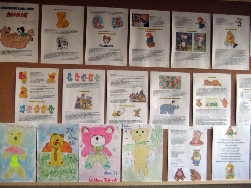 Biblioteka szkolna zaprasza dzieci do obejrzenia specjalnej wystawy poświęconej pluszowemu misiowi. Zwieńczeniem dnia pluszowego misia było wykonanie prac plastycznych, które można podziwiać na szkolnym korytarzu.