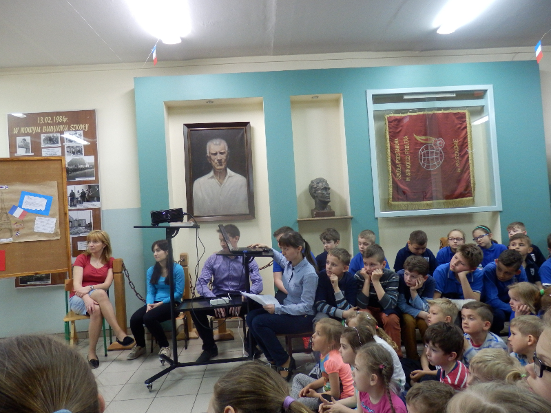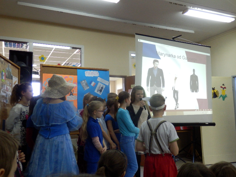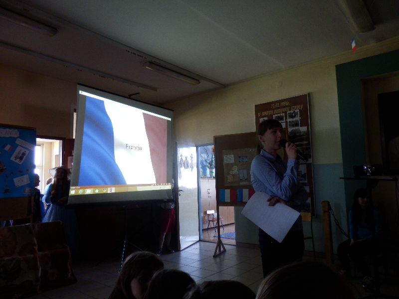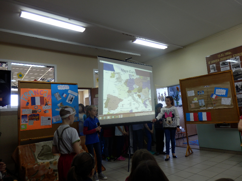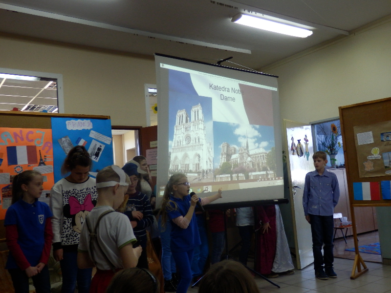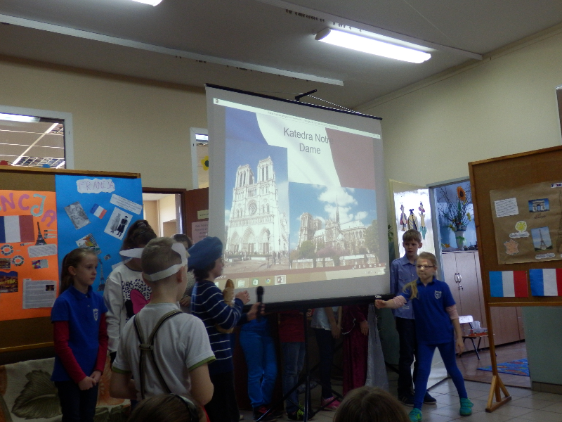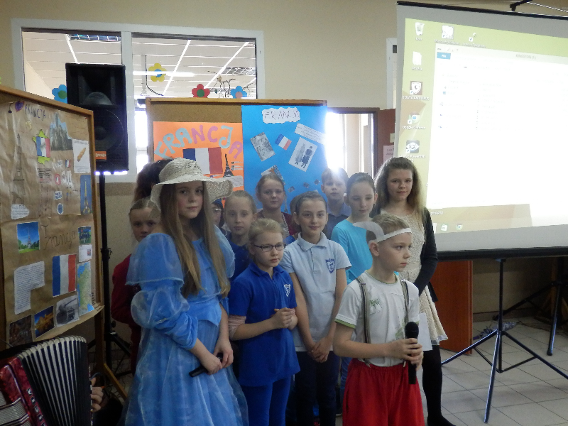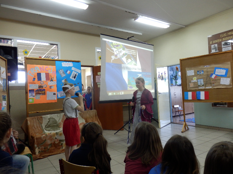 21.O4.2015 r. uczniowie klas 0-6 zostali zaproszeni do udziału w wycieczce po Francji. Spotkanie rozpoczęło się od krótkiego przedstawienia, przygotowanego przez uczniów z koła polonistycznego. Główny bohater – koziołek Matołek zabrał nas w sentymentalną podróż. Uczniowie przy dźwiękach melodii francuskich poznali usytuowanie Francji na mapie Europy oraz zabytki kraju. Nie zabrakło prezentacji sylwetek wybitnych Francuzów, którzy poprzez swoją bogatą osobowość i talent na stałe zapisali się na kartach różnych dziedzin kultury, m.in. malarze Manet, Gaugin i van Gogh, piosenkarka Edith Piaf czy aktorzy Louis de Funes oraz Brigitte Bardot. Uczniowie z koła polonistycznego posługiwali się zwrotami francuskimi, tym samym zachęcając wszystkich do nauki języka francuskiego.