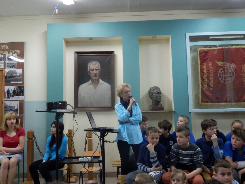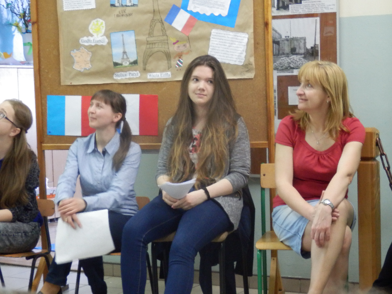 Ciekawym punktem programu – niespodzianką była wizyta w naszej szkole Wiki- Francuzki, która uczestniczyła w wymianie polsko- francuskiej. Dziewczyna opowiedziała nam o sobie, oczywiście posługując się piękną francuszczyzną . Jej wypowiedzi cieszyły się ogromnym zainteresowaniem ze strony naszych uczniów, którzy zadawali wiele pytań, dotyczących zarówno Wiki, jak również samej Francji. Bariera językowa został pokonana dzięki pani wicedyrektor Alicji Duczmal, która pełniła funkcję tłumacza, zachwycając nas znajomością języka francuskiego.