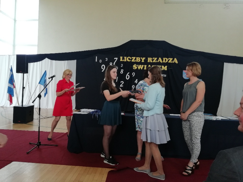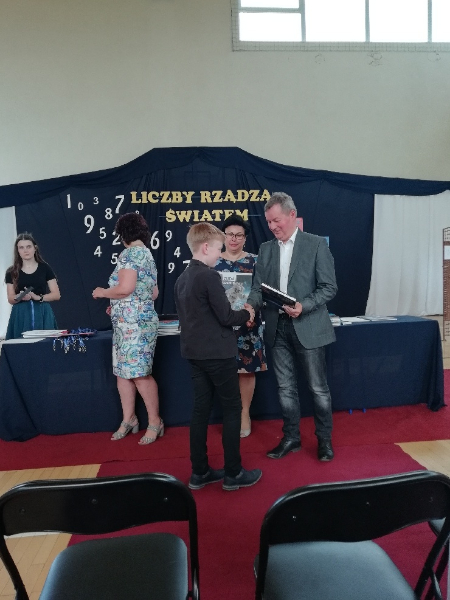 Pani radna powiatu ostrowskiego – pani Maria Tomaszewska oraz dyrektor Zespołu Szkół w Korytach – pani Barbara Hofman i wicedyrektor pani Daniela Moch przyznali tegoroczne tytuły Mistrza i Wicemistrza Matematyki oraz wręczyli uczniom nagrody rzeczowe i dyplomy.