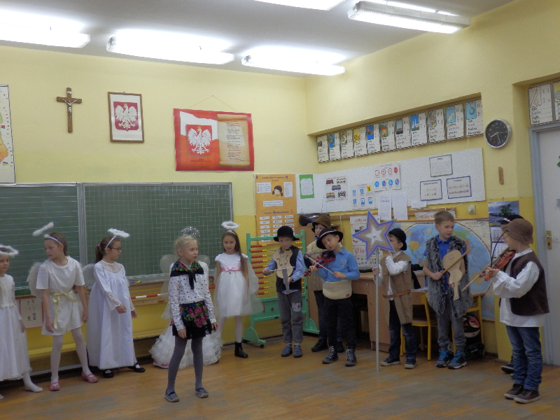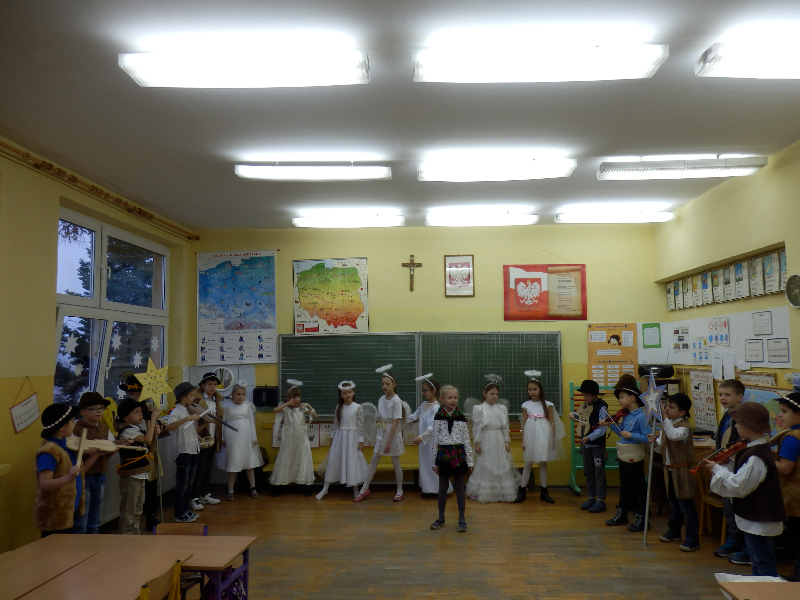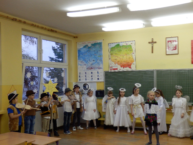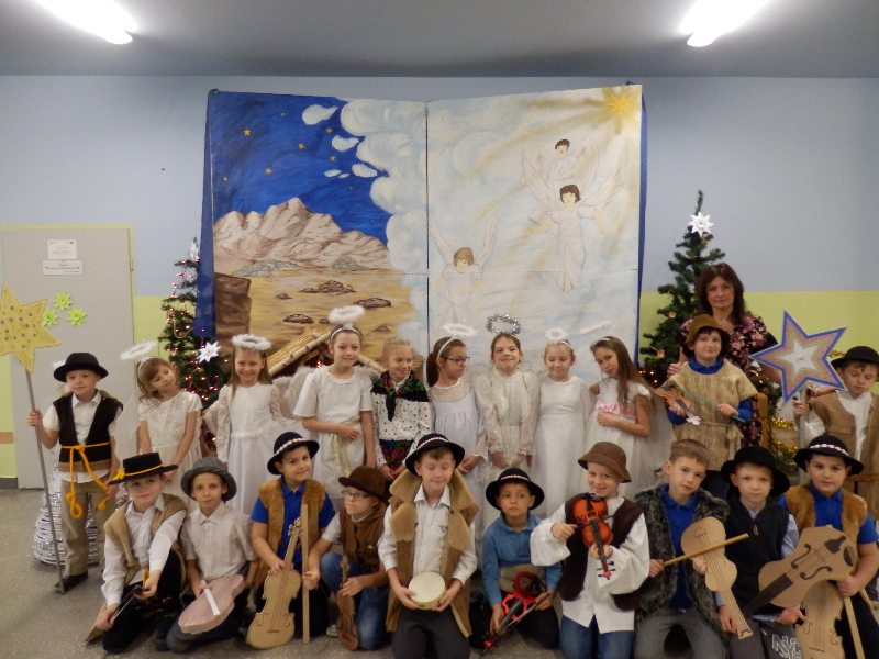 W szkole czuć już atmosferę świąt. Ustrojone korytarze, pachnące błyszczące choinki, tradycyjny żłóbek, a w klasach słychać śpiew kolęd i pastorałek… W dniu dzisiejszym uczniowie klasy 2 B przebrani w stroje aniołów, pastuszków i grajków zaśpiewali dla swoich rówieśników kolędę ”Oj, Maluśki” na tradycyjną góralską nutę. Dzieci przygotowała pani Iwona Bartczak, a stroje i instrumenty rodzice.