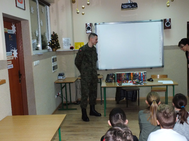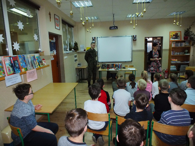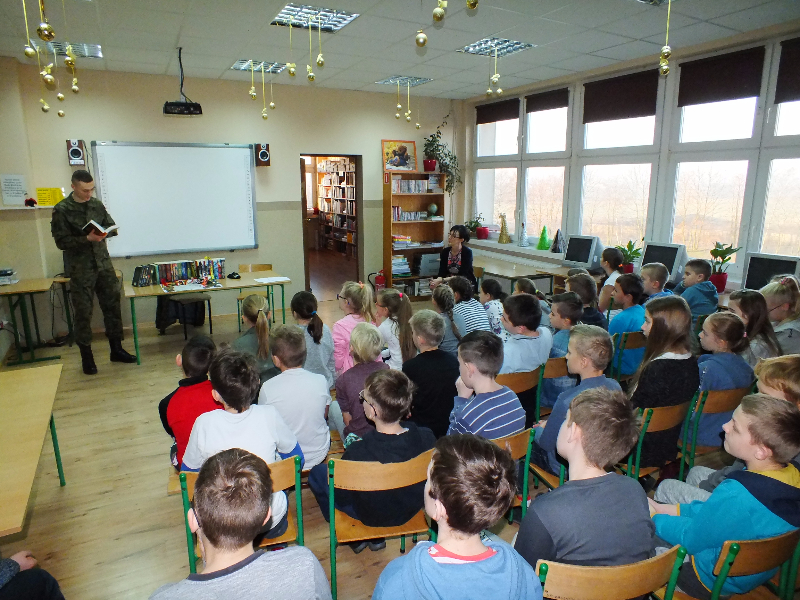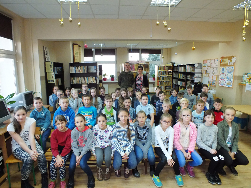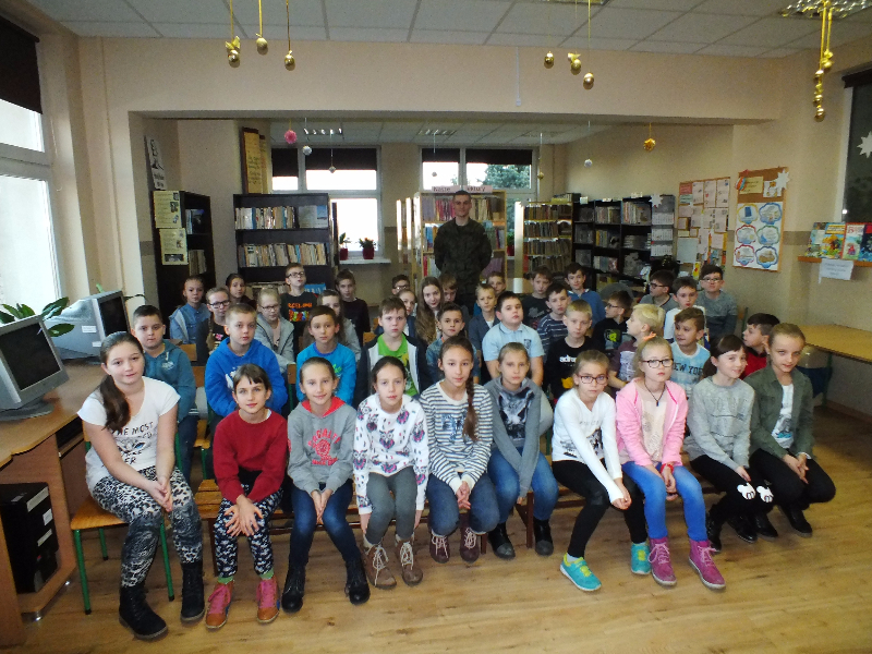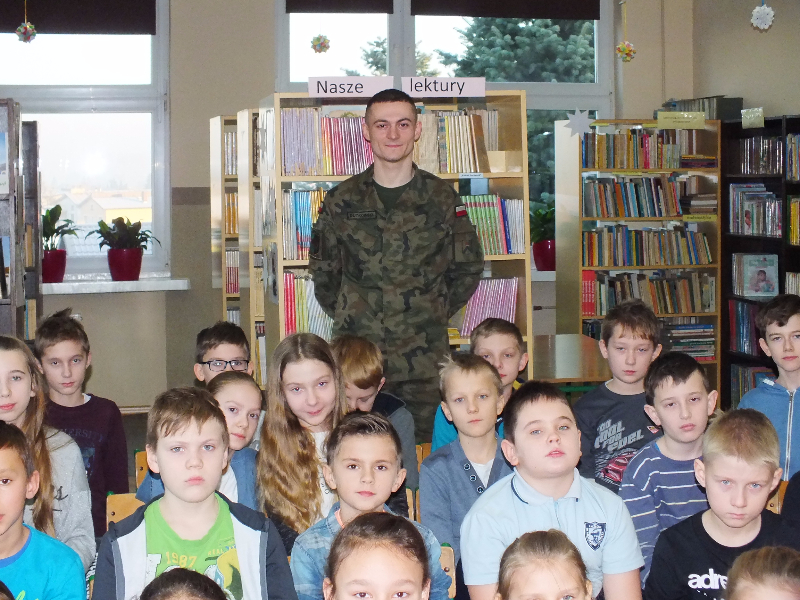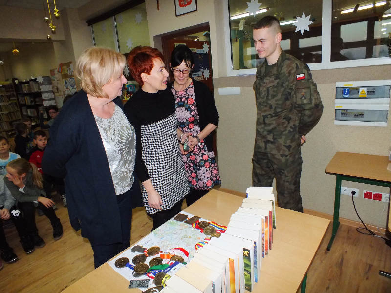 W ramach ogólnopolskiej akcji „Cała Polska czyta dzieciom” gościem biblioteki szkolnej był Mikołaj Dutkowski, absolwent naszej szkoły, obecnie żołnierz, członek kadry narodowej seniorów oraz kadry wojska polskiego. Swoją przygodę z biegami Mikołaj rozpoczął w 2001 r. - były to Biegi na Orientację. W naszej szkole, będąc uczniem klasy 6, ustanowił swój rekord życiowy – 3,15 sekund na 1 kilometr ! Od tego czasu Mikołaj tylko dopisuje sukcesy na sportowej liście: kadra wojewódzka młodzików, kadra narodowa juniorów, medale Mistrzostw Polski Juniorów (2 złote, 2 srebrne, 1 brązowy), reprezentant Polski w Mistrzostwach Europy Juniorów w Szwajcarii, reprezentant Polski w Mistrzostwach Świata Juniorów, reprezentant Polski w Mistrzostwach Europy Seniorów, starty w Pucharze Świata. Obecnie Mikołaj jest studentem I roku Akademii Wychowania Fizycznego we Wrocławiu i Żołnierzem 4 Zielonogórskiego Pułku Przeciwlotniczego w Czewieńsku/Lesznie. Przygotowuje się do udziału w Mistrzostwach Świata Wojska, które odbędą się w 2017r. w Finlandii, do cywilnych Mistrzostw Świata, które odbędą się w 2017r. w Estonii i do eliminacji w zawodach The World GAMES. Na spotkanie w bibliotece zaproszono sportowców naszej szkoły, czyli uczniów klas sportowych 4b i 5b. Zaproszony gość przyniósł ze sobą medale, mapę z biegów na orientację i ulubione, po wielokroć czytane, książki J. K. Rowling „Harry Potter”. W trakcie spotkania opowiadał o swojej pasji do biegania, o codziennych treningów, o dumie, kiedy biega się w koszulce z biało – czerwonym orłem na piersiach, odpowiadał też na pytania uczniów. Na zakończenie wizyty w bibliotece głośno przeczytał fragment książki „Harry Potter i insygnia śmierci”. Naszemu gościowi dziękujemy za ciekawą lekcję, za udzielone rady i życzymy wielu sportowych sukcesów. Trzymamy kciuki za Mikołaja w myśl hasła z jego bloga „Wysiłek sprzyja zwycięstwu, zwycięstwo kocha przygotowania”.