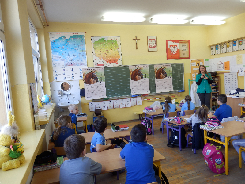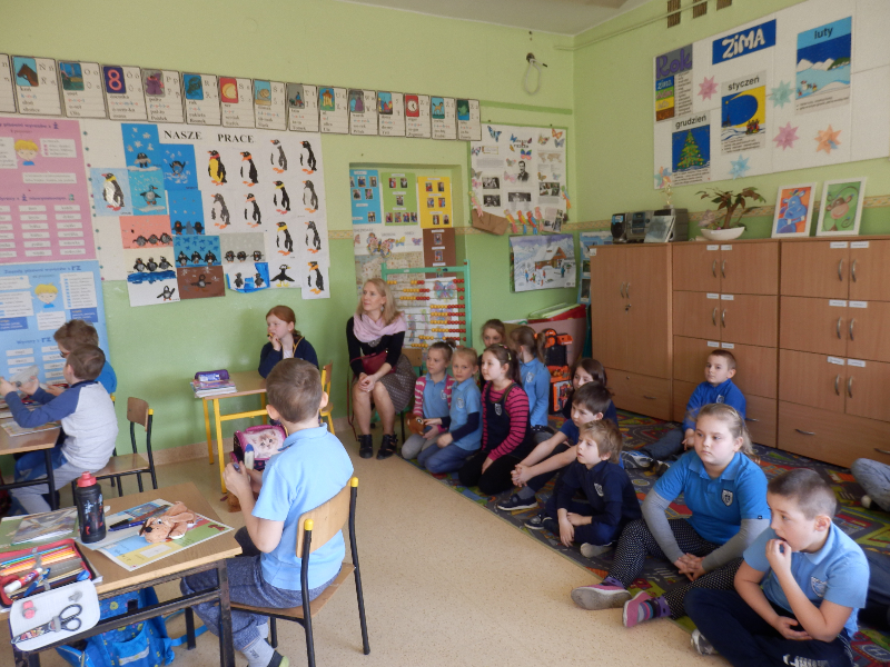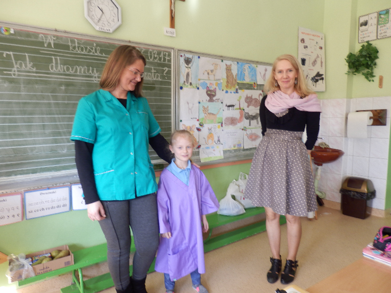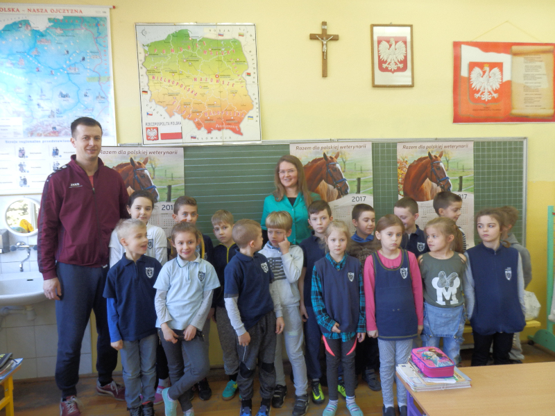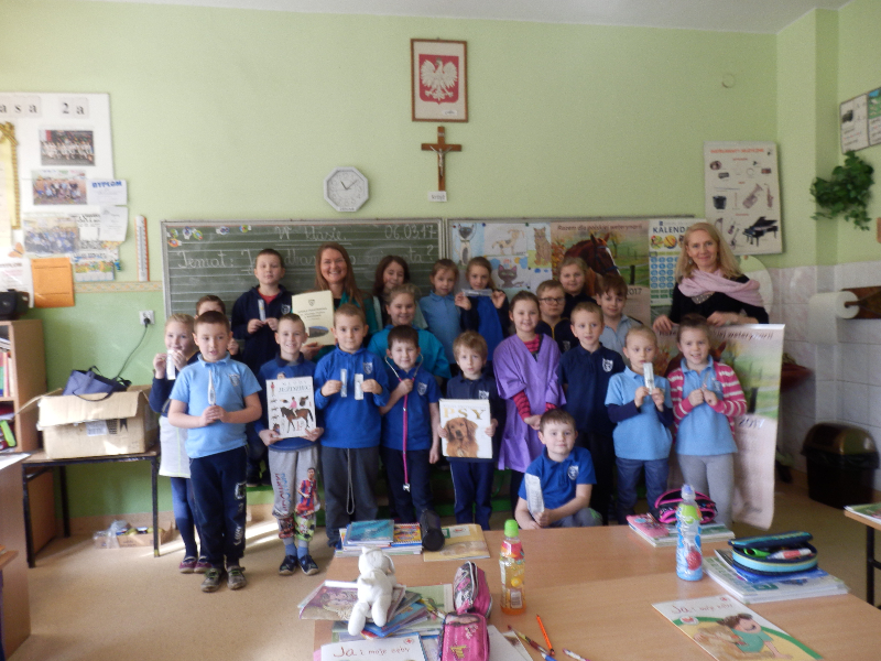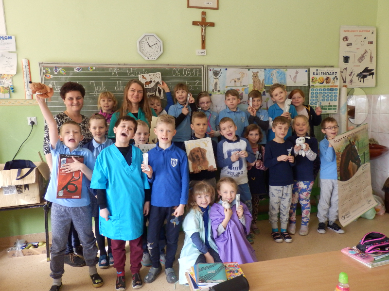 W poniedziałek 6 marca 2017r. uczniowie klas II a, b, c, d, e uczestniczyli w spotkaniu z technikiem weterynarii, panią Anną Płóciennik. Podczas  rozmowy z dziećmi pani Ania opowiedziała o pracy weterynarzy i wizytach w lecznicy dla zwierząt oraz przypomniała o konieczności właściwej opieki nad zwierzętami. Dzieci miały okazję wziąć do rąk i obejrzeć niektóre z narzędzi weterynaryjnych. Następnie pani technik odpowiedziała na wiele pytań, które zadały dzieci, zaciekawione tą tematyką. Uczniowie otrzymali baloniki z logo lecznicy oraz kolorowanki przedstawiające różne zwierzęta z gospodarstwa domowego.