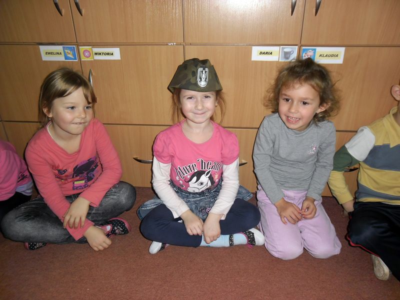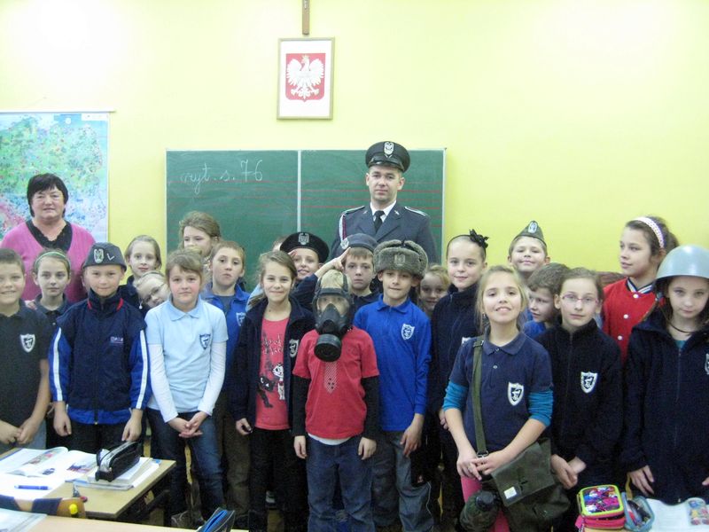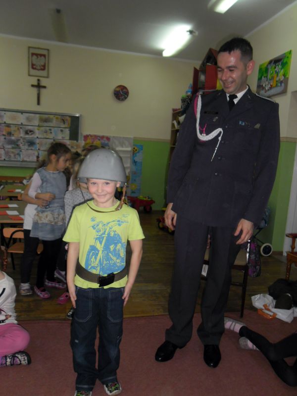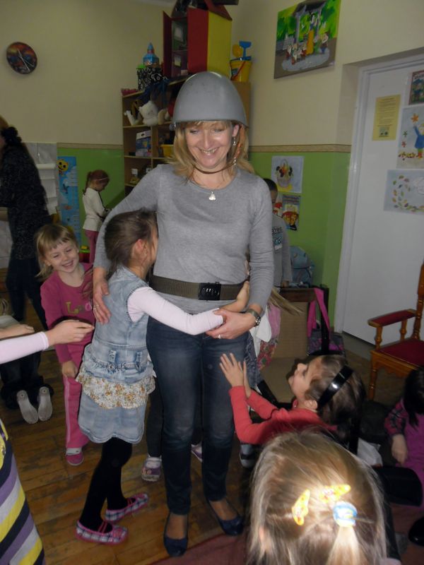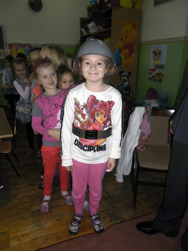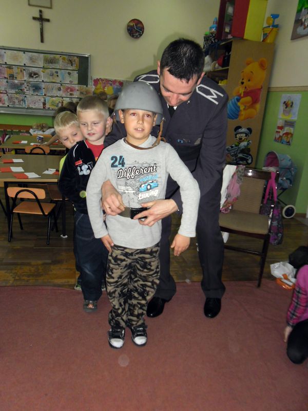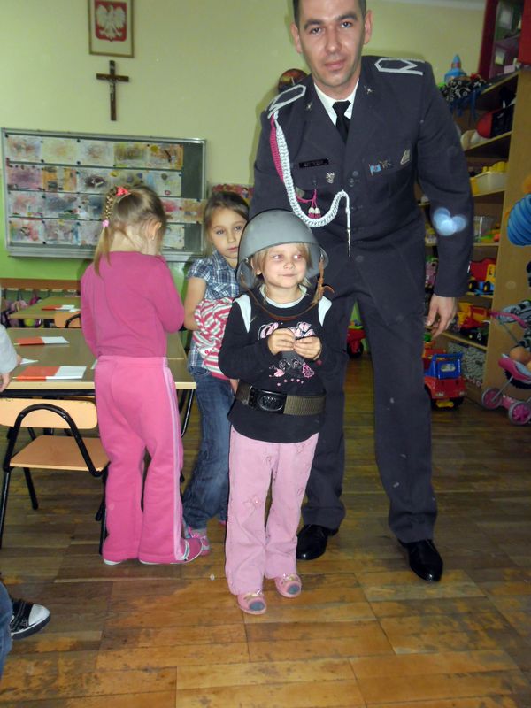 W piątek 08.11. 2013r. z okazji Narodowego Święta Niepodległości zaprosiliśmy do przedszkola pana Rafała Szczęsnego, sierżanta wojsk lotniczych w Poznaniu, ojca jednej z dziewczynek z oddziału I. Pan Rafał opowiedział dzieciom, czym zajmują się żołnierze, jak trudna i ważna jest ich praca dla naszej ojczyzny. Pokazał też dzieciom różne elementy umundurowania: czapki, berety, hełm i pas. Przedszkolaki z wielkim zaciekawieniem oglądały żołnierską menażkę i sztućce oraz maskę przeciwgazową. Chętnie przymierzały wojskowe nakrycia głowy. Rozmawiały też z panem sierżantem o wojskowych pojazdach i samolotach. Żołnierska wizyta była bardzo udana i ciekawa. Po spotkaniu z przedszkolakami Pan Rafał odwiedził też uczniów z klasy IIa i IIIa, by również starszym dzieciom opowiedzieć o wojsku i zachęcić do rozwijania postaw patriotycznych.