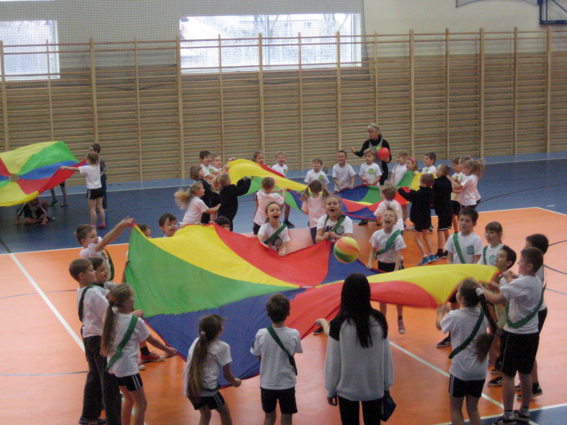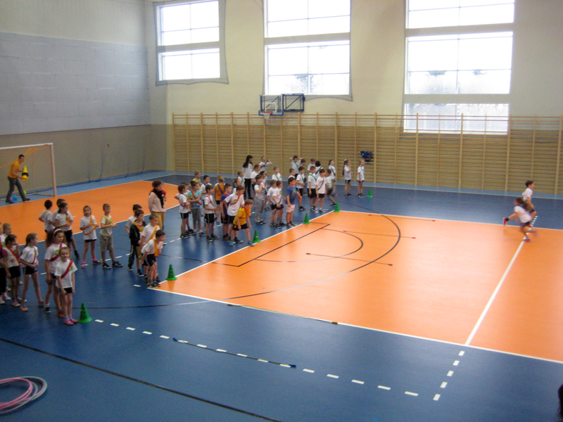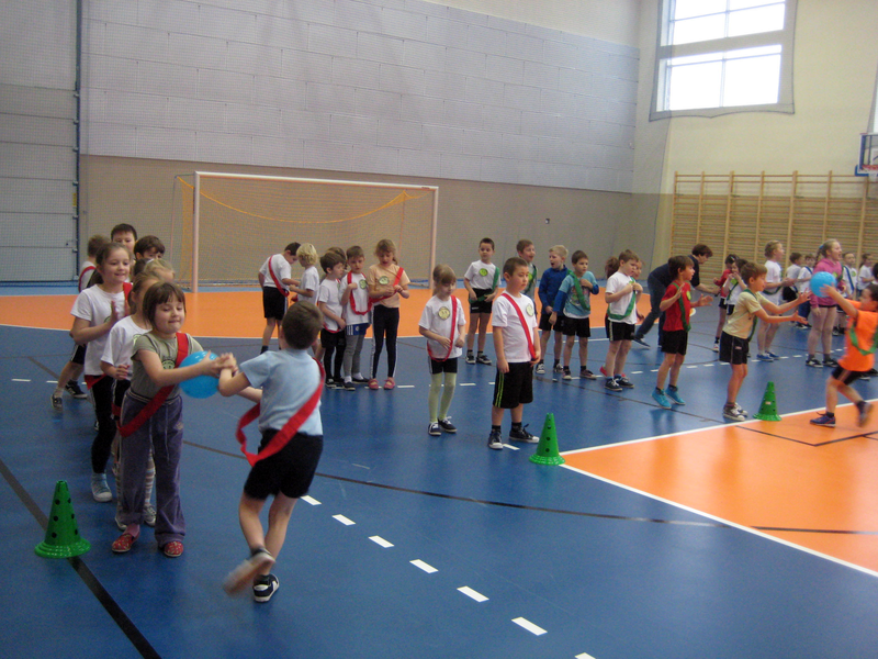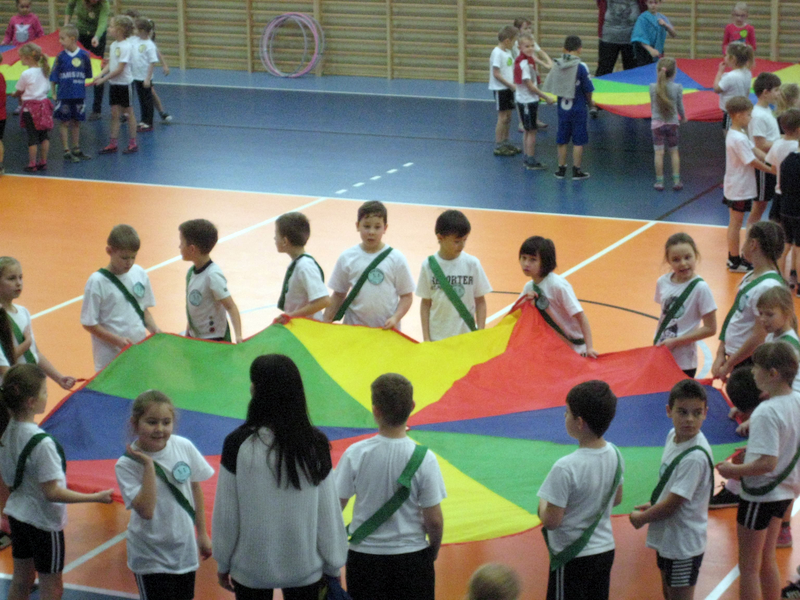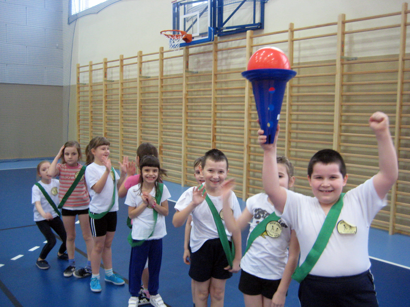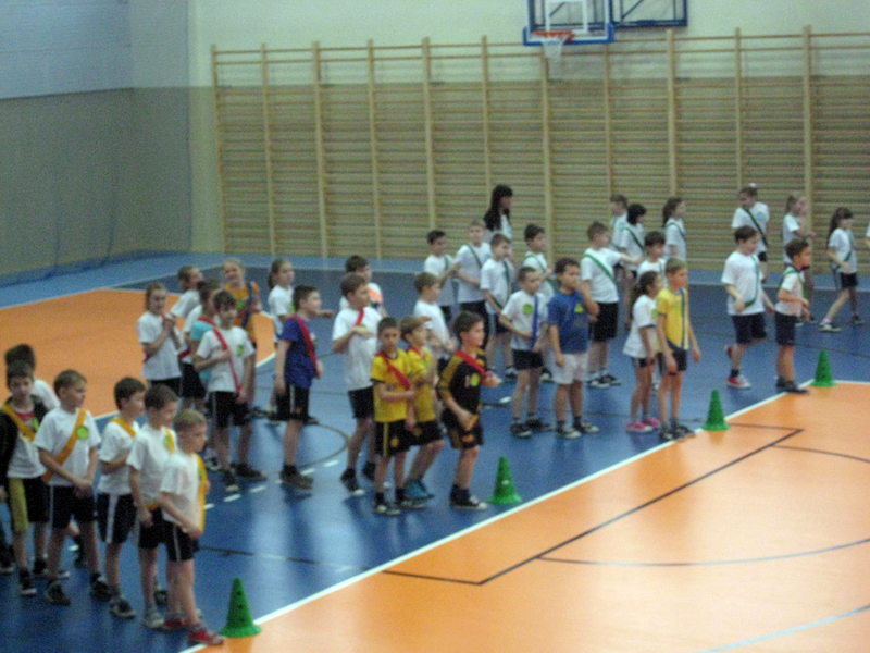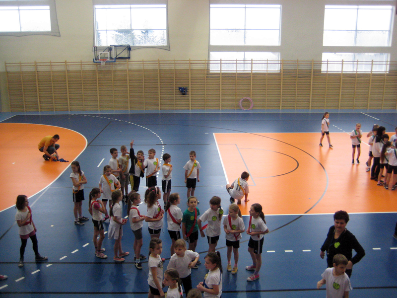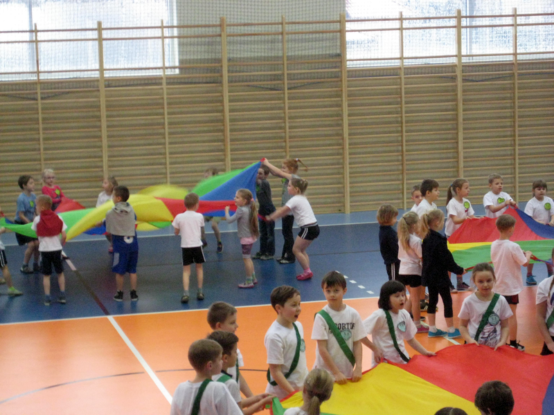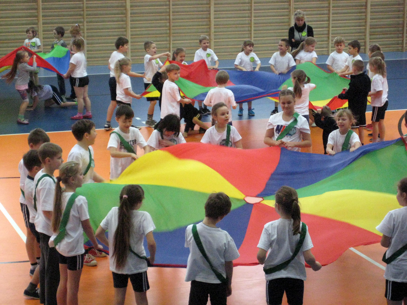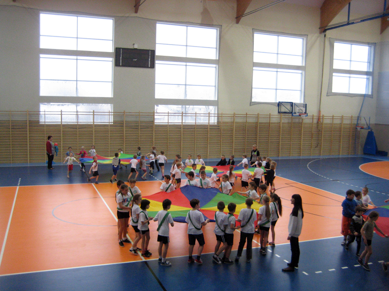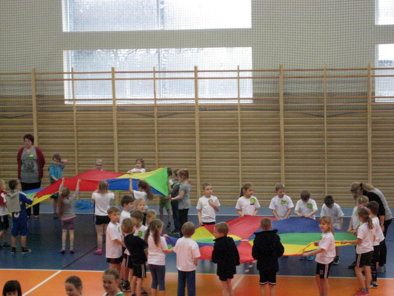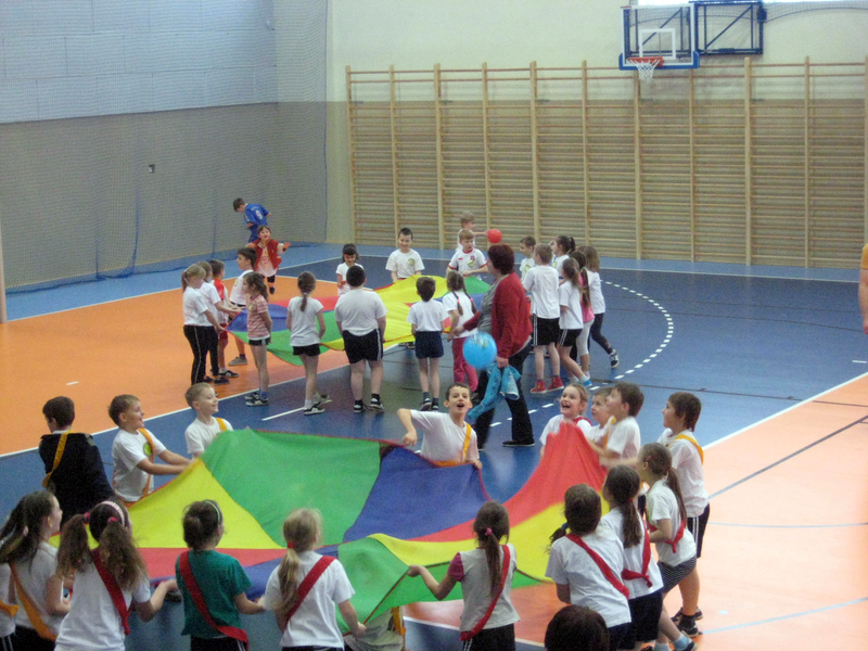 Uroczyste otwarcie hali sportowo – widowiskowej odbyło się na początku stycznia, teraz na prośbę pani dyrektor Aleksandry Krawczyk zorganizowano sportową olimpiadę dla najmłodszych uczniów naszej szkoły.  Ten dzień był wyjątkowy. Wszystkie klasy i dzieci przedszkolne rywalizowały ze sobą w różnych dyscyplinach: zawody z piłką, obręczą, z woreczkami, różne zabawy i gry zespołowe, zabawy z chustą Klanza.