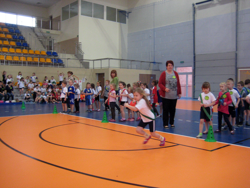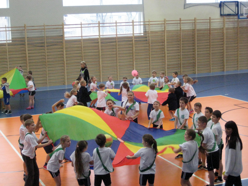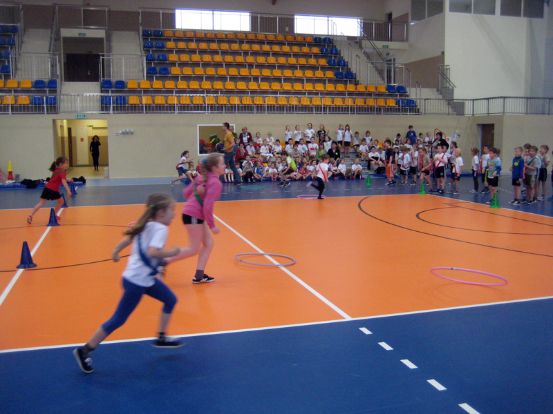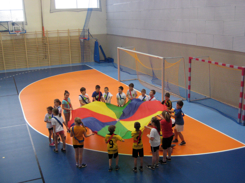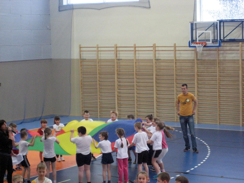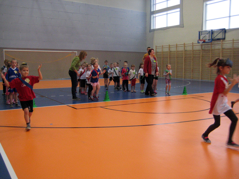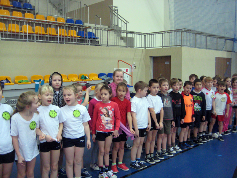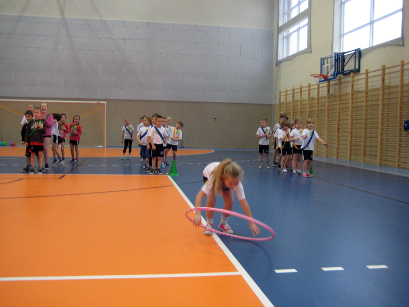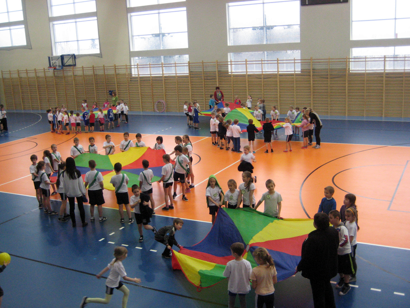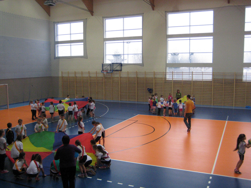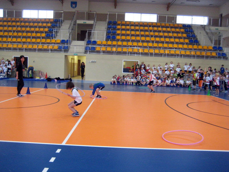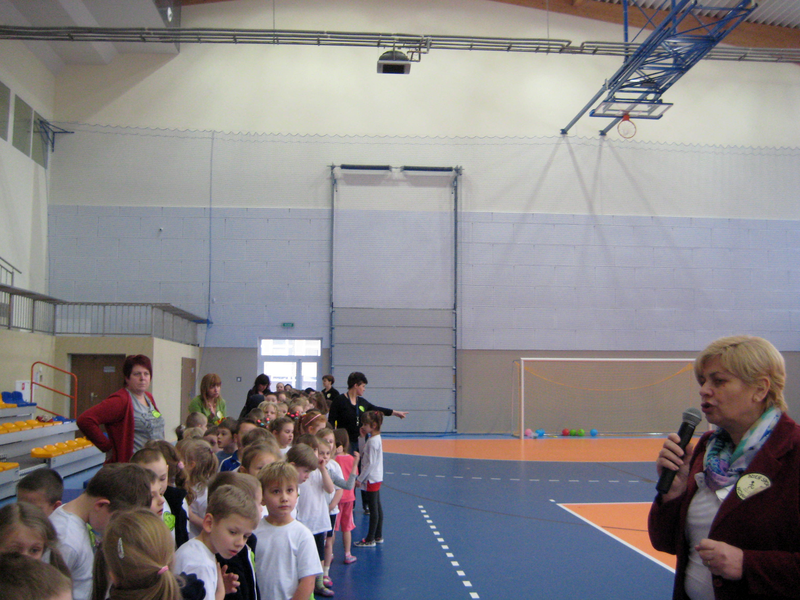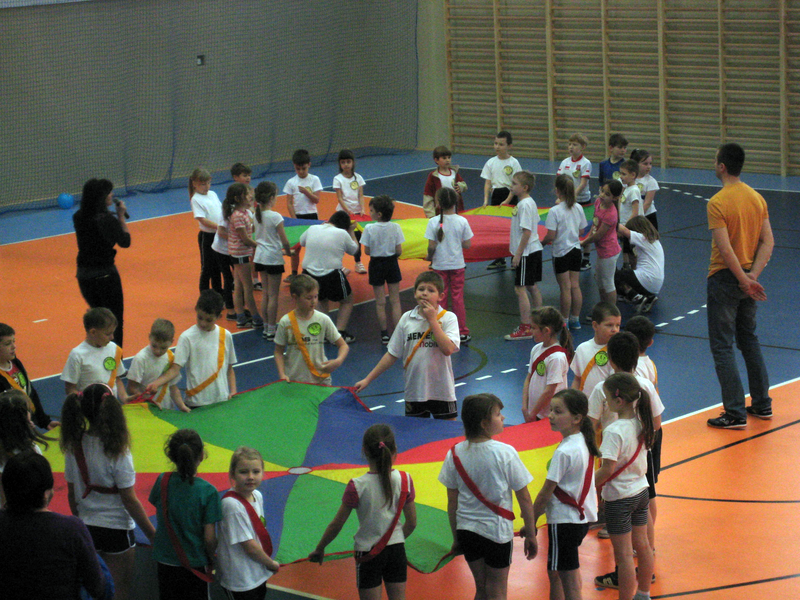 Uroczyste otwarcie hali sportowo – widowiskowej odbyło się na początku stycznia, teraz na prośbę pani dyrektor Aleksandry Krawczyk zorganizowano sportową olimpiadę dla najmłodszych uczniów naszej szkoły.  Ten dzień był wyjątkowy. Wszystkie klasy i dzieci przedszkolne rywalizowały ze sobą w różnych dyscyplinach: zawody z piłką, obręczą, z woreczkami, różne zabawy i gry zespołowe, zabawy z chustą Klanza.
