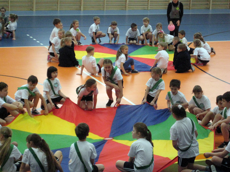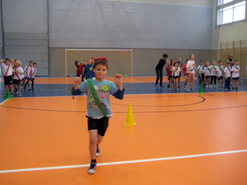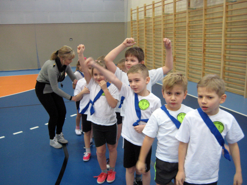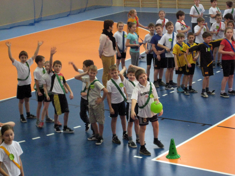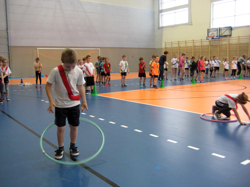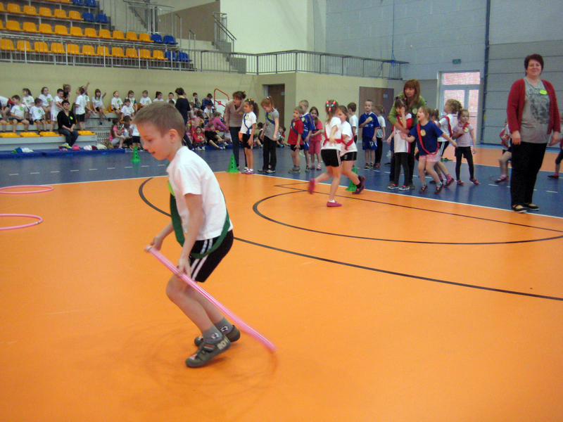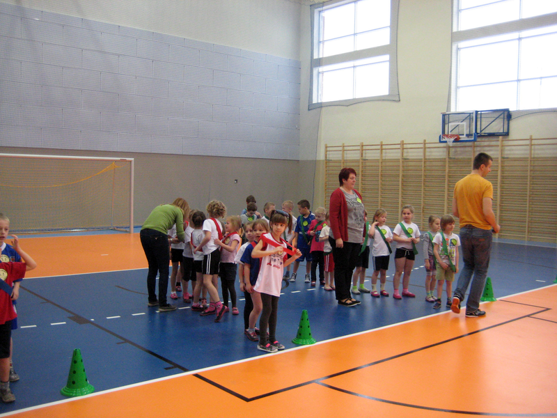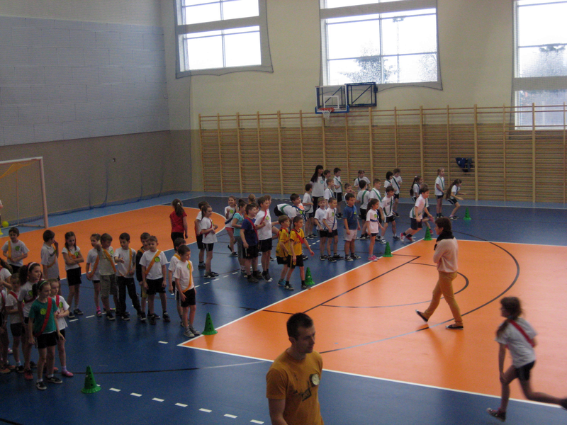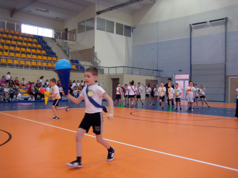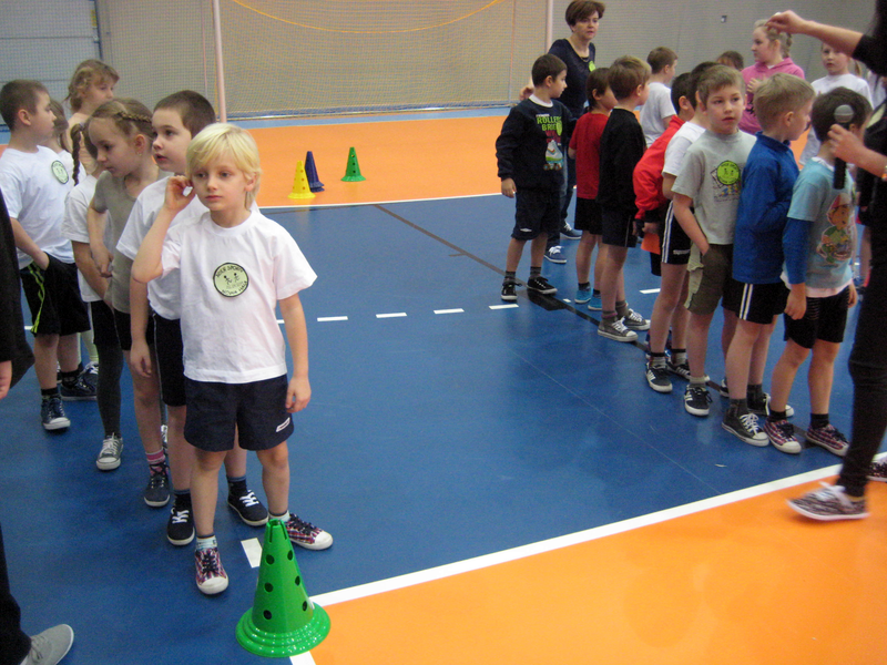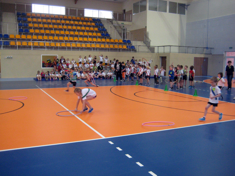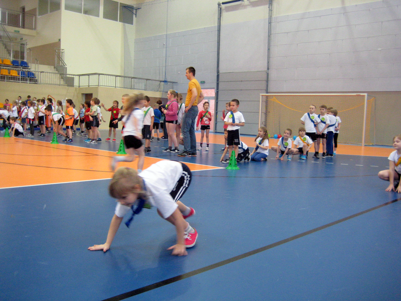 Uroczyste otwarcie hali sportowo – widowiskowej odbyło się na początku stycznia, teraz na prośbę pani dyrektor Aleksandry Krawczyk zorganizowano sportową olimpiadę dla najmłodszych uczniów naszej szkoły.  Ten dzień był wyjątkowy. Wszystkie klasy i dzieci przedszkolne rywalizowały ze sobą w różnych dyscyplinach: zawody z piłką, obręczą, z woreczkami, różne zabawy i gry zespołowe, zabawy z chustą Klanza.