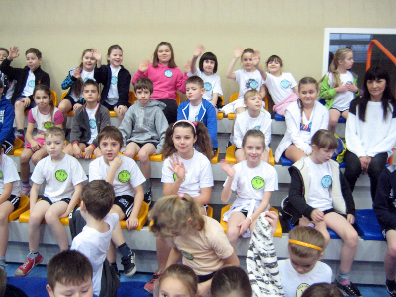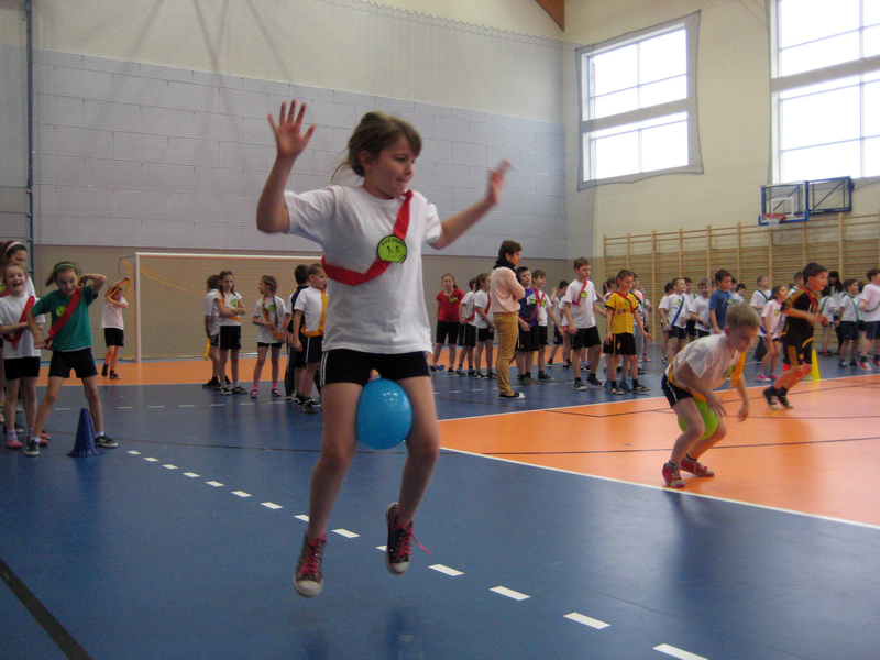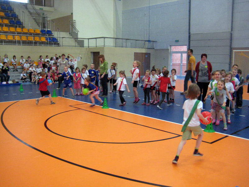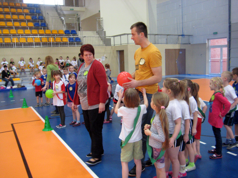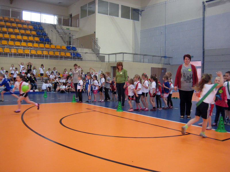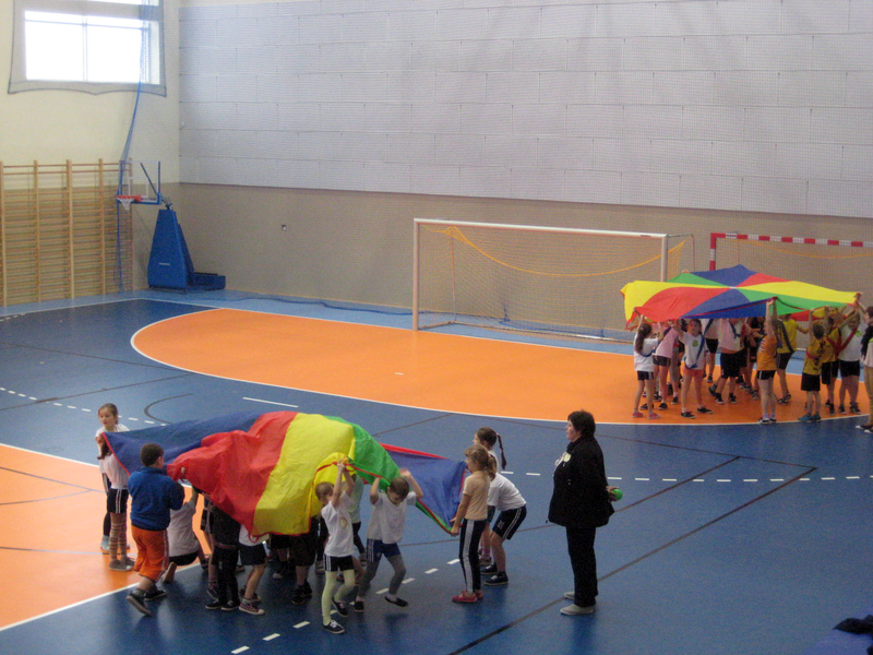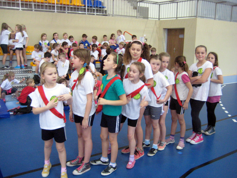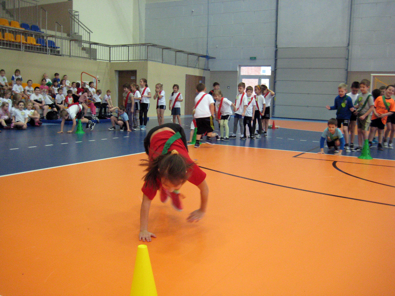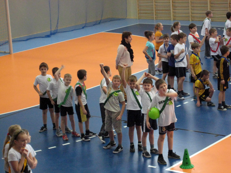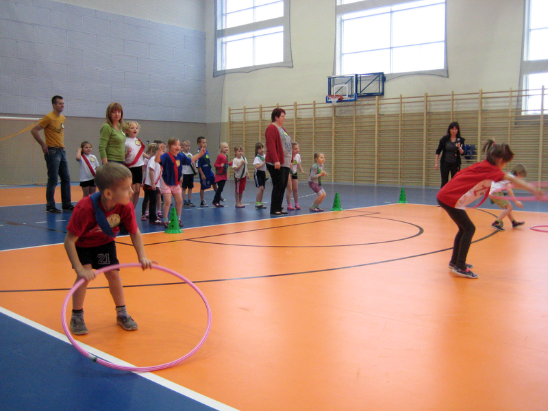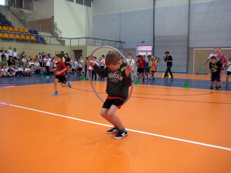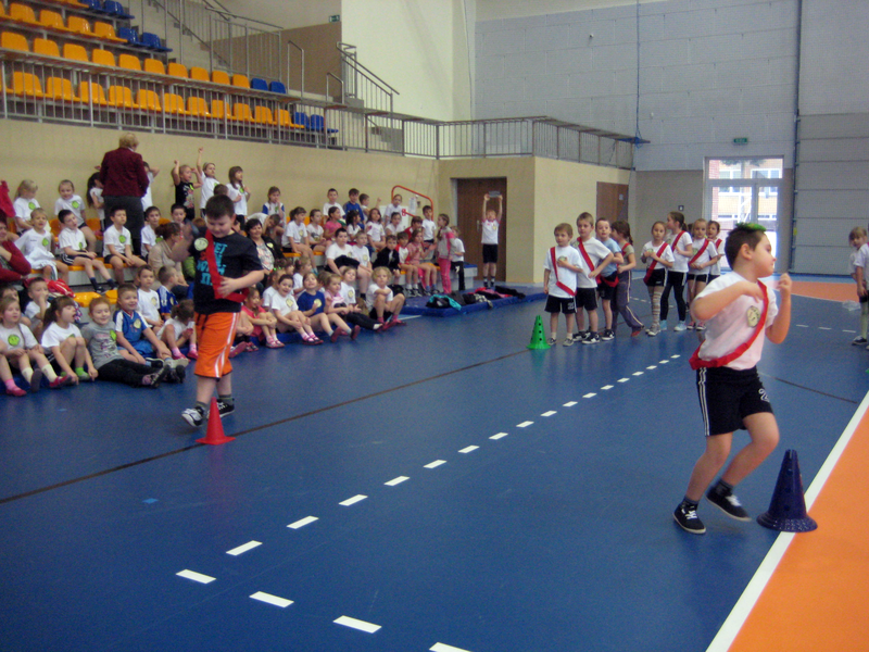 Uroczyste otwarcie hali sportowo – widowiskowej odbyło się na początku stycznia, teraz na prośbę pani dyrektor Aleksandry Krawczyk zorganizowano sportową olimpiadę dla najmłodszych uczniów naszej szkoły.  Ten dzień był wyjątkowy. Wszystkie klasy i dzieci przedszkolne rywalizowały ze sobą w różnych dyscyplinach: zawody z piłką, obręczą, z woreczkami, różne zabawy i gry zespołowe, zabawy z chustą Klanza.