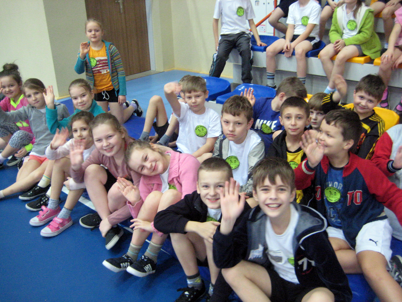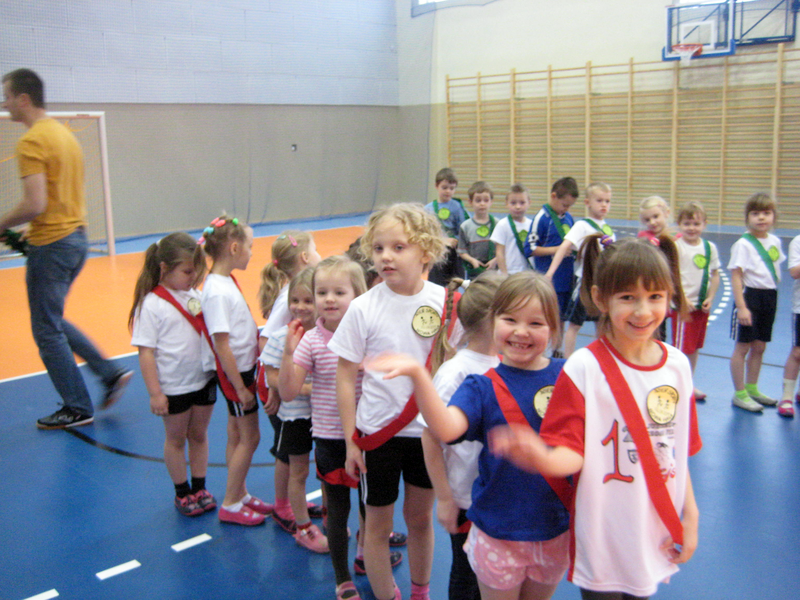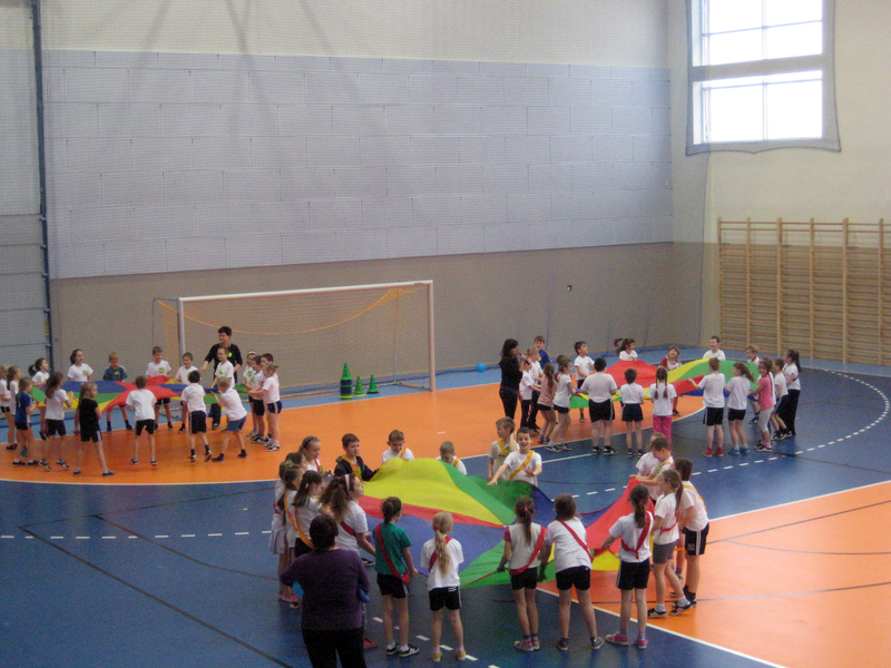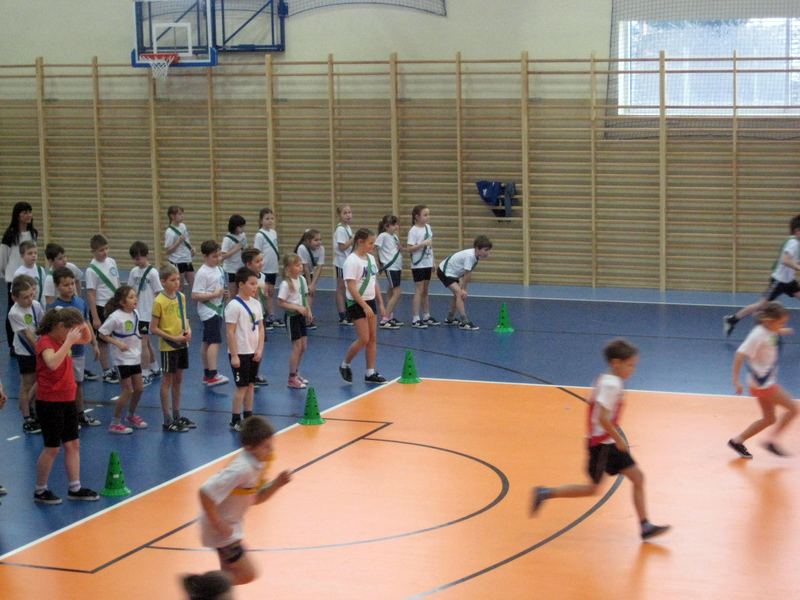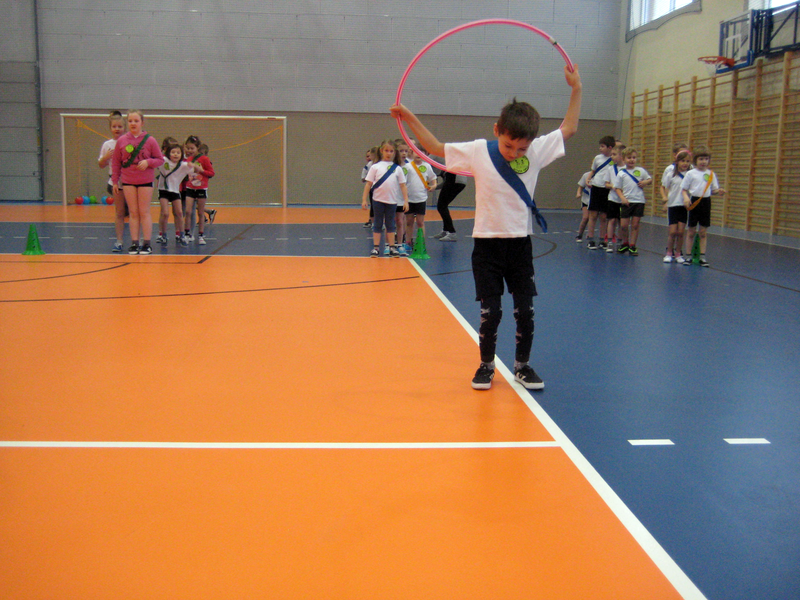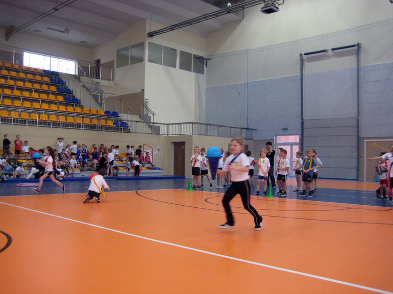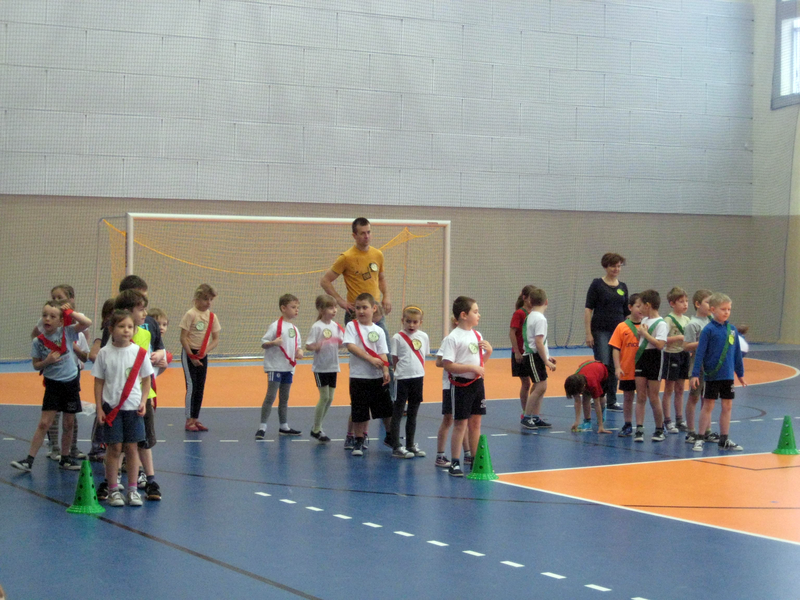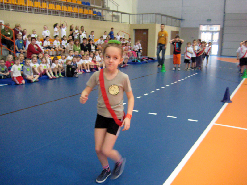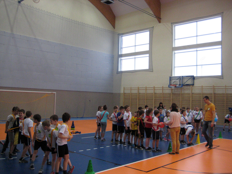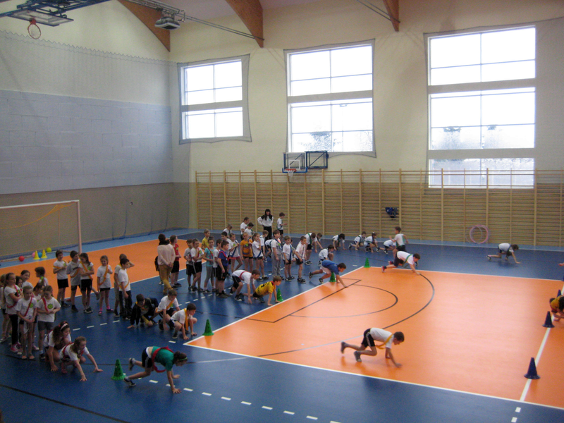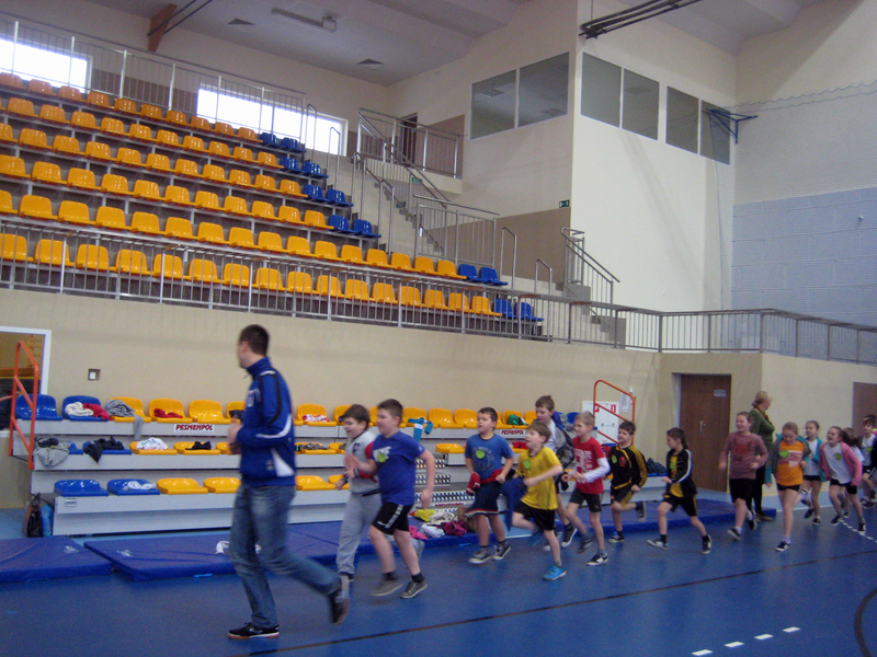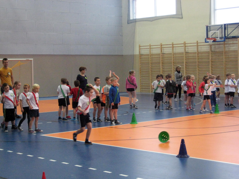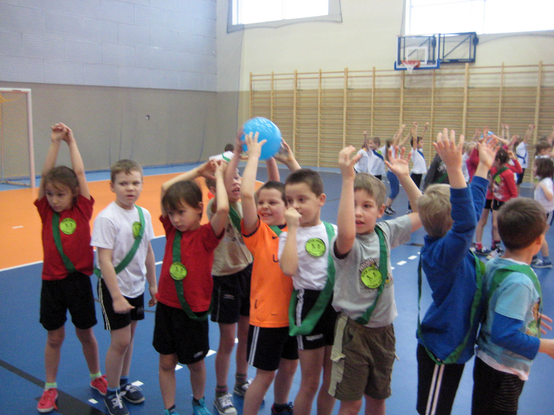 Uroczyste otwarcie hali sportowo – widowiskowej odbyło się na początku stycznia, teraz na prośbę pani dyrektor Aleksandry Krawczyk zorganizowano sportową olimpiadę dla najmłodszych uczniów naszej szkoły.  Ten dzień był wyjątkowy. Wszystkie klasy i dzieci przedszkolne rywalizowały ze sobą w różnych dyscyplinach: zawody z piłką, obręczą, z woreczkami, różne zabawy i gry zespołowe, zabawy z chustą Klanza.