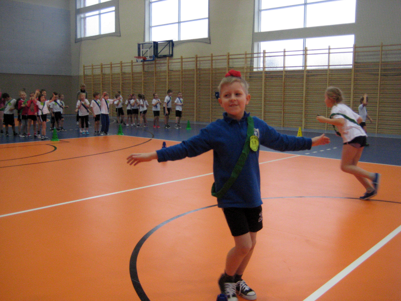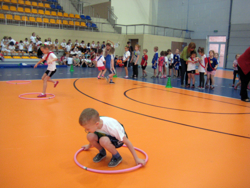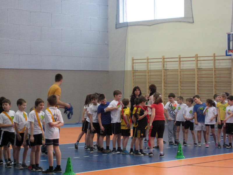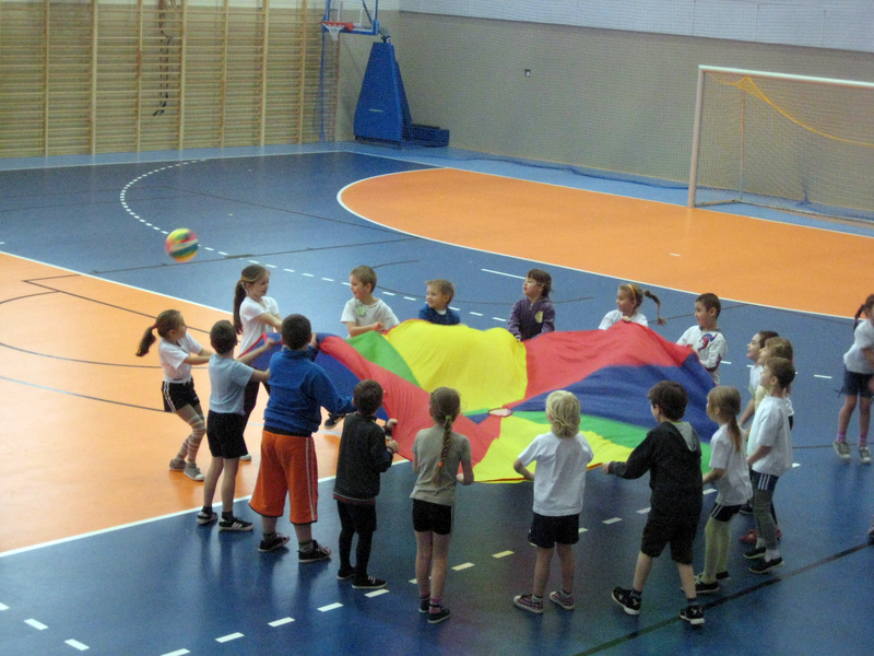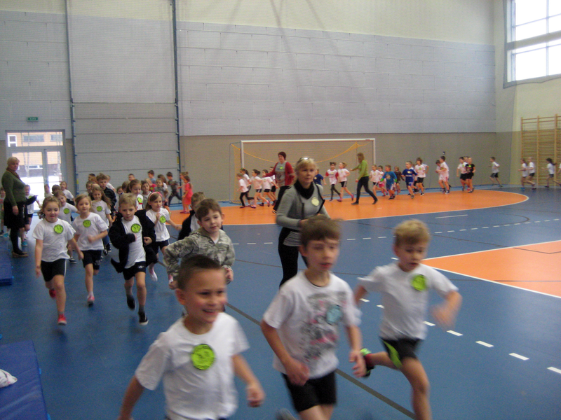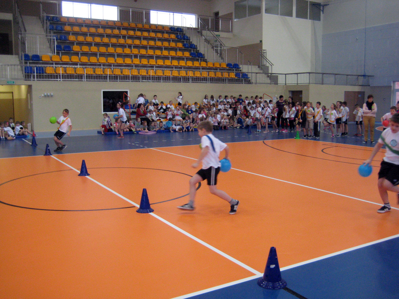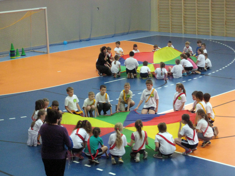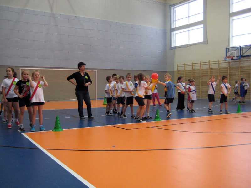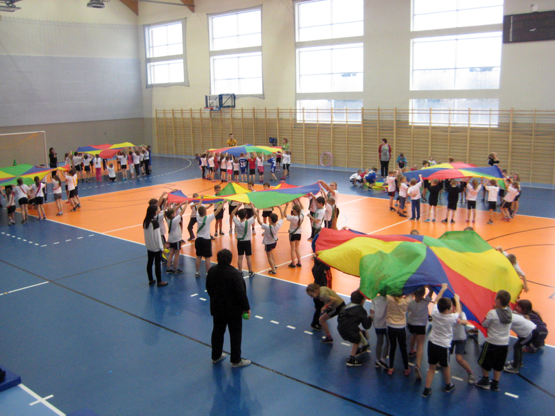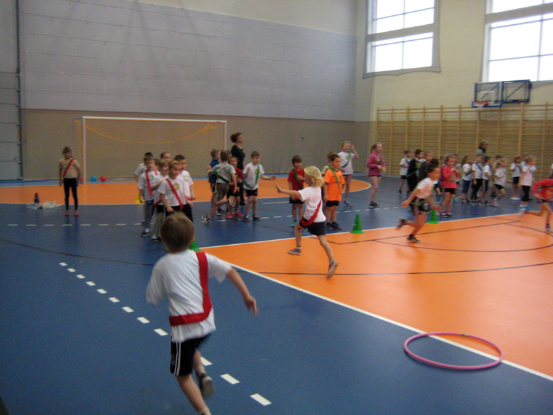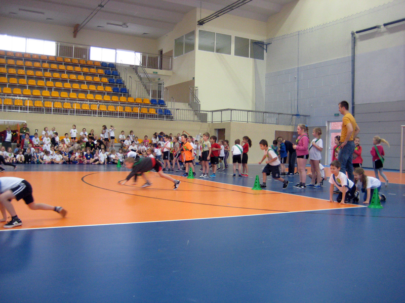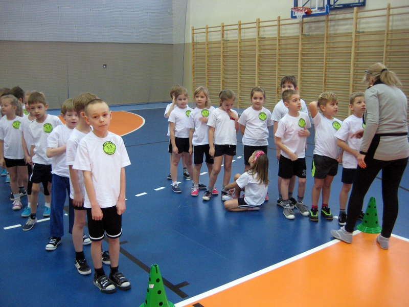 Uroczyste otwarcie hali sportowo – widowiskowej odbyło się na początku stycznia, teraz na prośbę pani dyrektor Aleksandry Krawczyk zorganizowano sportową olimpiadę dla najmłodszych uczniów naszej szkoły.  Ten dzień był wyjątkowy. Wszystkie klasy i dzieci przedszkolne rywalizowały ze sobą w różnych dyscyplinach: zawody z piłką, obręczą, z woreczkami, różne zabawy i gry zespołowe, zabawy z chustą Klanza.