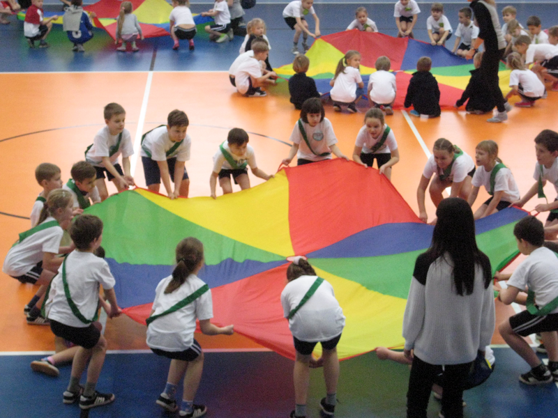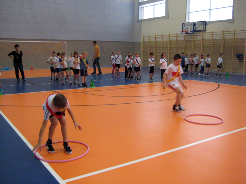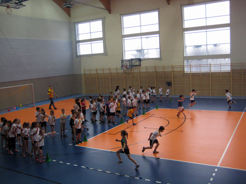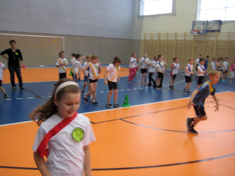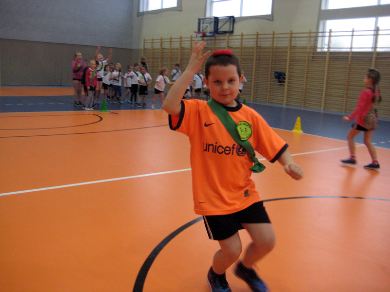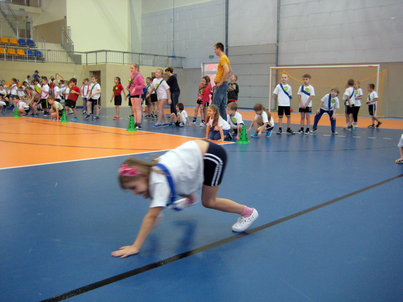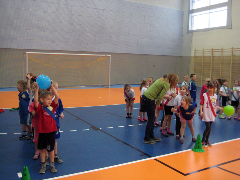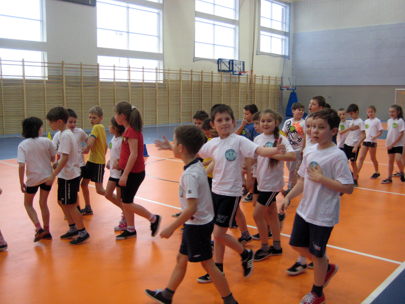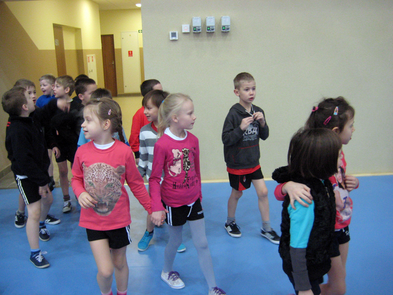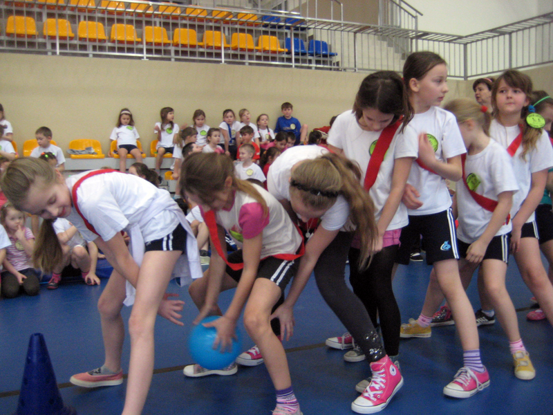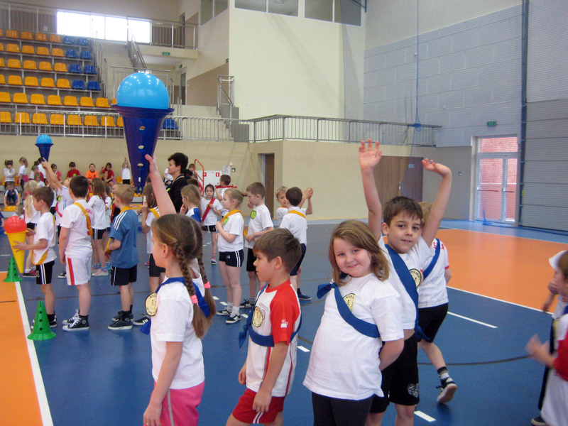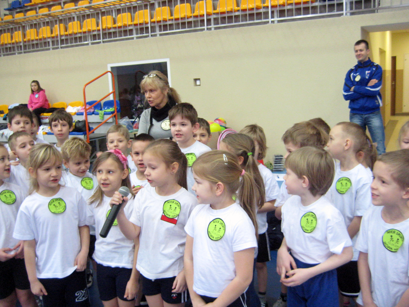Uroczyste otwarcie hali sportowo – widowiskowej odbyło się na początku stycznia, teraz na prośbę pani dyrektor Aleksandry Krawczyk zorganizowano sportową olimpiadę dla najmłodszych uczniów naszej szkoły.  Ten dzień był wyjątkowy. Wszystkie klasy i dzieci przedszkolne rywalizowały ze sobą w różnych dyscyplinach: zawody z piłką, obręczą, z woreczkami, różne zabawy i gry zespołowe, zabawy z chustą Klanza.