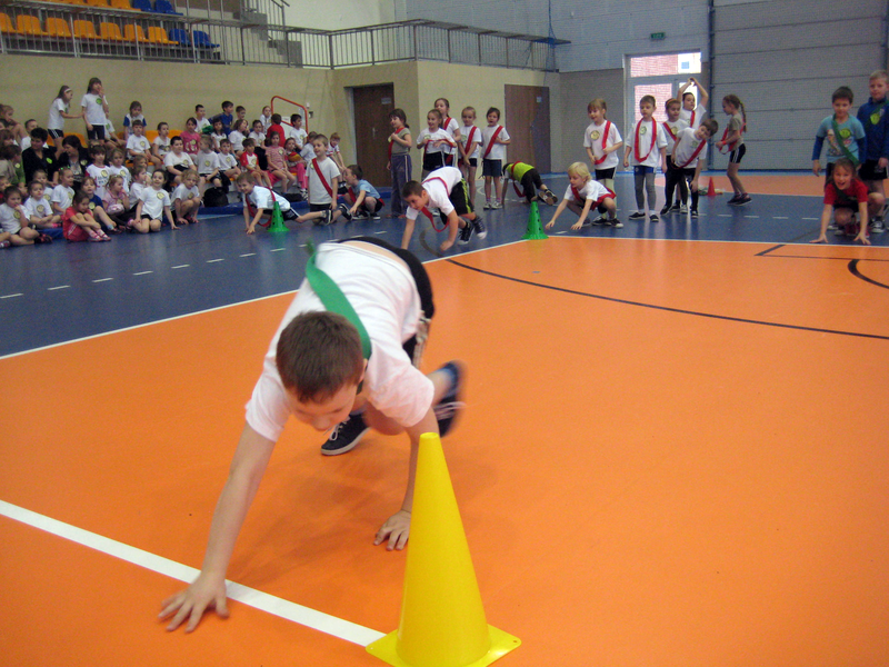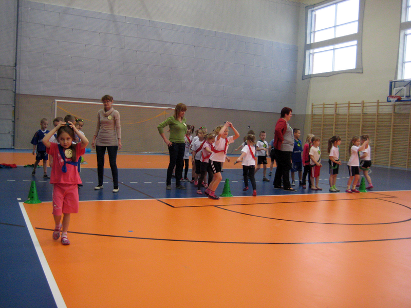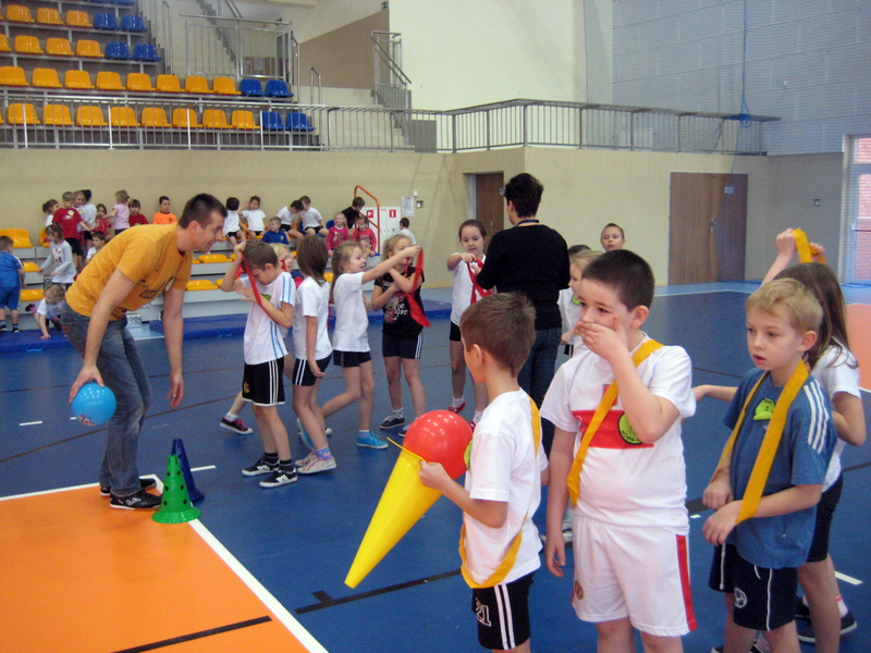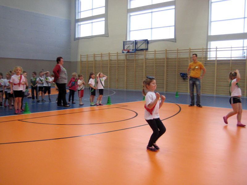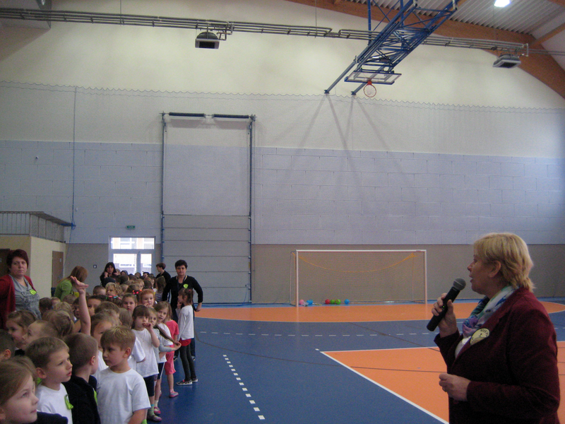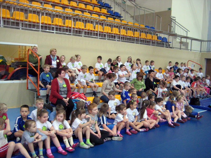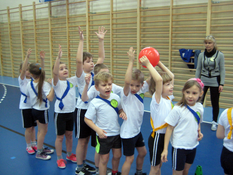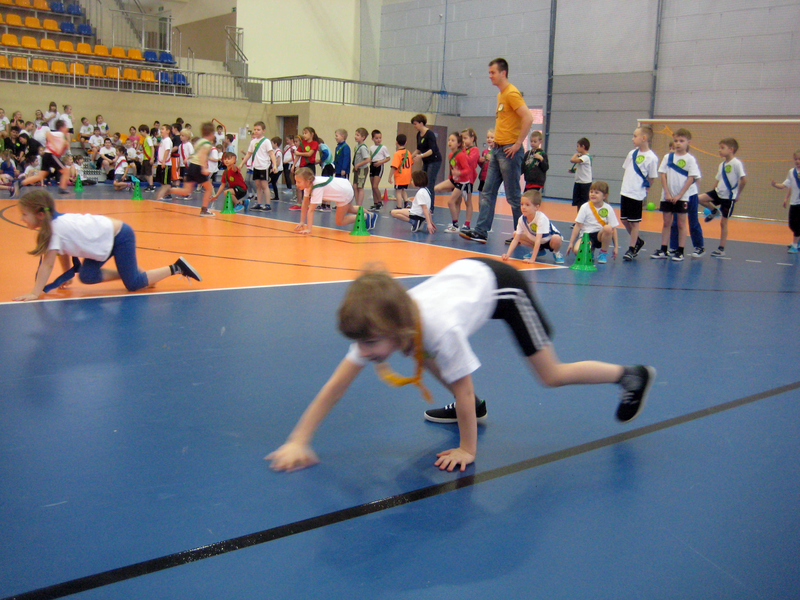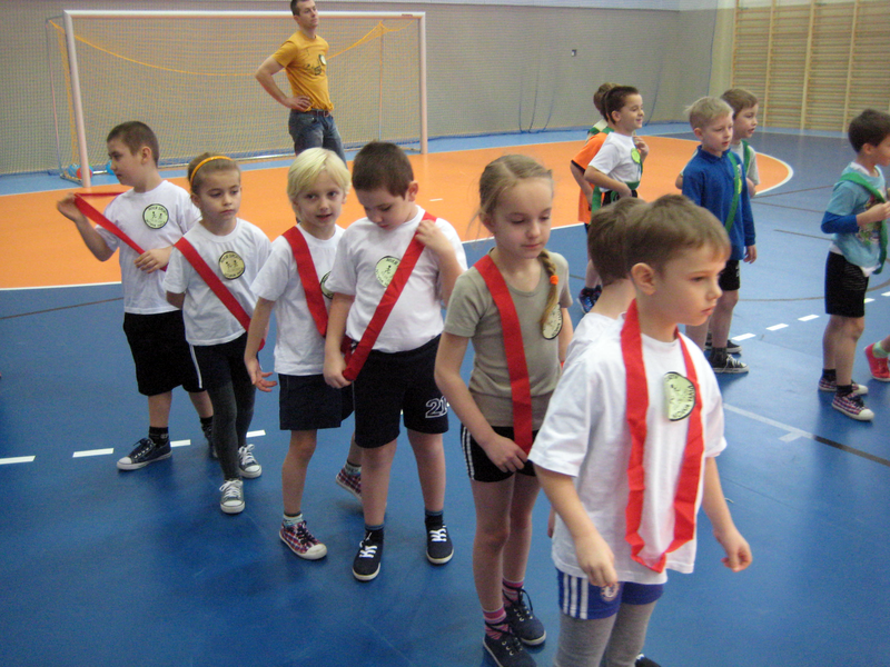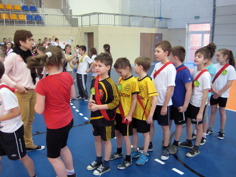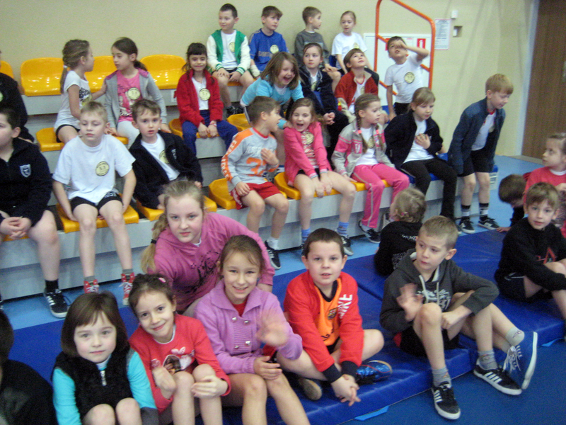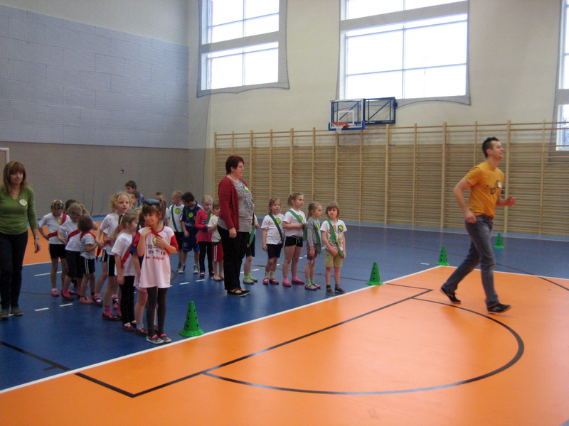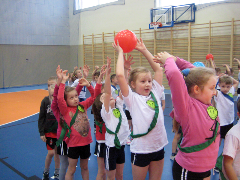 Uroczyste otwarcie hali sportowo – widowiskowej odbyło się na początku stycznia, teraz na prośbę pani dyrektor Aleksandry Krawczyk zorganizowano sportową olimpiadę dla najmłodszych uczniów naszej szkoły.  Ten dzień był wyjątkowy. Wszystkie klasy i dzieci przedszkolne rywalizowały ze sobą w różnych dyscyplinach: zawody z piłką, obręczą, z woreczkami, różne zabawy i gry zespołowe, zabawy z chustą Klanza.