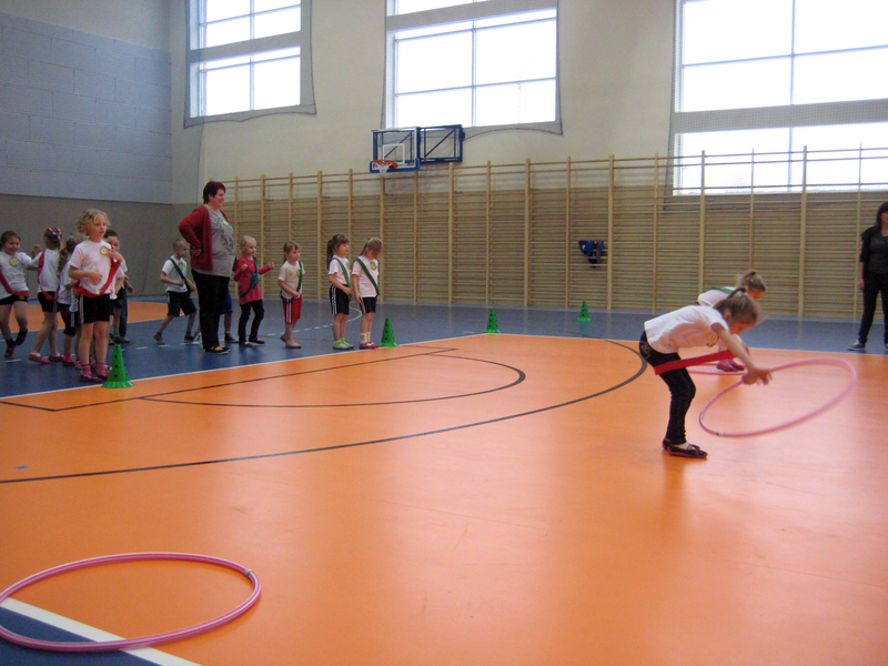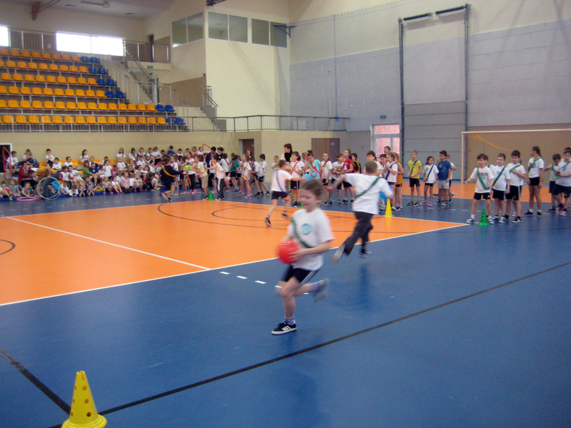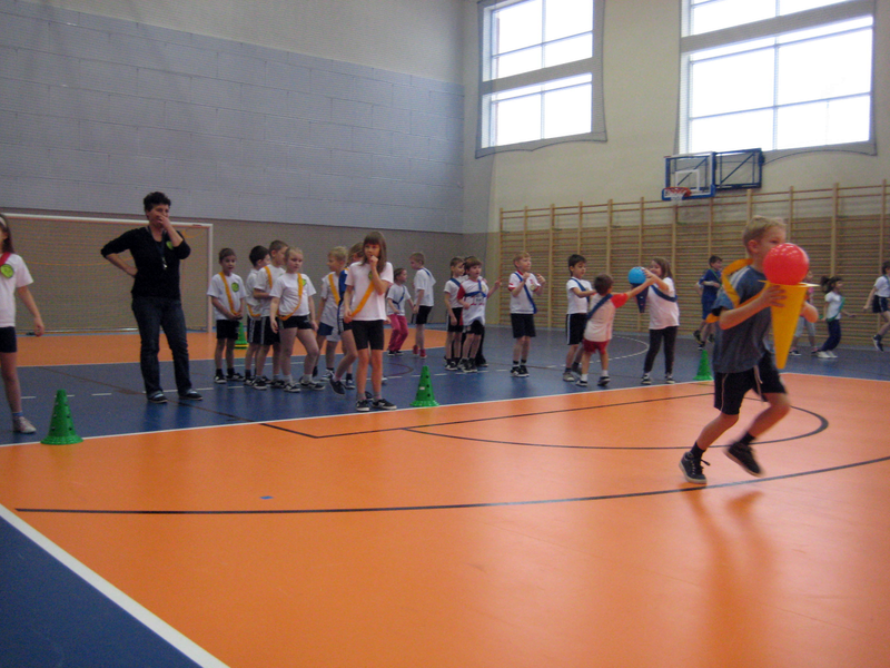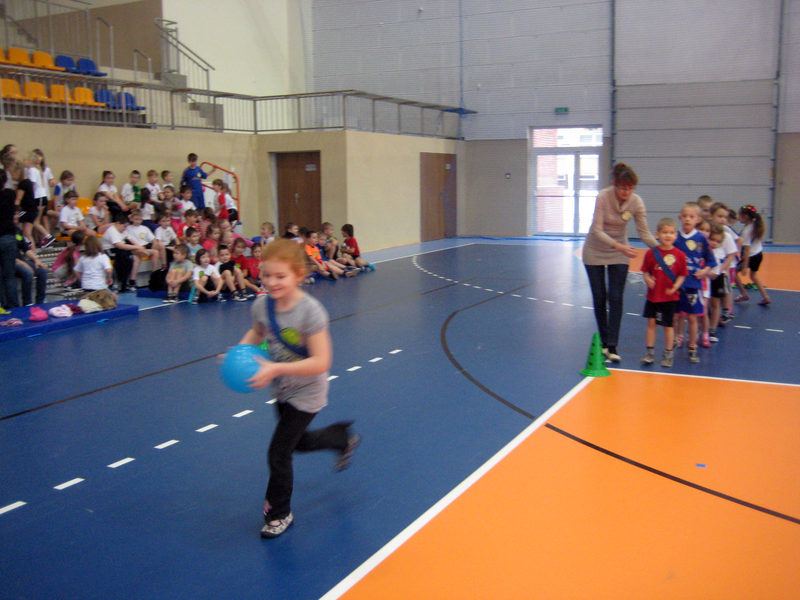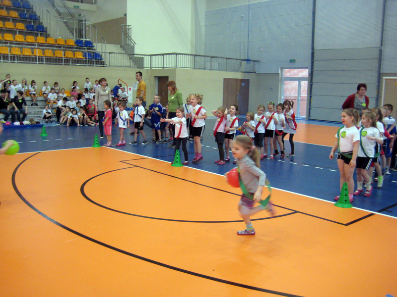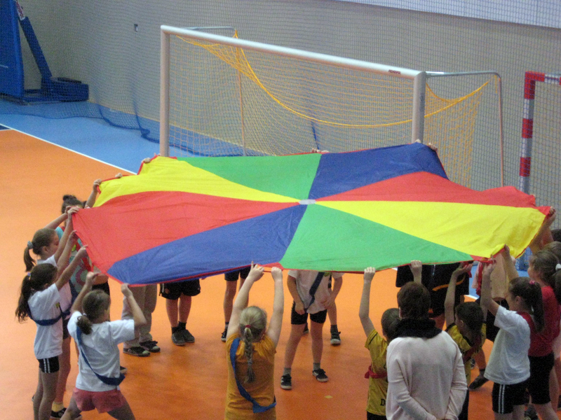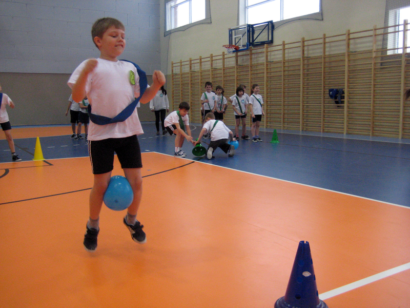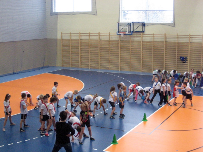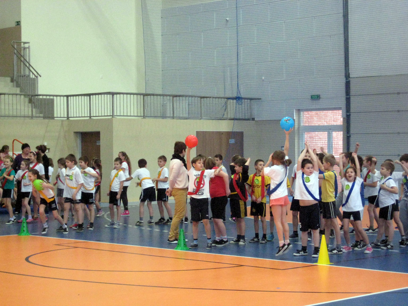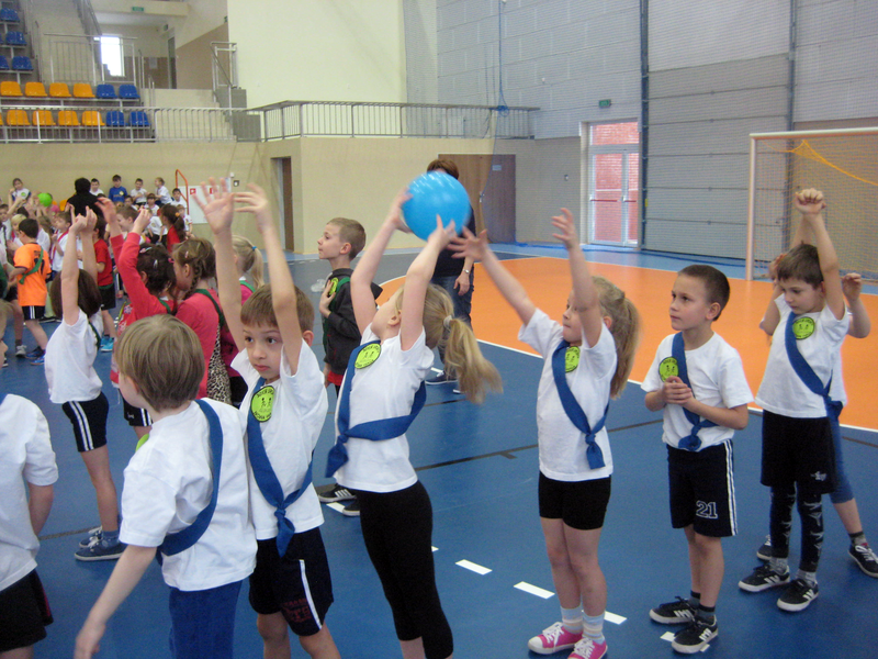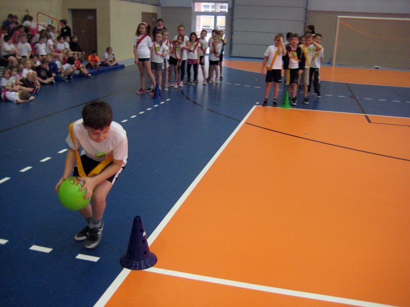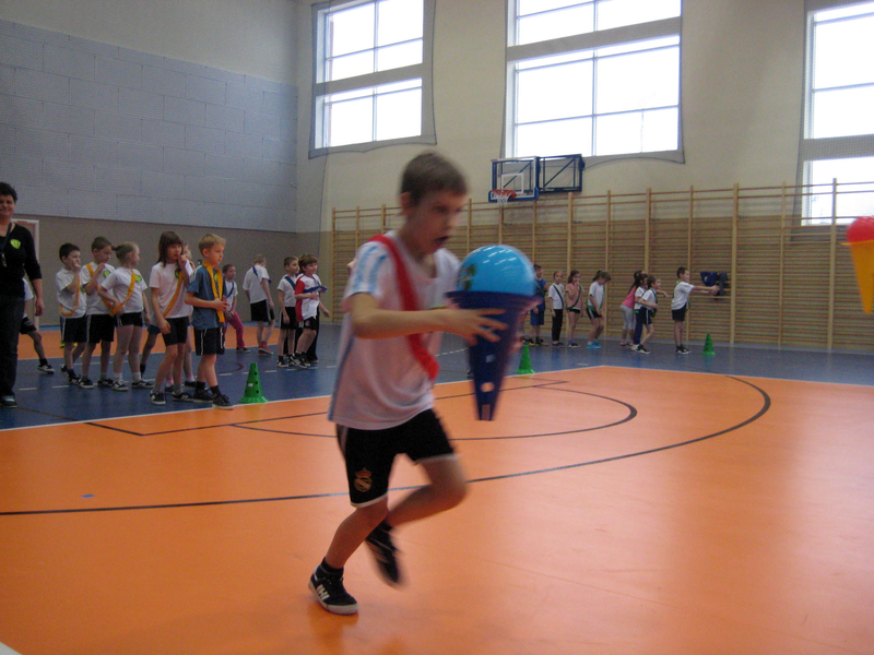 Uroczyste otwarcie hali sportowo – widowiskowej odbyło się na początku stycznia, teraz na prośbę pani dyrektor Aleksandry Krawczyk zorganizowano sportową olimpiadę dla najmłodszych uczniów naszej szkoły.  Ten dzień był wyjątkowy. Wszystkie klasy i dzieci przedszkolne rywalizowały ze sobą w różnych dyscyplinach: zawody z piłką, obręczą, z woreczkami, różne zabawy i gry zespołowe, zabawy z chustą Klanza.