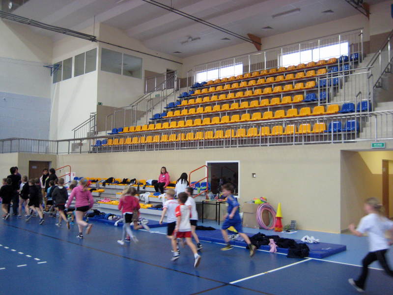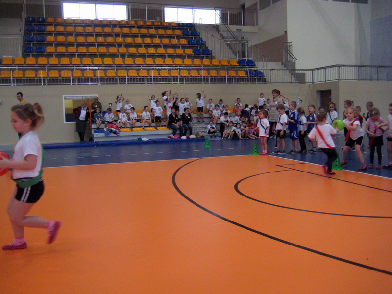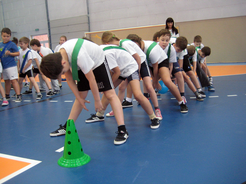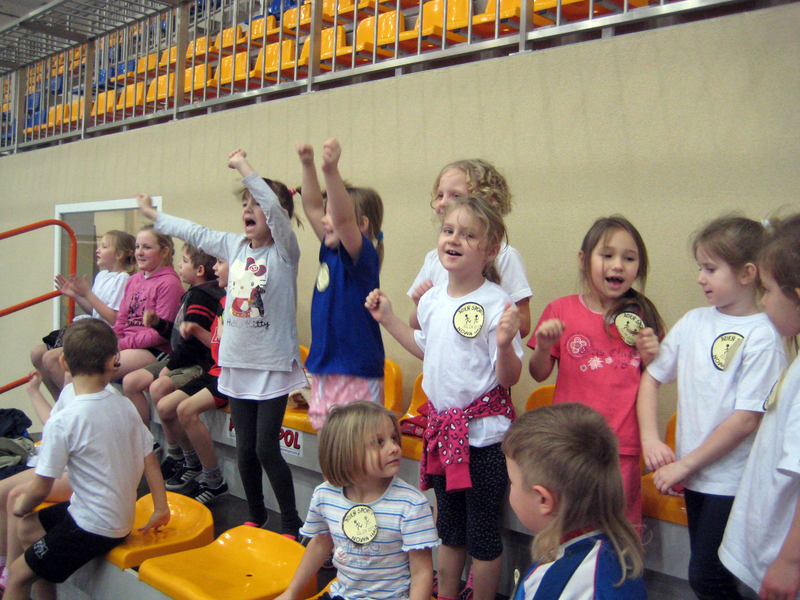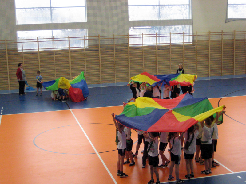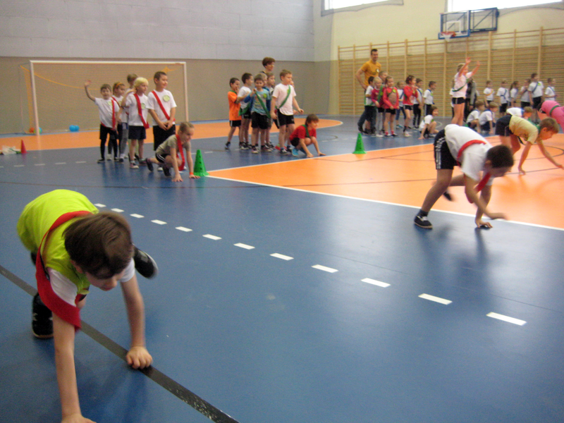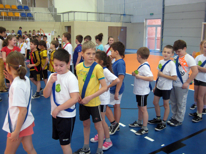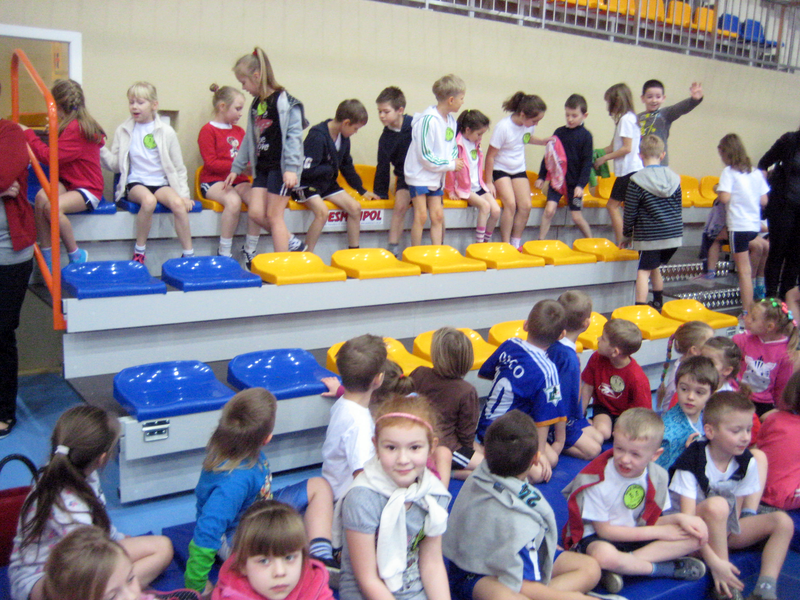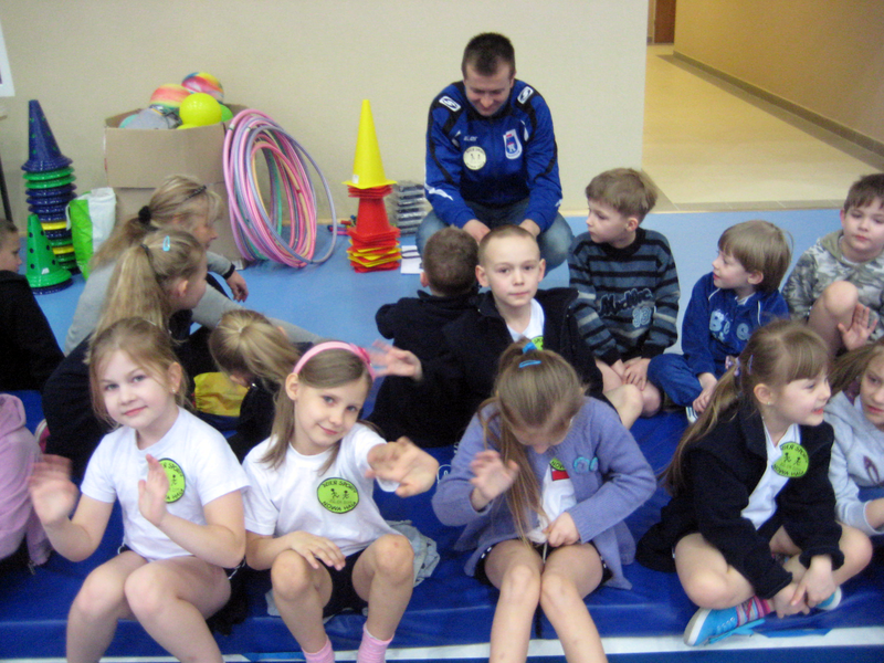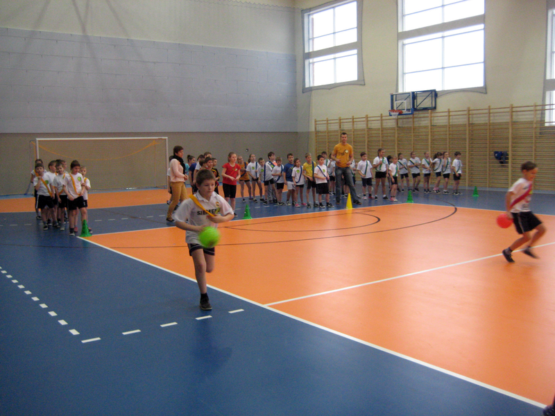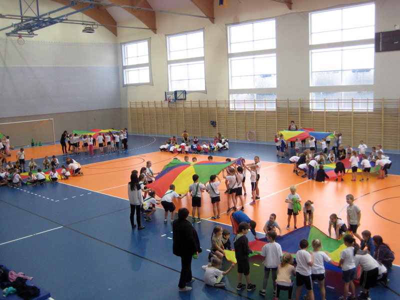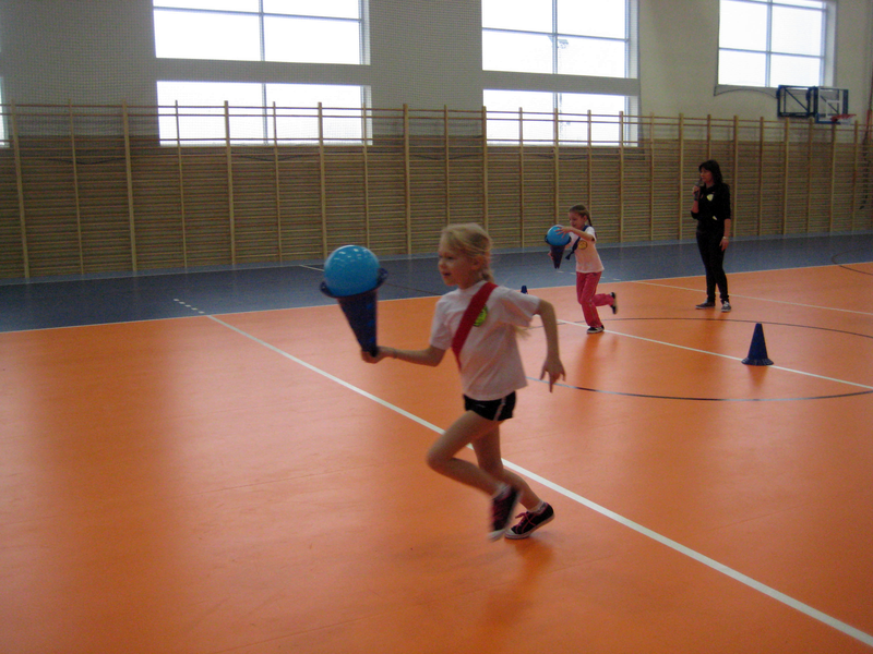 Uroczyste otwarcie hali sportowo – widowiskowej odbyło się na początku stycznia, teraz na prośbę pani dyrektor Aleksandry Krawczyk zorganizowano sportową olimpiadę dla najmłodszych uczniów naszej szkoły.  Ten dzień był wyjątkowy. Wszystkie klasy i dzieci przedszkolne rywalizowały ze sobą w różnych dyscyplinach: zawody z piłką, obręczą, z woreczkami, różne zabawy i gry zespołowe, zabawy z chustą Klanza.