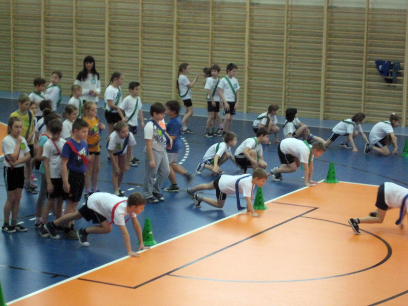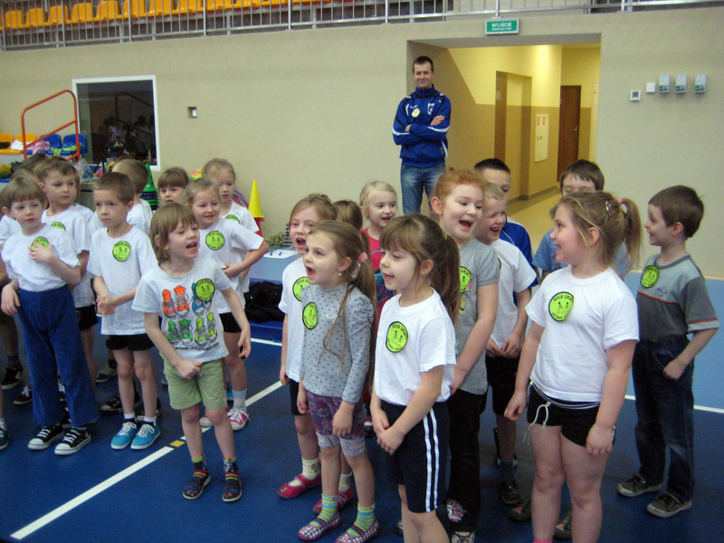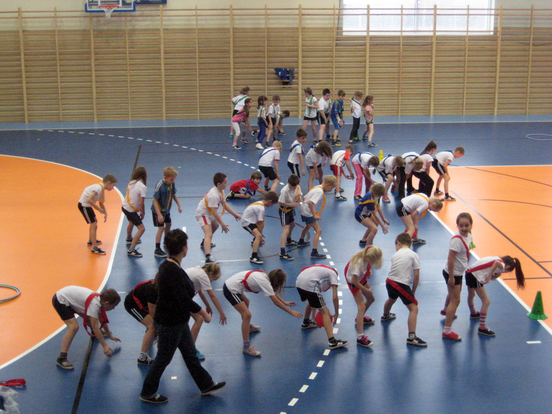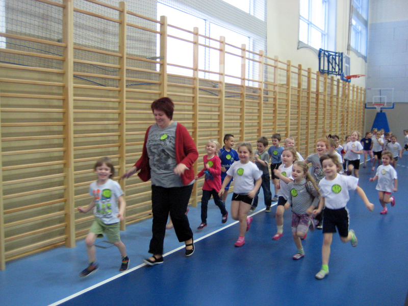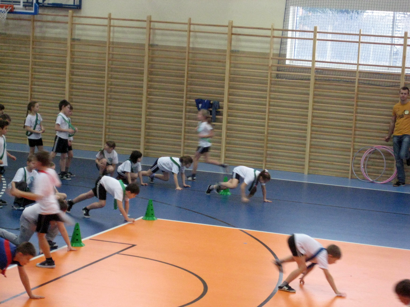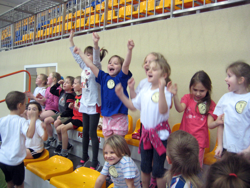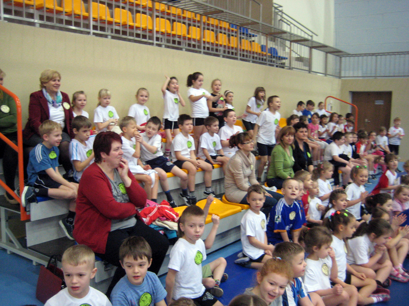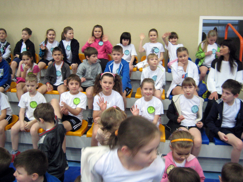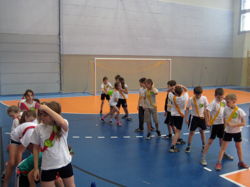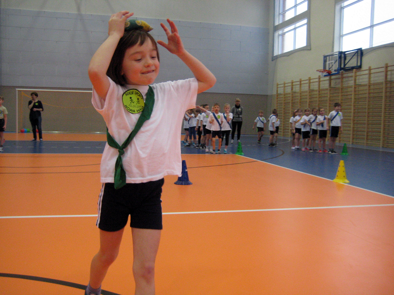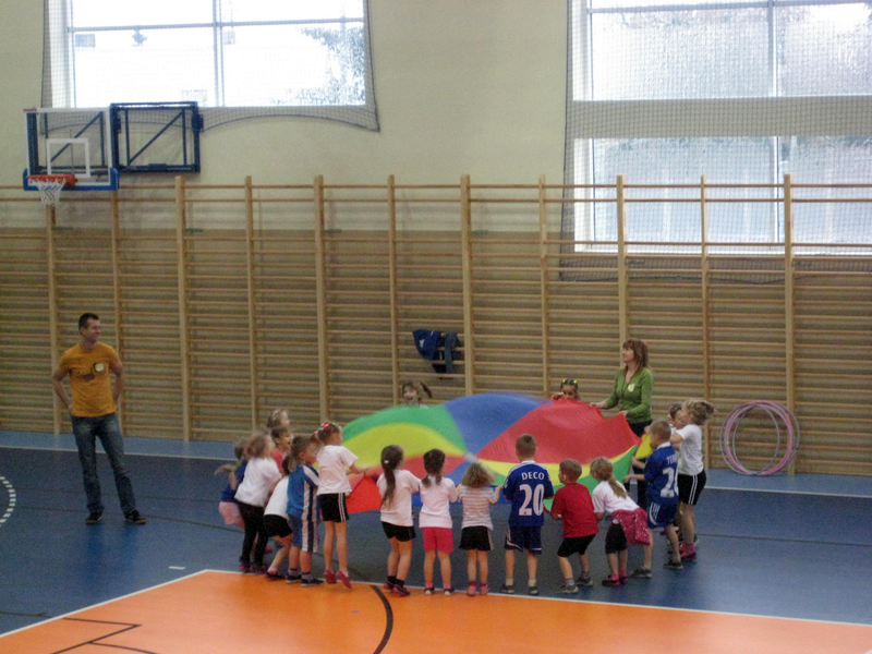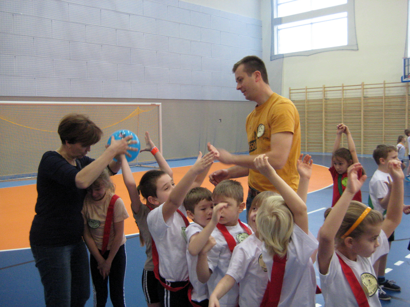 Uroczyste otwarcie hali sportowo – widowiskowej odbyło się na początku stycznia, teraz na prośbę pani dyrektor Aleksandry Krawczyk zorganizowano sportową olimpiadę dla najmłodszych uczniów naszej szkoły.  Ten dzień był wyjątkowy. Wszystkie klasy i dzieci przedszkolne rywalizowały ze sobą w różnych dyscyplinach: zawody z piłką, obręczą, z woreczkami, różne zabawy i gry zespołowe, zabawy z chustą Klanza.