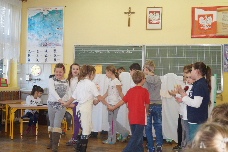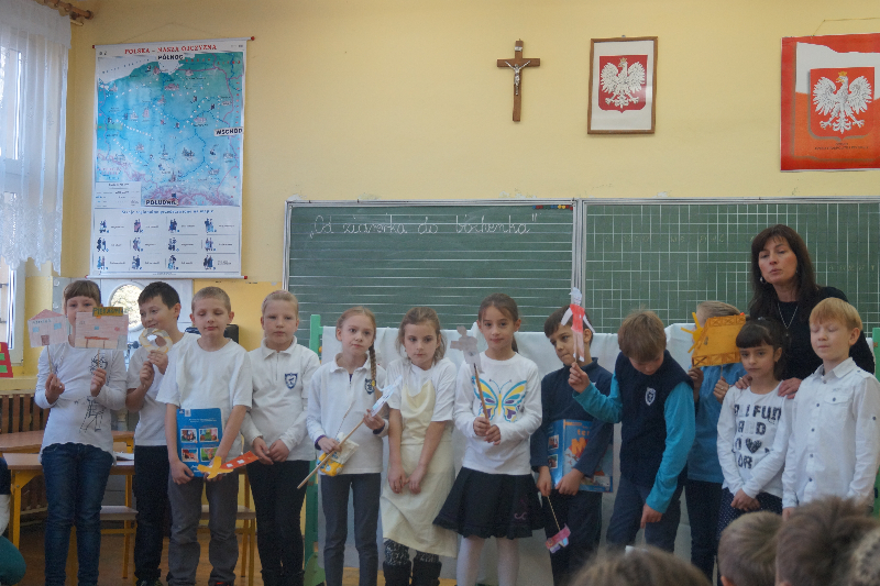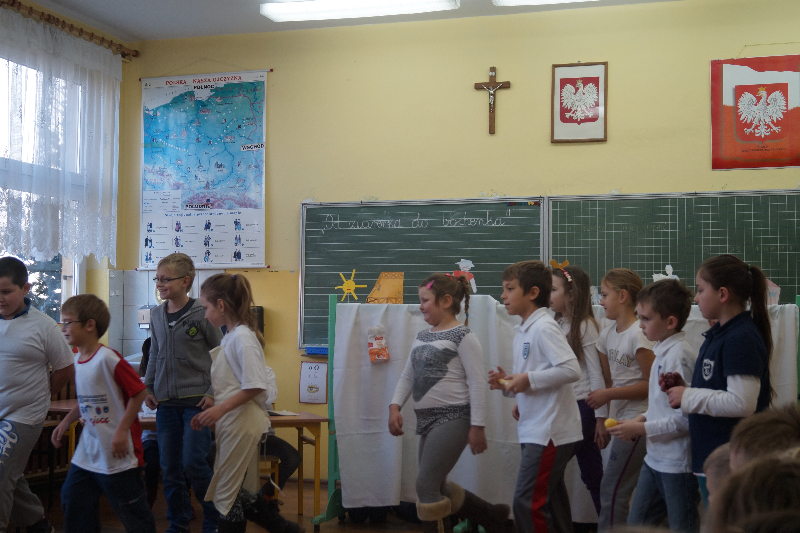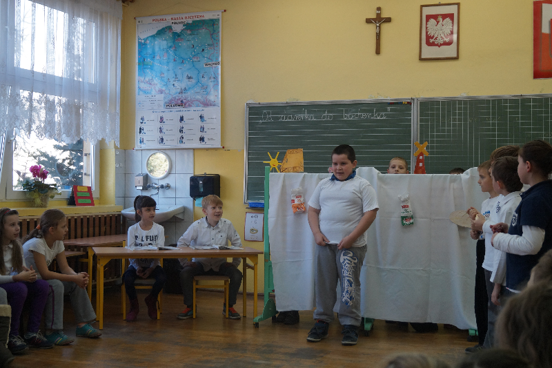 W związku z realizacją projektu edukacyjnego „Od ziarenka do bochenka” uczniowie klasy 3b przygotowali dla młodszych dzieci teatrzyk pt. „Obwarzanek”. Przy pomocy rodziców dzieci wykonały elementy scenograficzne. Wprowadzeniem w tematykę przedstawienia była zabawa ruchowa „Mało nas”. Dzieci pokazały pracę rolnika , młynarza i piekarza oraz etapy procesu „od ziarenka do bochenka”. Teatrzyk był przyjęty z dużym zainteresowaniem i zaciekawieniem. Nad całością czuwała wychowawczyni Iwona Bartczak.
