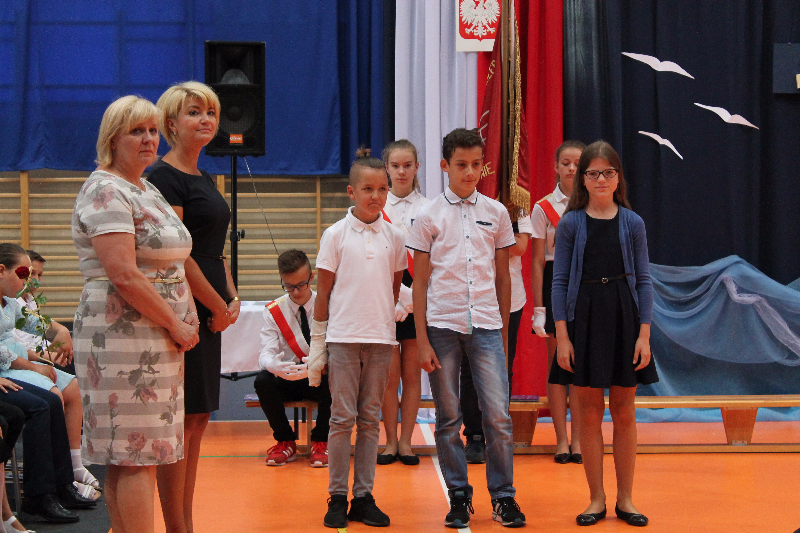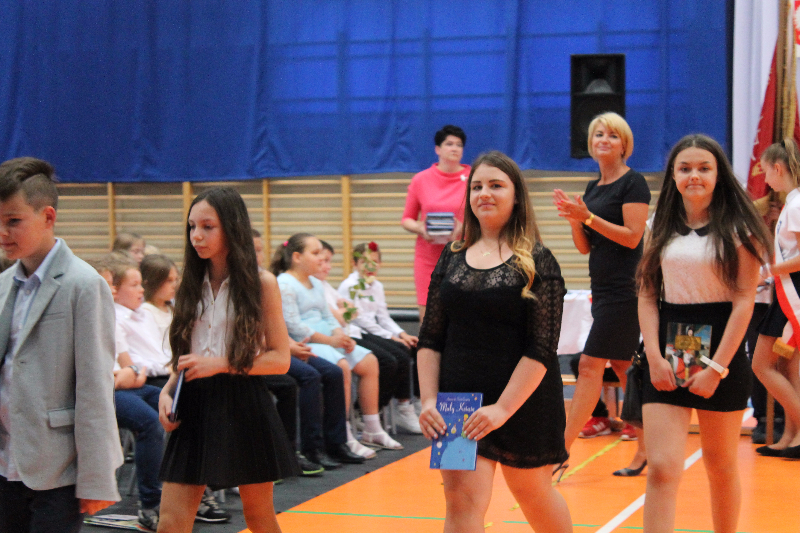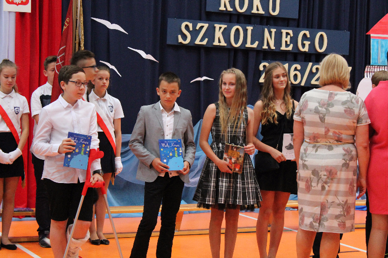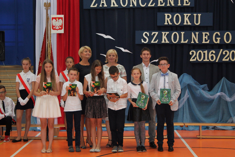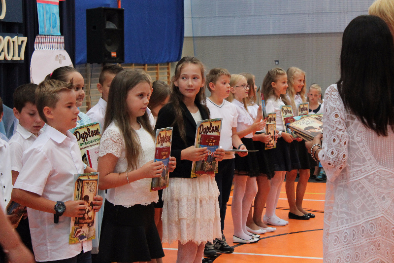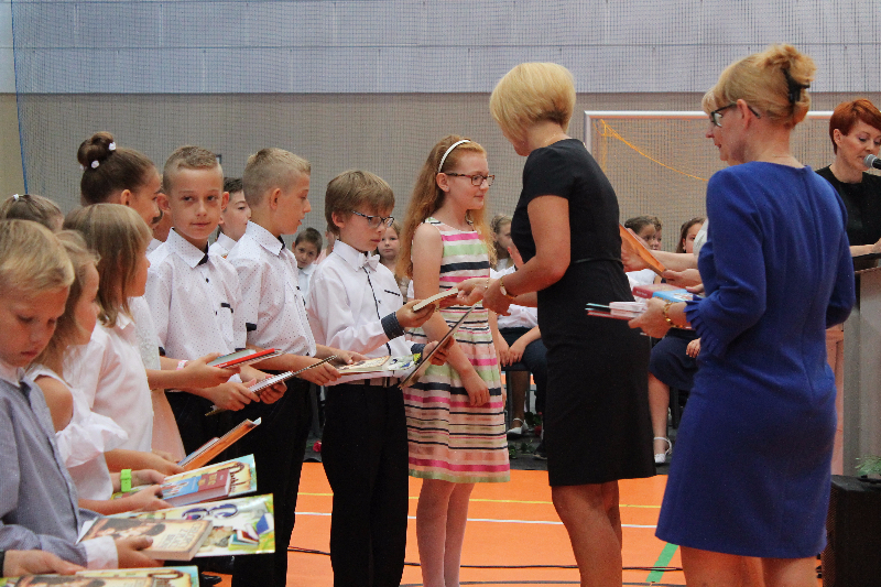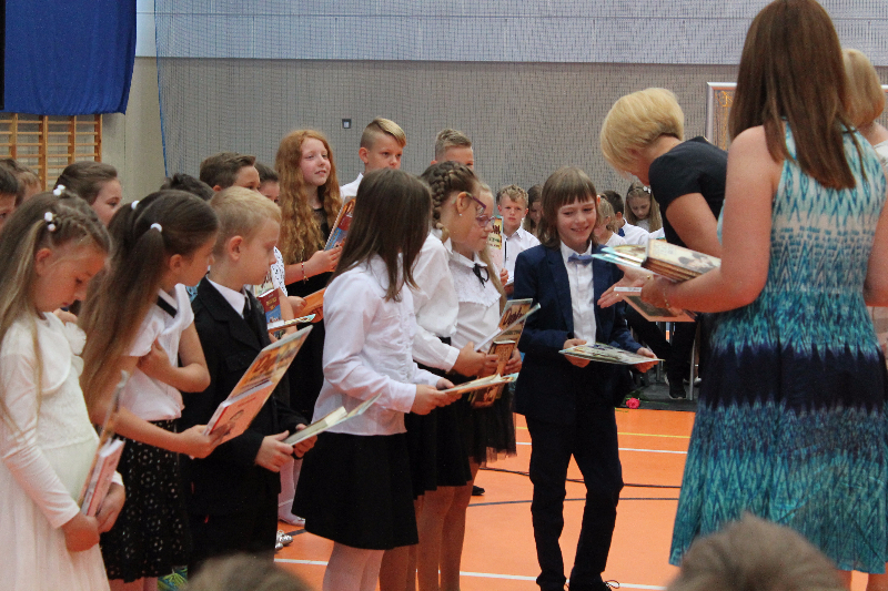Po przemówieniu pani Dyrektor Alicji Duczmal, nastąpiło wręczenie świadectw uczniom klas III, który zakończyli I etap edukacyjny. Następnie pani dyrektor, wychowawcy klas oraz przewodnicząca Rady Rodziców, pani Iwona Żukowska wręczyli świadectwa z wyróżnieniem najlepszym uczniom z klas czwartych, piątych i szóstych, którzy uzyskali średnią 4,75 lub więcej oraz wzorowe lub bardzo dobre zachowanie. Uczniowie ci otrzymali także nagrody książkowe ufundowane przez Radę Rodziców.
