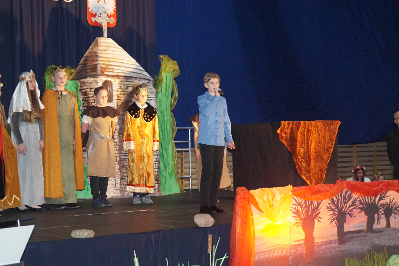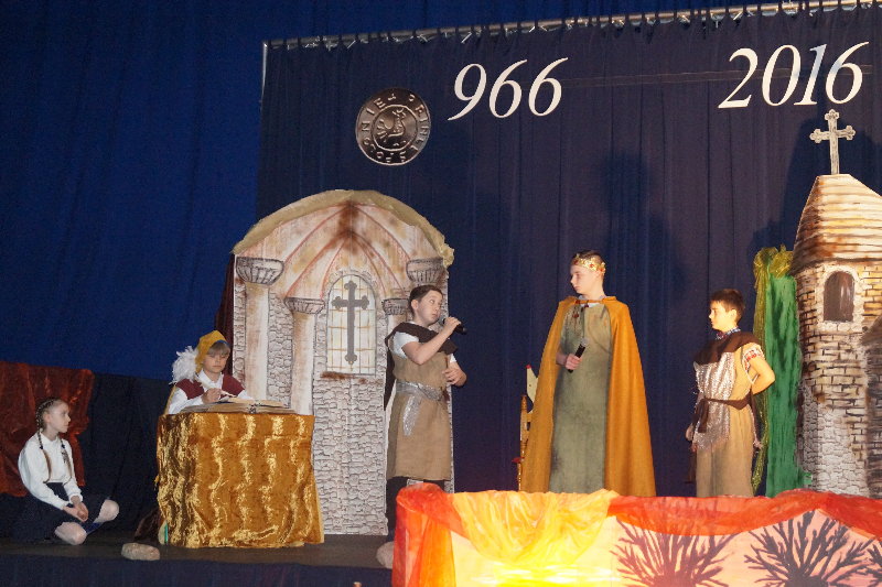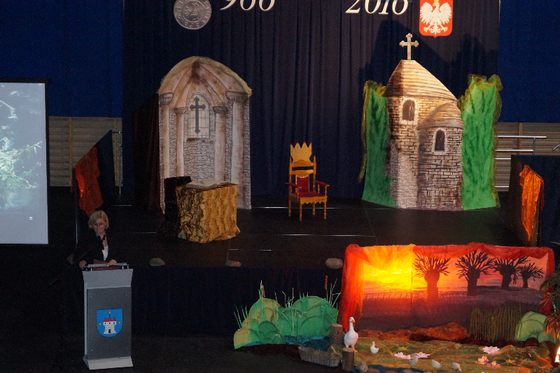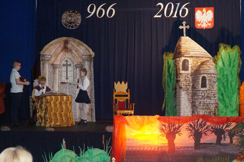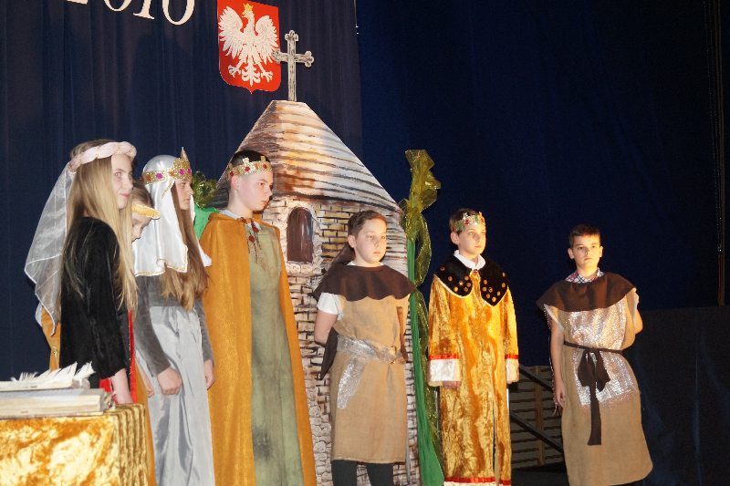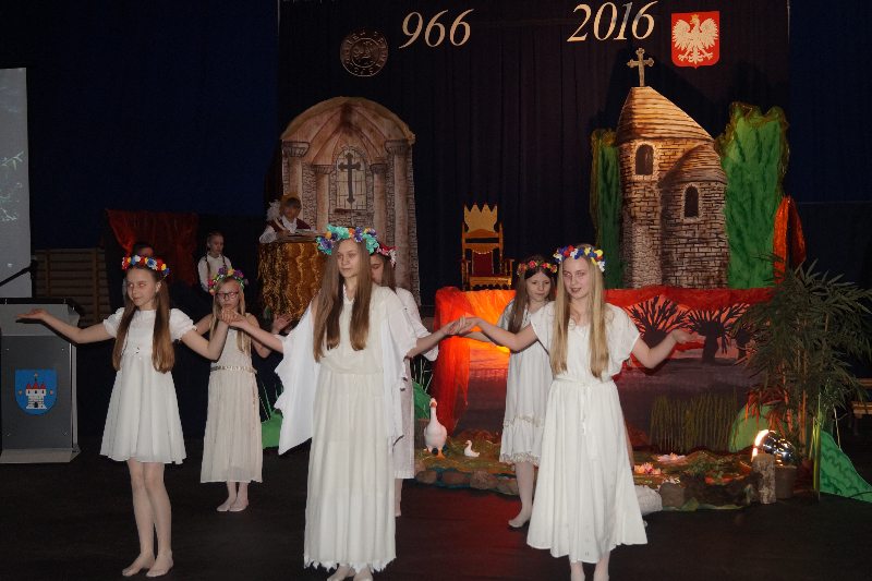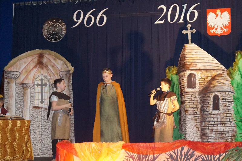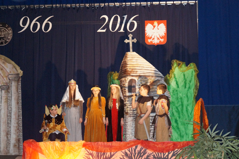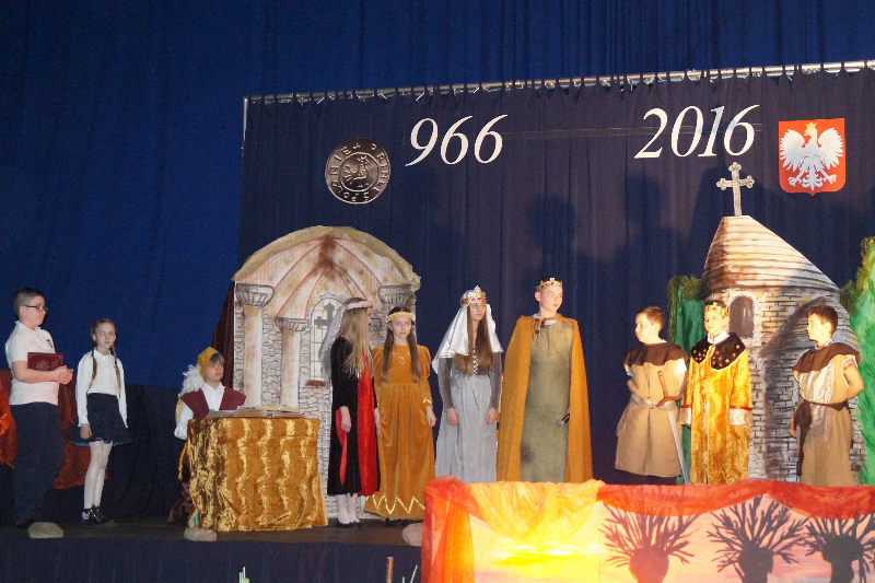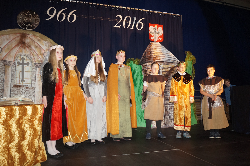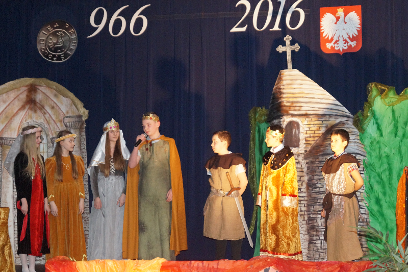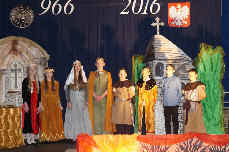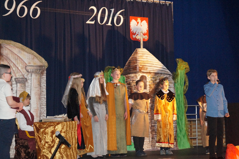Pani dyrektor Alicja Duczmal powitała zaproszonych gości, a następnie zaprosiła wszystkich zebranych w odległe czasy średniowiecza. Na scenie pojawili się pierwsi aktorzy, dzieci, które chciały dowiedzieć się czegoś o czasach Mieszka I. Przewodnikiem dzieci był kronikarz, który w bardzo ciekawy i przystępny sposób przedstawił dawne dzieje dynastii wczesnopiastowskiej. W kolejnych scenach mogliśmy zobaczyć Mieszka I, jego wojów, księżniczkę Dobrawę ze swoimi damami dworu ,księcia czeskiego Bolesława i słowiański taniec „Noc Kupały”. Piękne stroje, nawiązujące do czasów średniowiecza, teatralna scenografia i rekwizyty wymownie współgrały z młodymi aktorami. Dopełnieniem przedstawienia były występy zespołu muzyki dawnej Effascinato i Chóru Towarzystwa Śpiewu w Raszkowie, który wykonał pieśni: Bogurodzica, Gaude Mater Polonia, Gdzie chrzest, Ojczyzną moją jest Bóg i Boże, coś Polskę. Inscenizacja słowno – muzyczna wzbogacona była o prezentację multimedialną, w której wykorzystano fragmenty filmu „Gniazdo”. Z czasów średniowiecza do współczesności przeniósł nas Adam Mielcarek , uczeń klasy 5c, recytując wiersz księdza kanonika Bolesława Nowaka „ Minęło 1050 lat”.