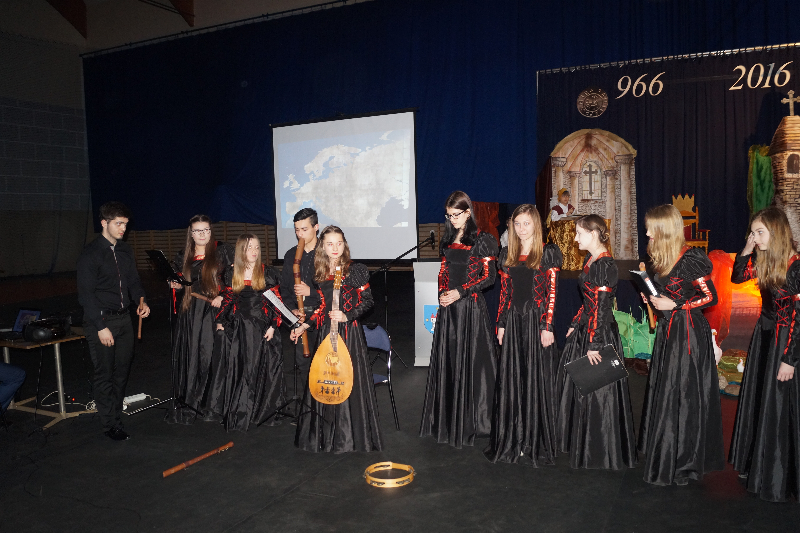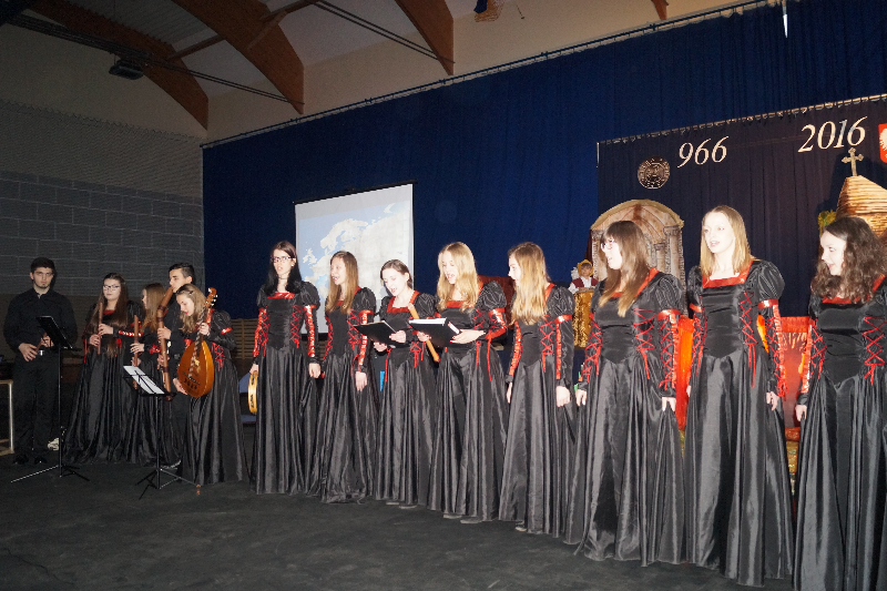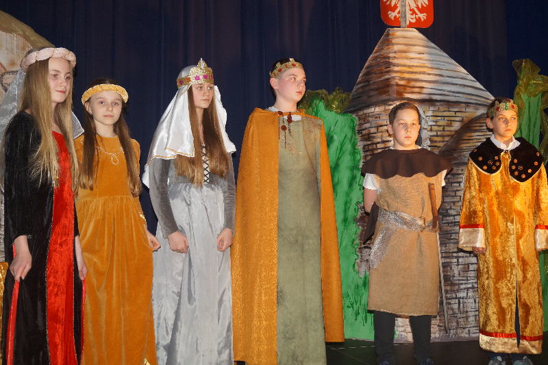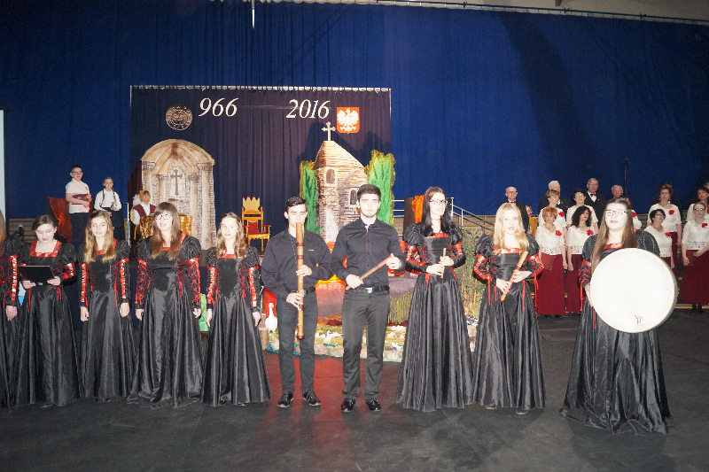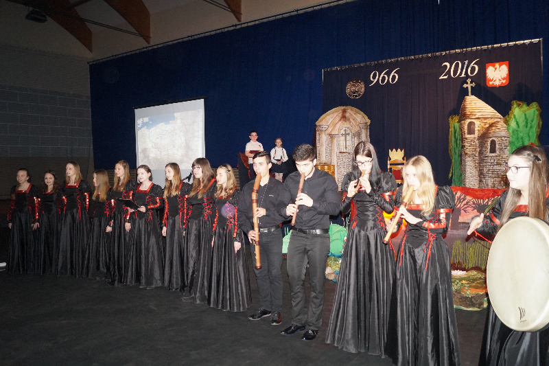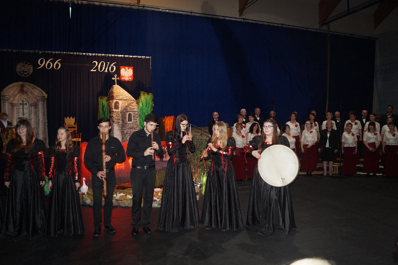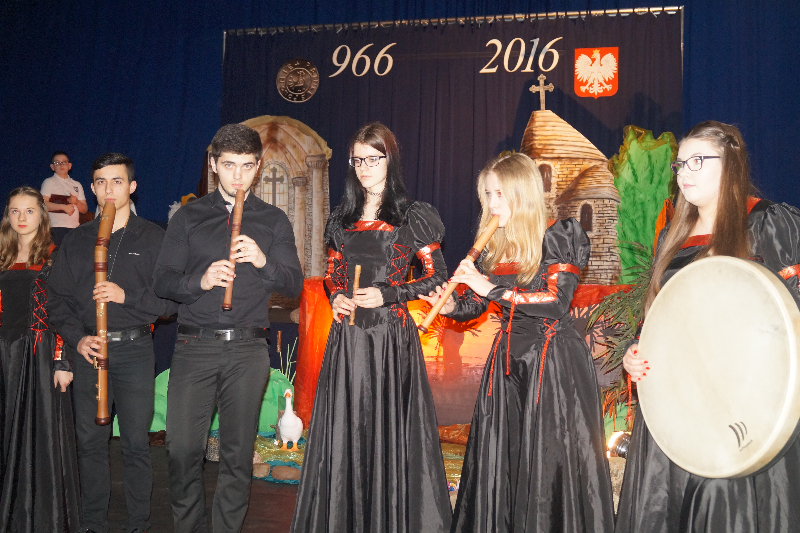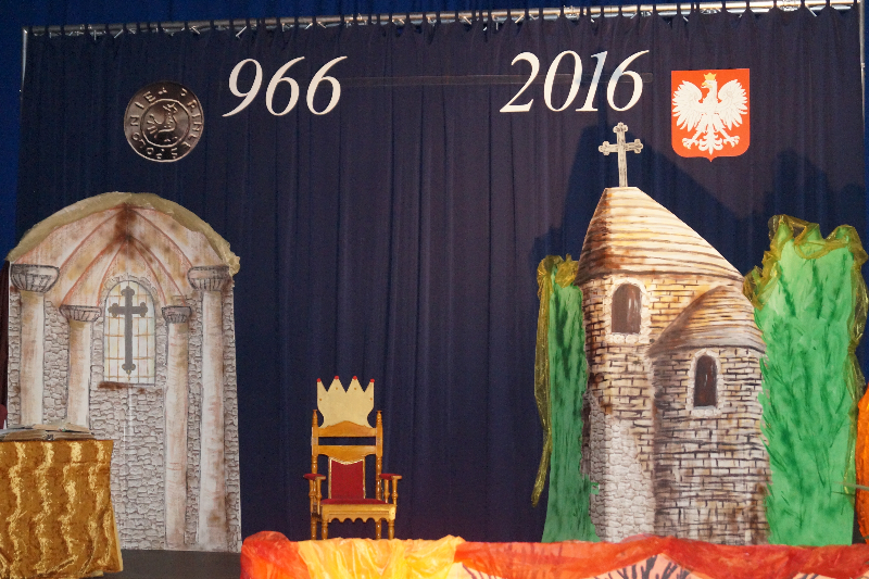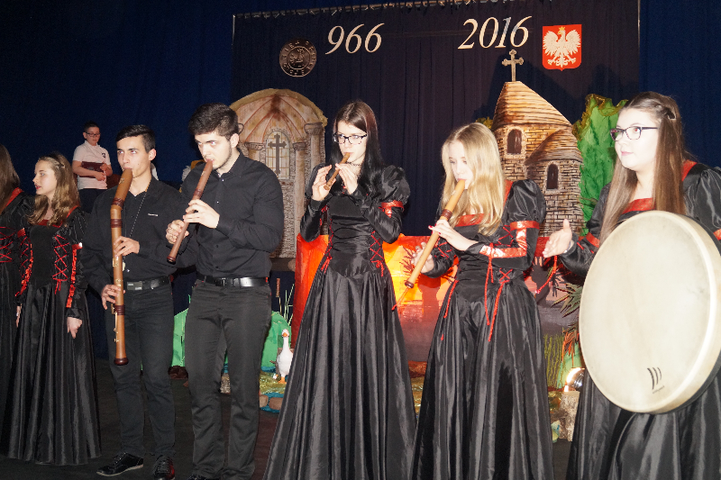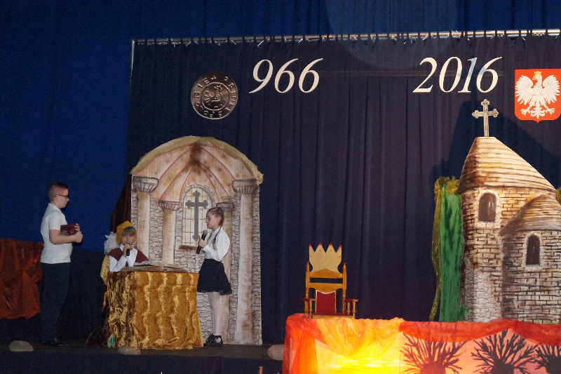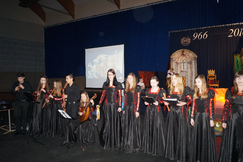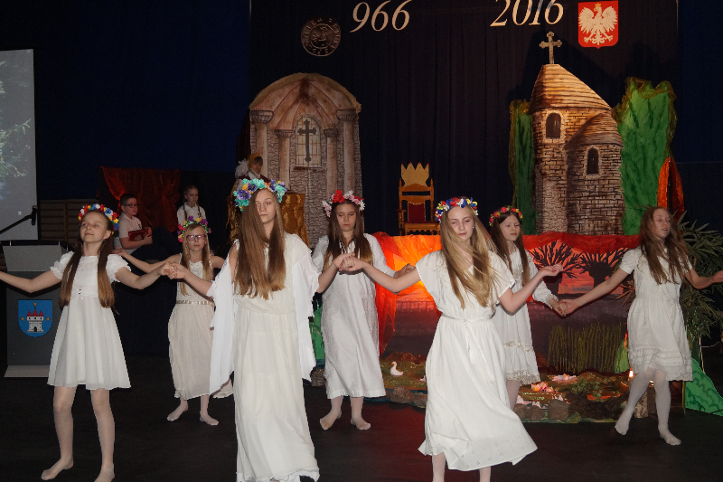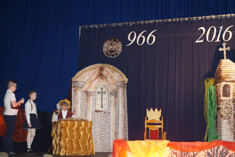 Pani dyrektor Alicja Duczmal powitała zaproszonych gości, a następnie zaprosiła wszystkich zebranych w odległe czasy średniowiecza. Na scenie pojawili się pierwsi aktorzy, dzieci, które chciały dowiedzieć się czegoś o czasach Mieszka I. Przewodnikiem dzieci był kronikarz, który w bardzo ciekawy i przystępny sposób przedstawił dawne dzieje dynastii wczesnopiastowskiej. W kolejnych scenach mogliśmy zobaczyć Mieszka I, jego wojów, księżniczkę Dobrawę ze swoimi damami dworu ,księcia czeskiego Bolesława i słowiański taniec „Noc Kupały”. Piękne stroje, nawiązujące do czasów średniowiecza, teatralna scenografia i rekwizyty wymownie współgrały z młodymi aktorami. Dopełnieniem przedstawienia były występy zespołu muzyki dawnej Effascinato i Chóru Towarzystwa Śpiewu w Raszkowie, który wykonał pieśni: Bogurodzica, Gaude Mater Polonia, Gdzie chrzest, Ojczyzną moją jest Bóg i Boże, coś Polskę. Inscenizacja słowno – muzyczna wzbogacona była o prezentację multimedialną, w której wykorzystano fragmenty filmu „Gniazdo”. Z czasów średniowiecza do współczesności przeniósł nas Adam Mielcarek , uczeń klasy 5c, recytując wiersz księdza kanonika Bolesława Nowaka „ Minęło 1050 lat”.