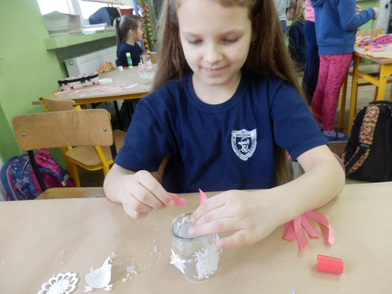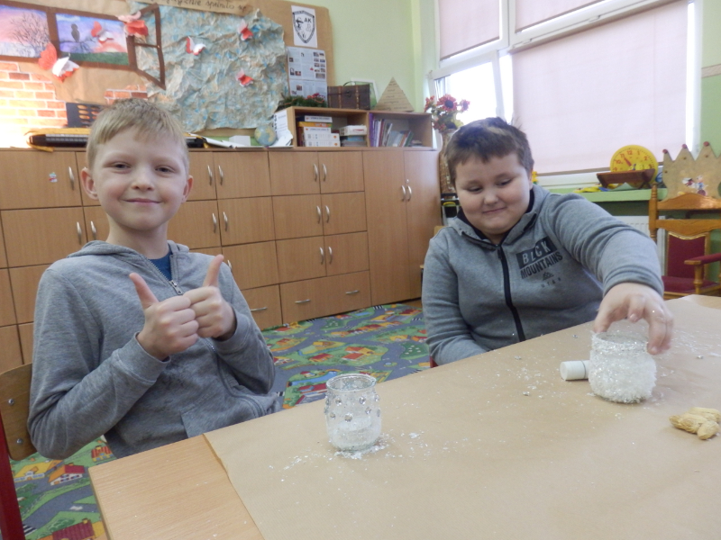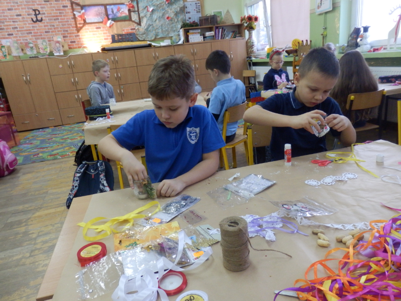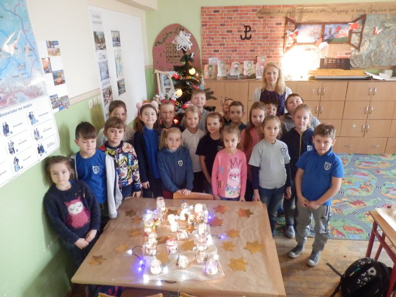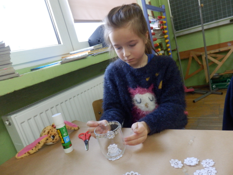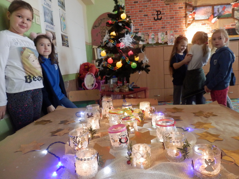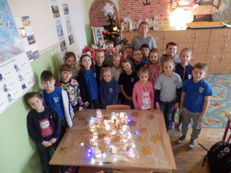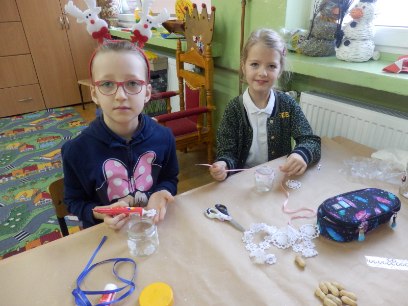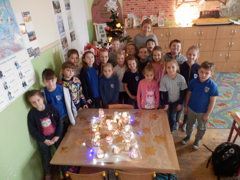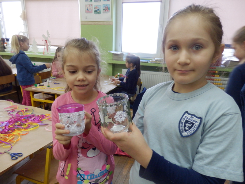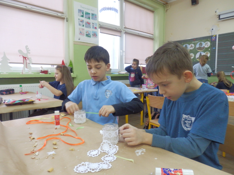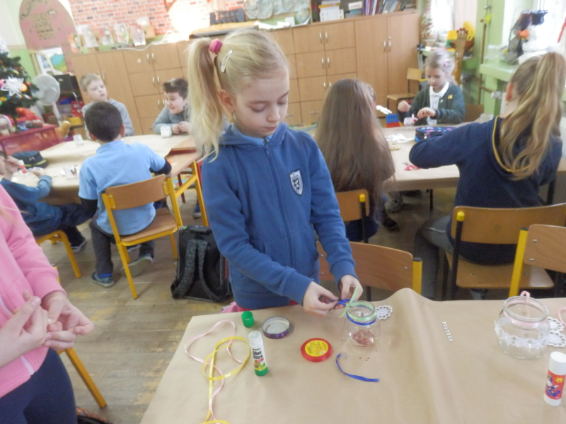 Uczniowie klasy 2c po fascynujących warsztatach mydlarskich, które miały miejsce w listopadzie, postanowili wziąć udział w warsztatach artystycznych pt.: „Świąteczny lampion”. Dzieci, w przeddzień klasowej Wigilii, z wykorzystaniem słoiczków, białych koronek i drewnianych świątecznych figurek, wykonały przepiękne lampiony, które swoim blaskiem udekorowały klasowy wigilijny stół. Inicjatorka warsztatów, pani Agnieszka Piwowarska-Żaba była bardzo zadowolona z efektów pracy dzieci.