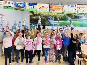 (14) Warsztaty krawieckie- szycie wielkanocnych zajączków w klasie 1a. Brawa dla małych krawców, którzy samodzielnie zszywali swoje zajączki