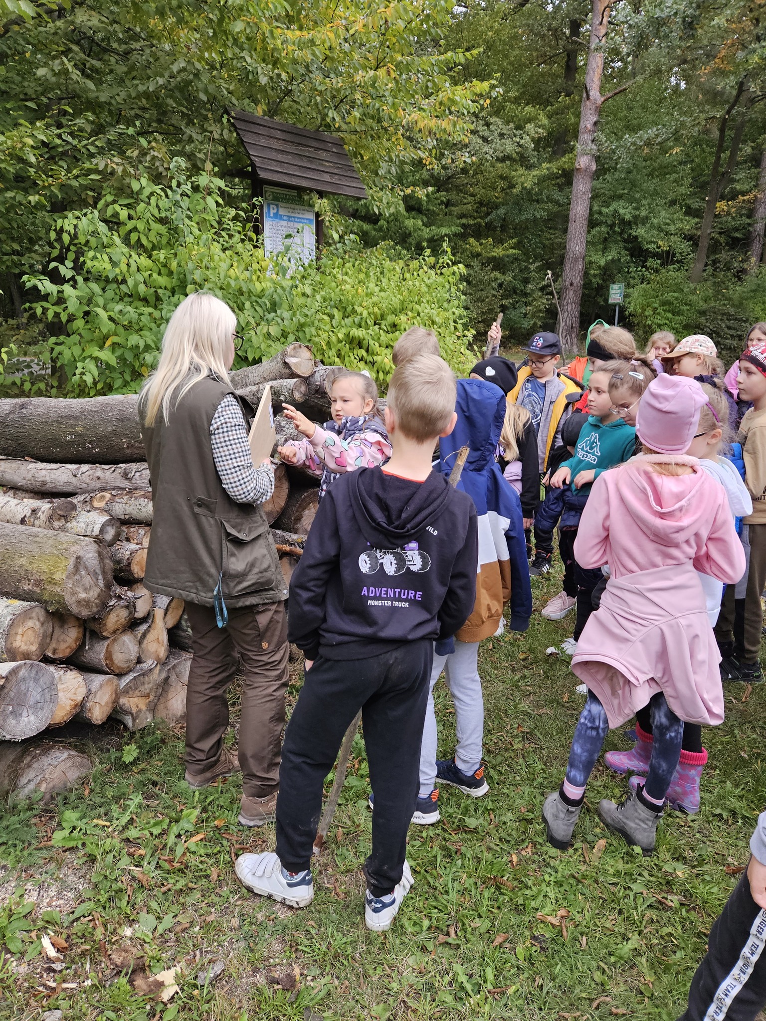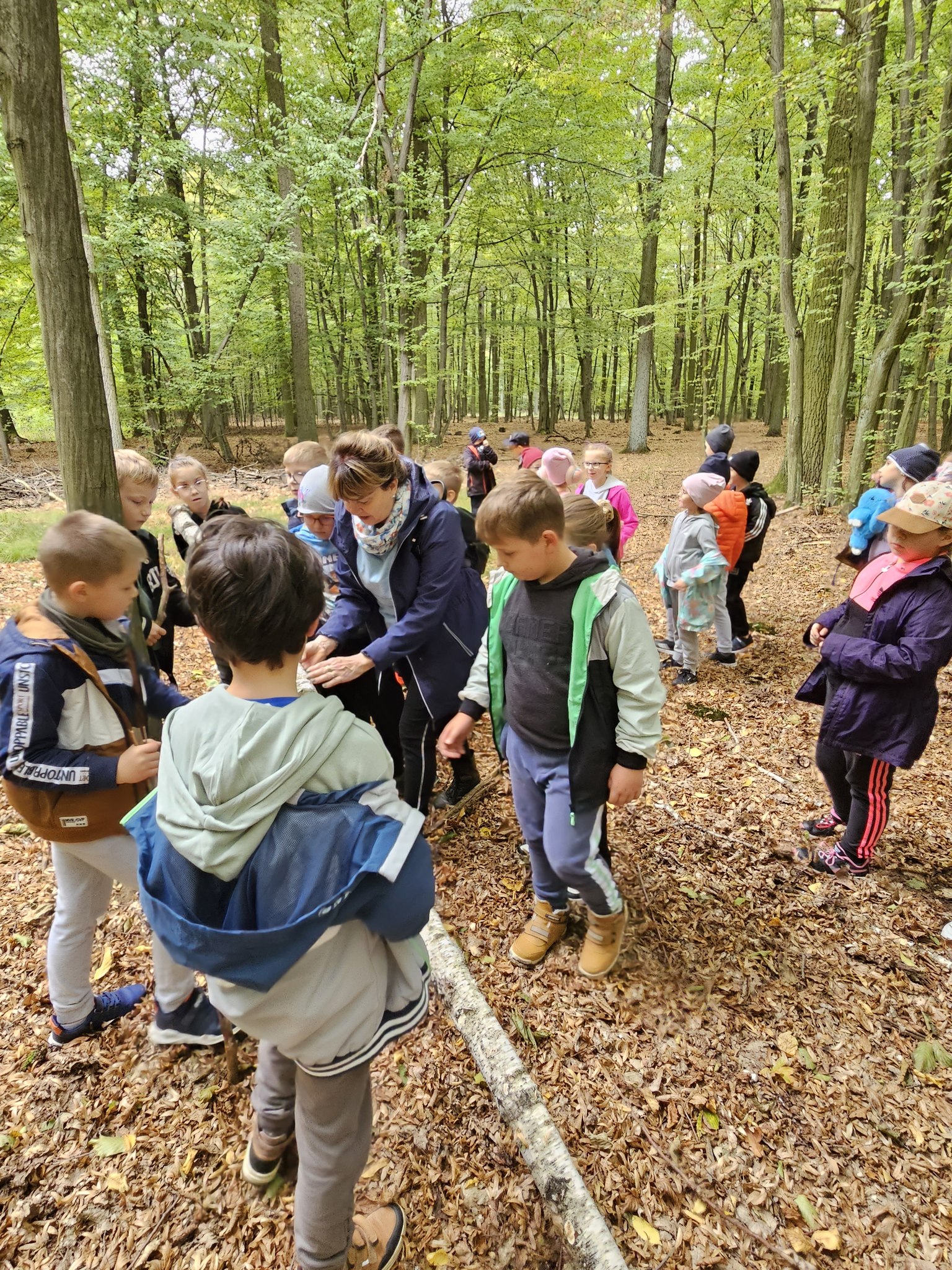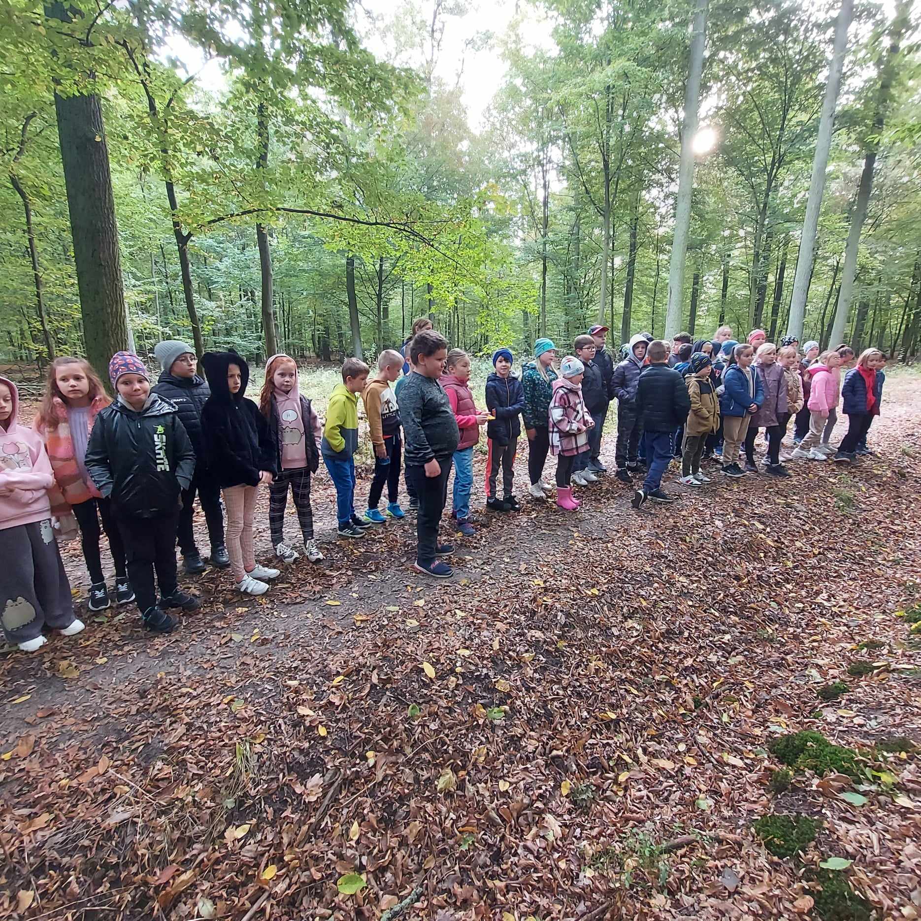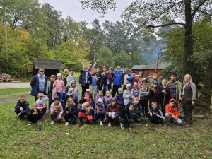 W pogodne środowe przedpołudnie, uczniowie klas 2a i 3b pod opieką wychowawczyń: pani Marzeny Klimek i pani Małgorzaty Lis oraz pań Justyny Żurkiewicz i Doroty Mielcarek wybrali się na wycieczkę do lasu w Nadleśnictwie Taczanów. Las przywitał nas pięknymi jesiennymi barwami i zapachami. Dzieci spotkały się z panią Martyną Frontczak, pracującą w tym nadleśnictwie. Pani Martyna zaprosiła uczestników wycieczki na spacer po lesie, pokazując i ciekawie opowiadając o gatunkach roślin rosnących w tych lasach oraz o zwierzętach tu żyjących. Dzieci mogły rozpoznać ślady dzika i jelenia oraz zebrać ciekawe okazy do kącika przyrodniczego w klasie. Wspólnie przypomnieliśmy zasady przebywania w lesie. Pani Martyna pokazała dzieciom poroże sarny i daniela. Rozmawiała również z dziećmi o tym, jak przygotować się do wycieczki do lasu, jak chronić się przed kleszczami i jak poradzić sobie w lesie w razie zagubienia się czy zauważenia jakiegoś niebezpieczeństwa. Dzieci spędziły także czas na wesołej zabawie na leśnej polanie. Wspólny posiłek na świeżym powietrzu sprawił dzieciom dużą przyjemność. Pełni wrażeń wróciliśmy do szkoły.