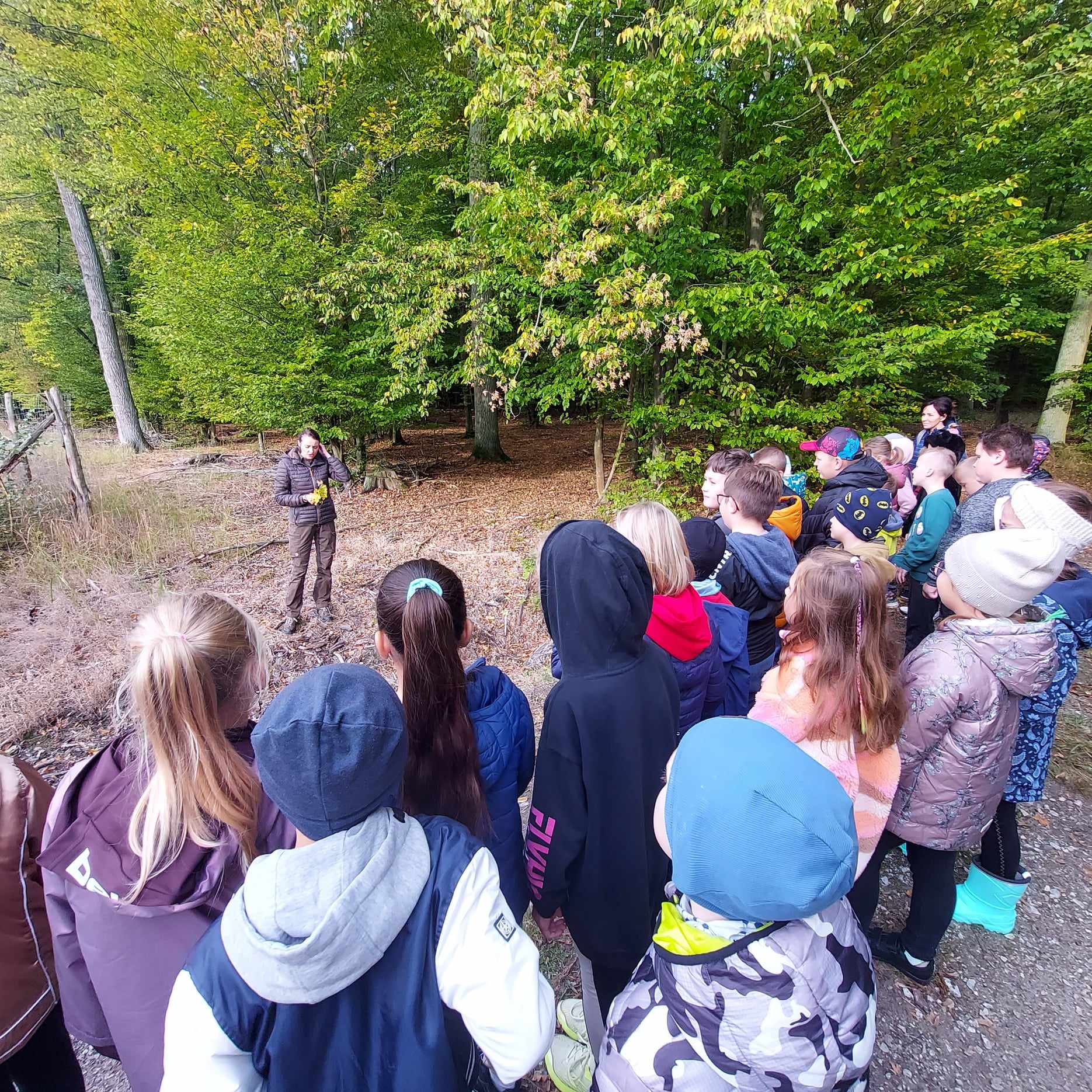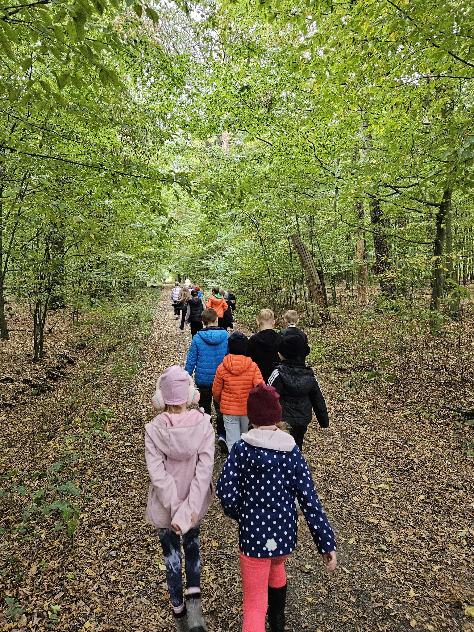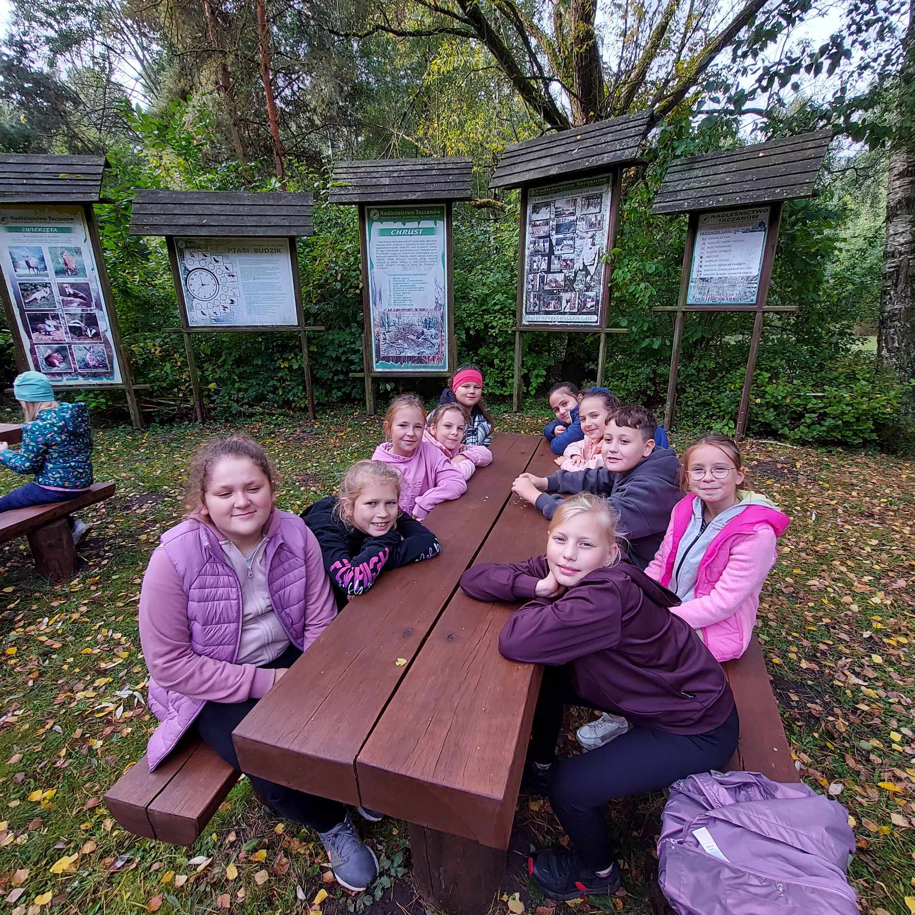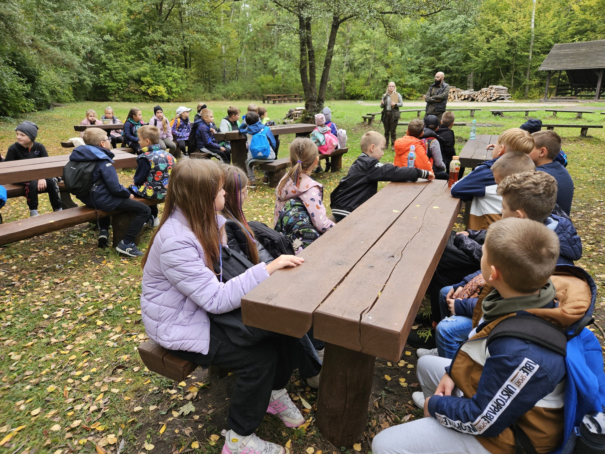 W pogodne środowe przedpołudnie, uczniowie klas 2a i 3b pod opieką wychowawczyń: pani Marzeny Klimek i pani Małgorzaty Lis oraz pań Justyny Żurkiewicz i Doroty Mielcarek wybrali się na wycieczkę do lasu w Nadleśnictwie Taczanów. Las przywitał nas pięknymi jesiennymi barwami i zapachami. Dzieci spotkały się z panią Martyną Frontczak, pracującą w tym nadleśnictwie. Pani Martyna zaprosiła uczestników wycieczki na spacer po lesie, pokazując i ciekawie opowiadając o gatunkach roślin rosnących w tych lasach oraz o zwierzętach tu żyjących. Dzieci mogły rozpoznać ślady dzika i jelenia oraz zebrać ciekawe okazy do kącika przyrodniczego w klasie. Wspólnie przypomnieliśmy zasady przebywania w lesie. Pani Martyna pokazała dzieciom poroże sarny i daniela. Rozmawiała również z dziećmi o tym, jak przygotować się do wycieczki do lasu, jak chronić się przed kleszczami i jak poradzić sobie w lesie w razie zagubienia się czy zauważenia jakiegoś niebezpieczeństwa. Dzieci spędziły także czas na wesołej zabawie na leśnej polanie. Wspólny posiłek na świeżym powietrzu sprawił dzieciom dużą przyjemność. Pełni wrażeń wróciliśmy do szkoły.