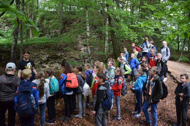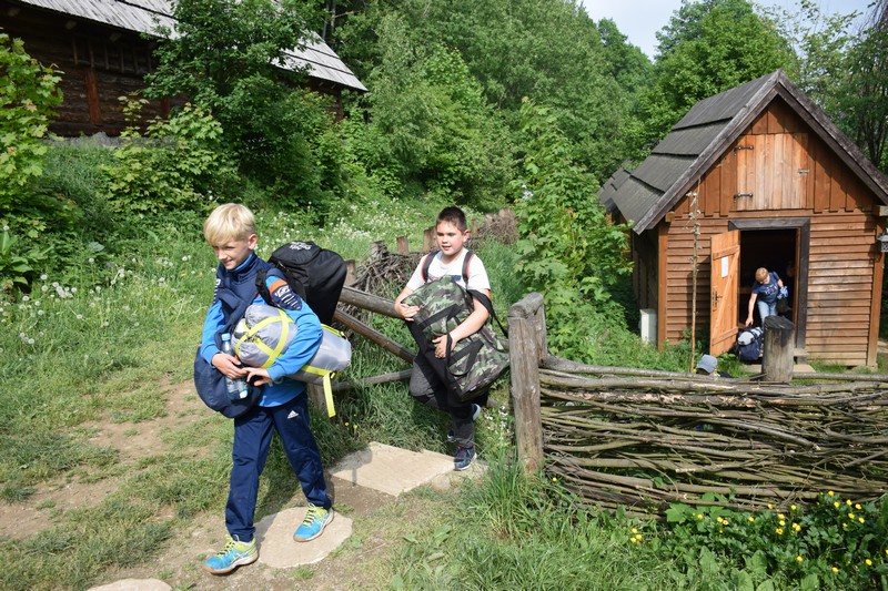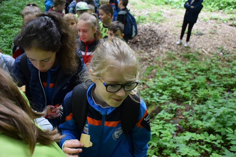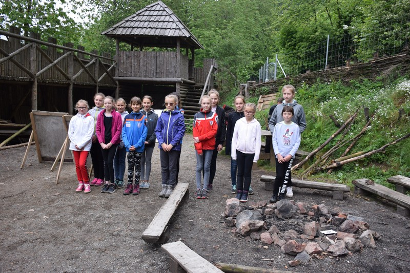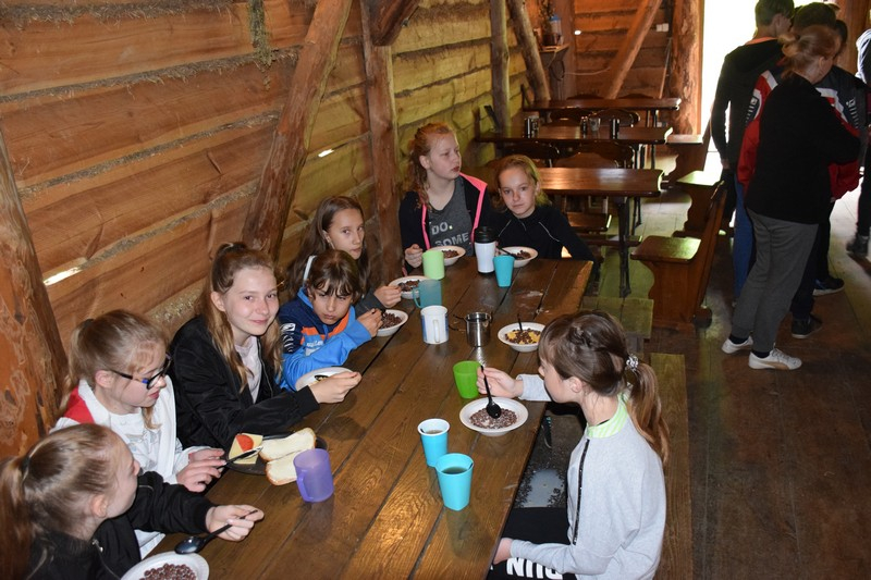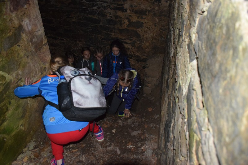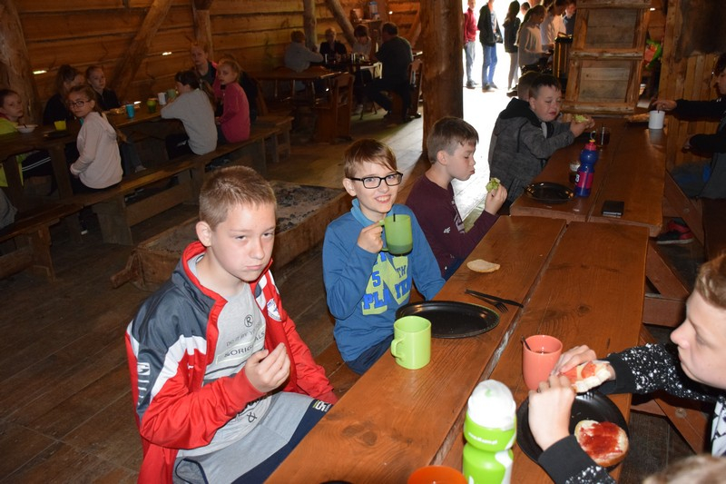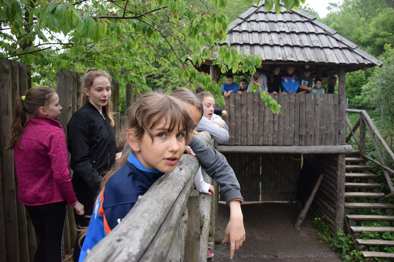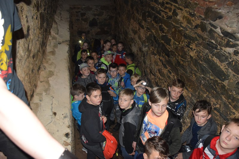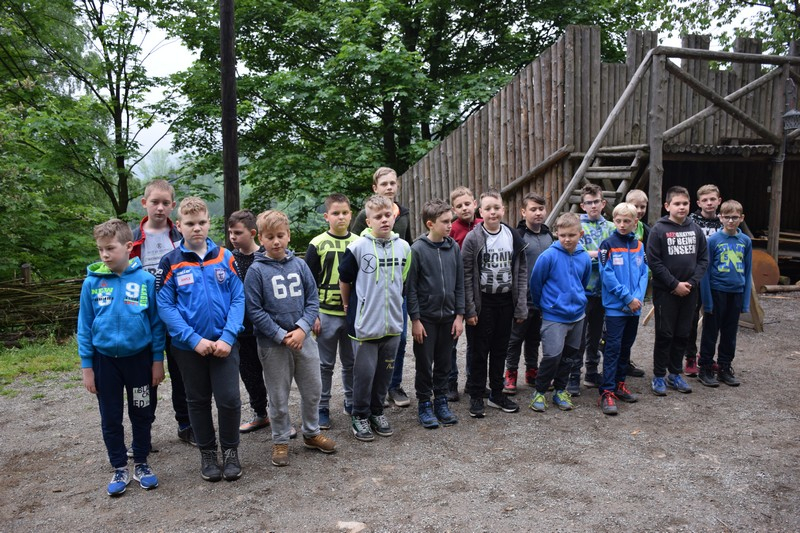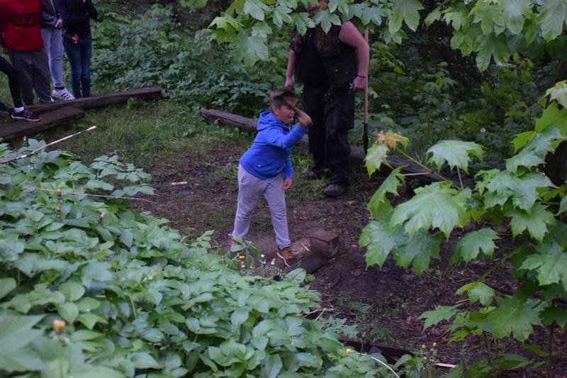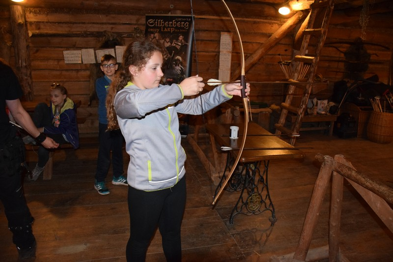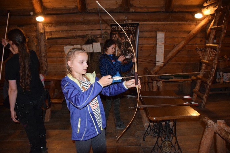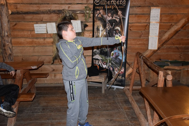 Kolejna wycieczkowa atrakcja to nocne gry terenowe. Na drugi dzień, 11 maja,  odbyła się bitwa łuczników, tu dopiero były emocje. Drużyny trzyosobowe w specjalnych, ochronnych ubraniach strzelały do siebie z łuków, które na strzałach zamiast grotu miały gumowe płaskie nakładki.  Po wyczerpującej bitwie poszliśmy na długi spacer zwiedzić  ruiny twierdzy. Przed wyjazdem do domu smażyliśmy kiełbaski na wcześniej przygotowanym ognisku. I tak zakończyła się nasza wycieczka, która dostarczyła nam wielu  wiadomości i emocji z „ dreszczykiem”.