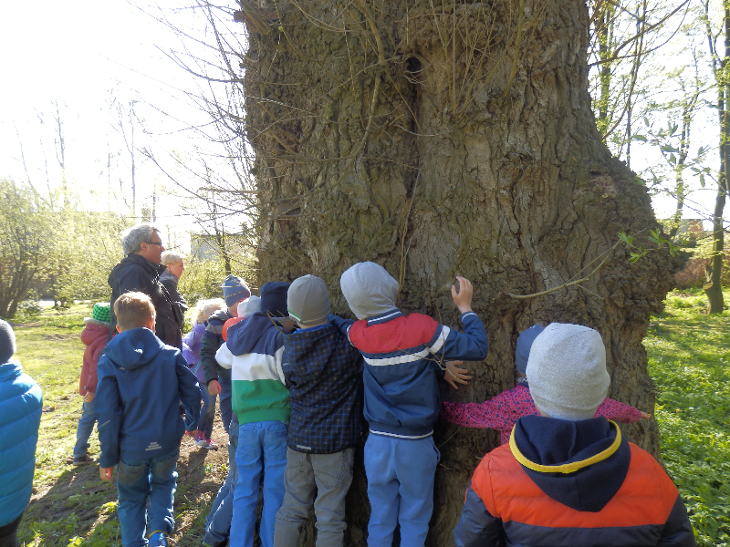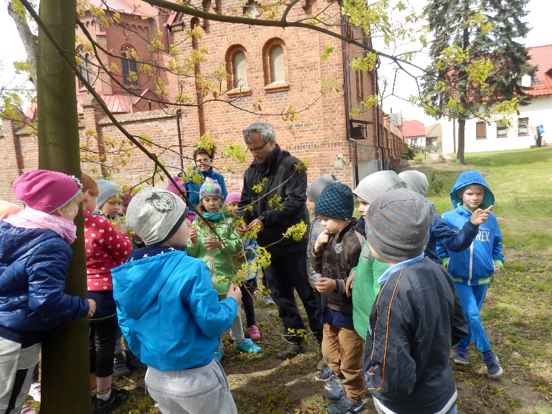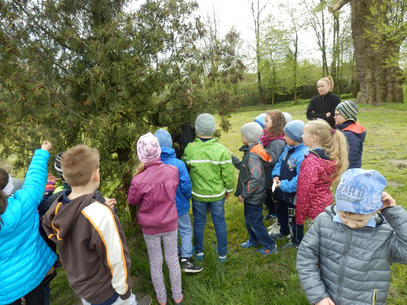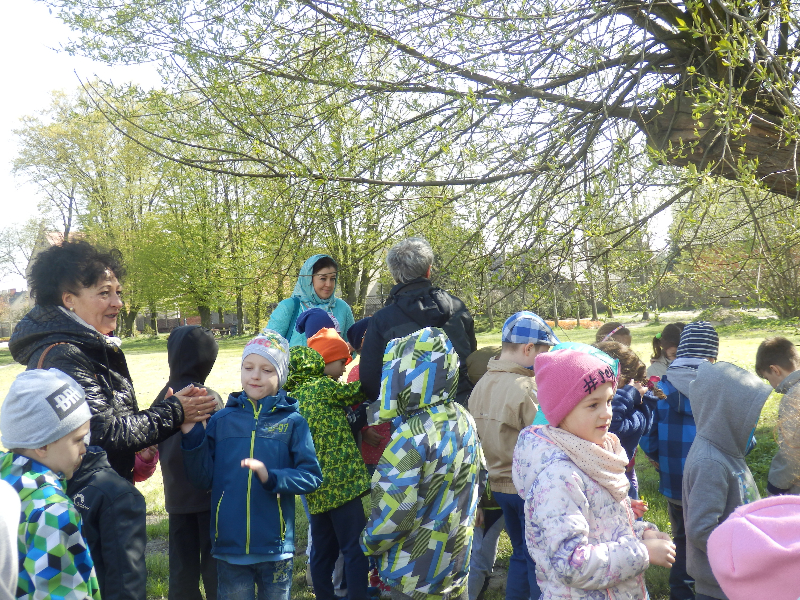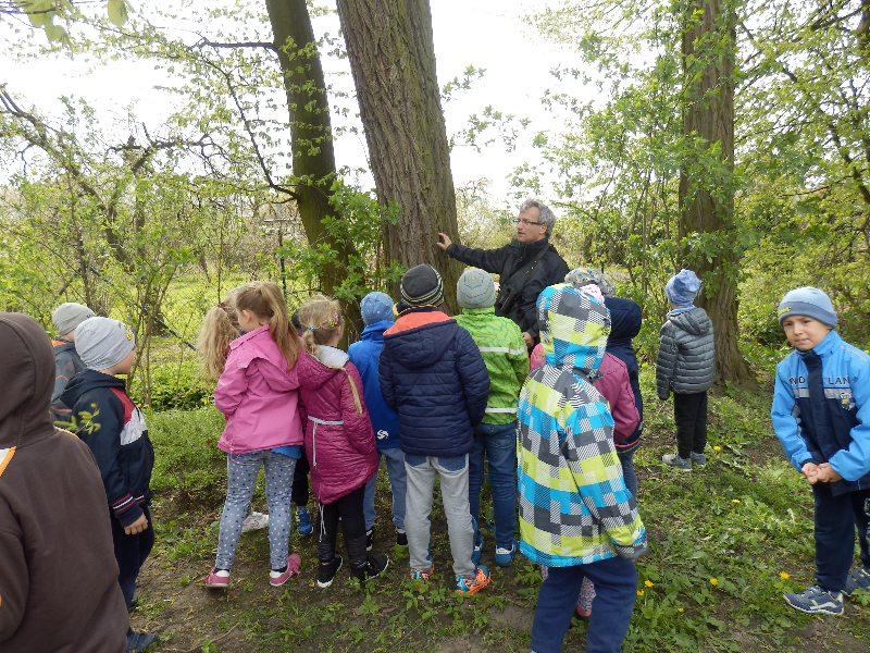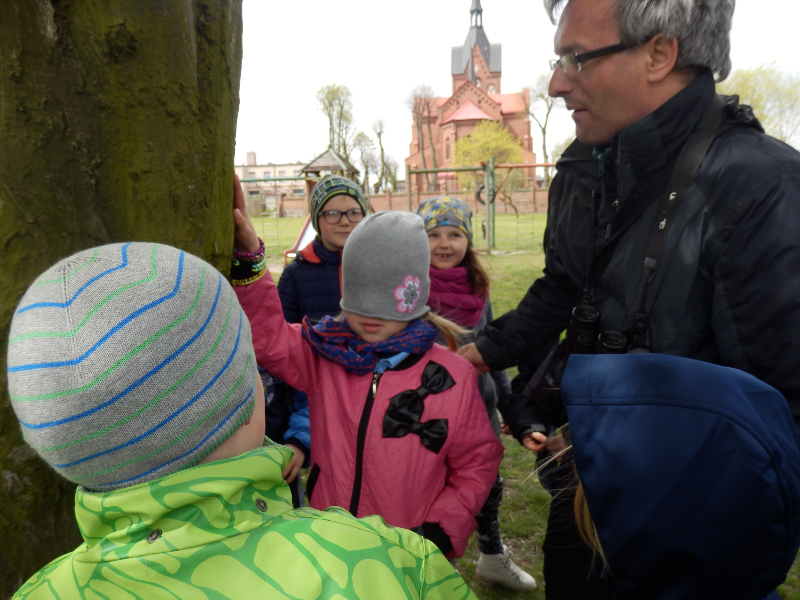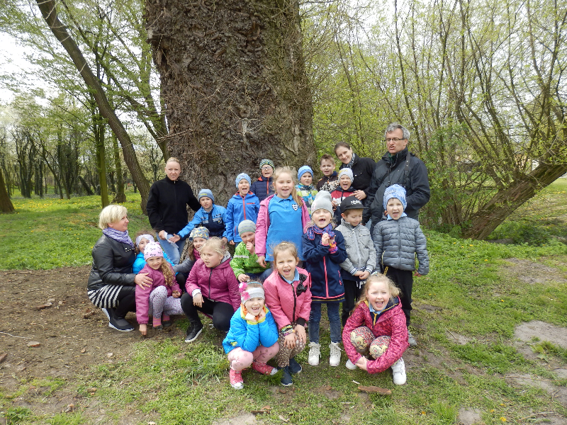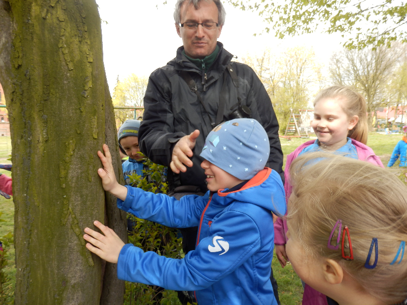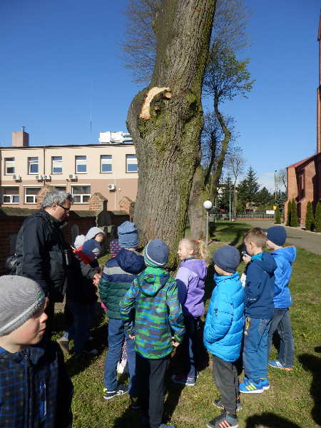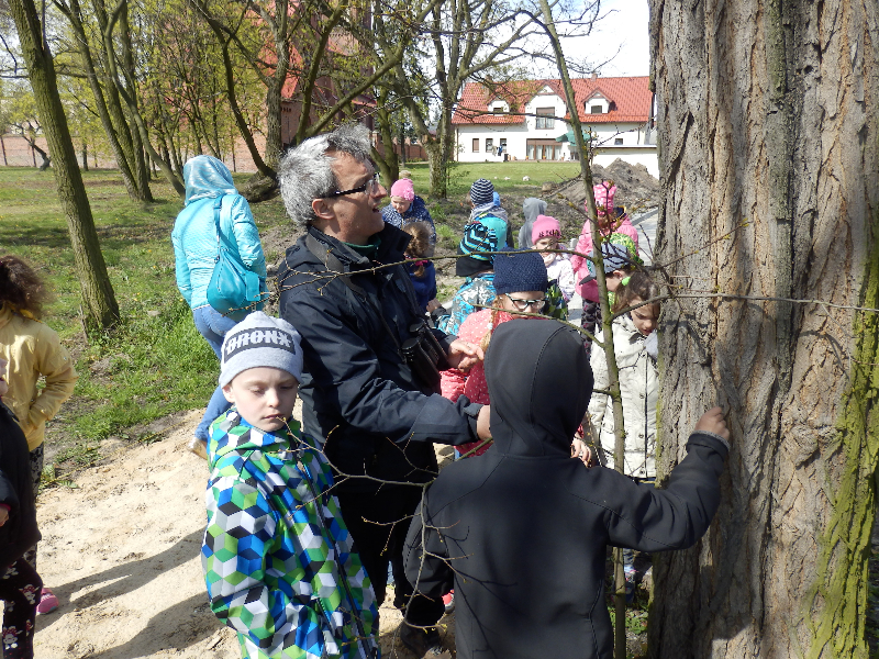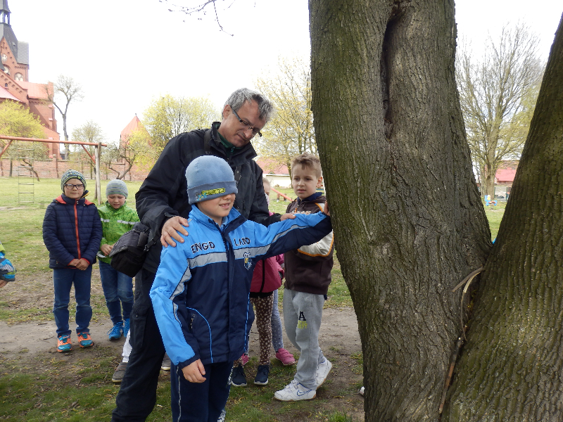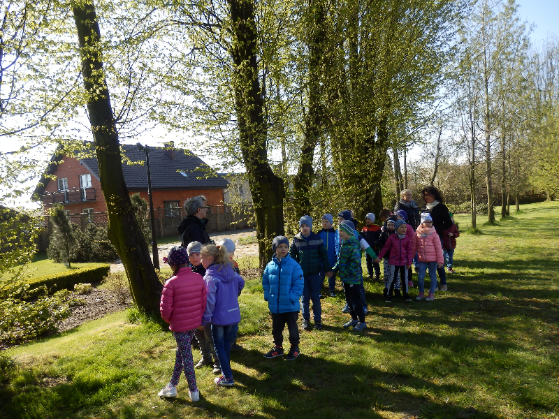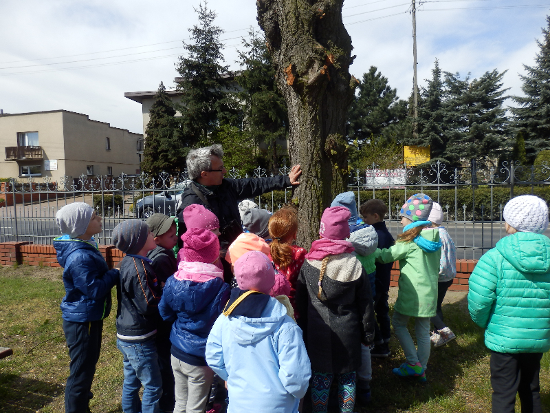 Zajęcia rozpoczęły się już przy szkole, gdzie rosną różne gatunki drzew, a także po drodze, m.in. w alei kasztanowców i jesionów. Pierwszoklasiści po raz pierwszy bawili się w „przyrodniczych detektywów”, ucząc się rozpoznawać poszczególne rodzaje lub gatunki drzew po ich pokroju, kształcie i kolorze kory, liściach i owocach (zeszłoroczne kasztany). W ten sposób, z pomocą prowadzącego zajęcia – pana Pawła T. Dolaty, wykryte i oznaczone zostały: brzozy, robinie akacjowe, graby, jesiony, kasztanowce, klony, wierzby, lipy, topola. Najwięcej radości sprawiało dzieciom rozpoznawanie poszczególnych drzew z zamkniętymi oczami i dotykiem dłoni.