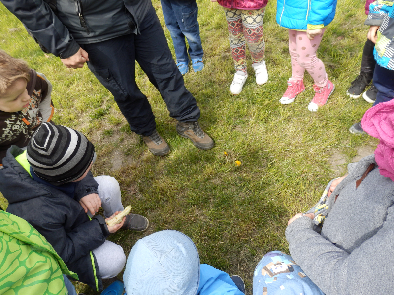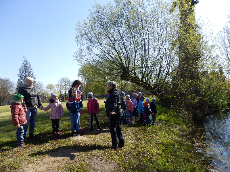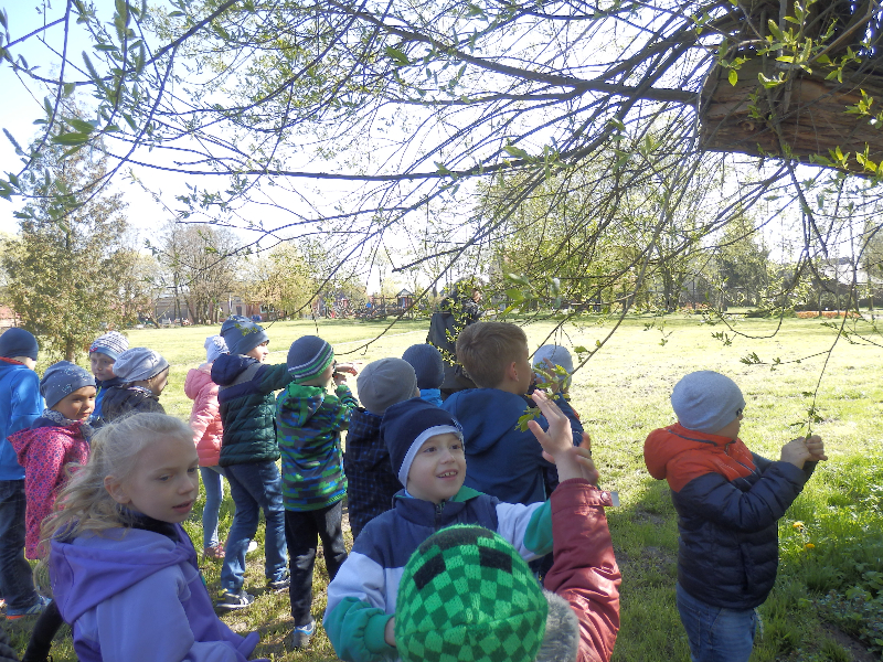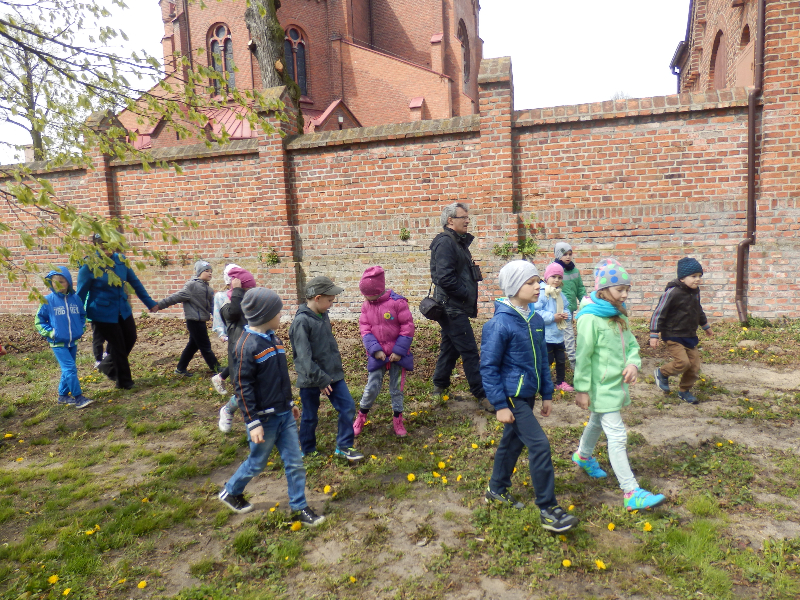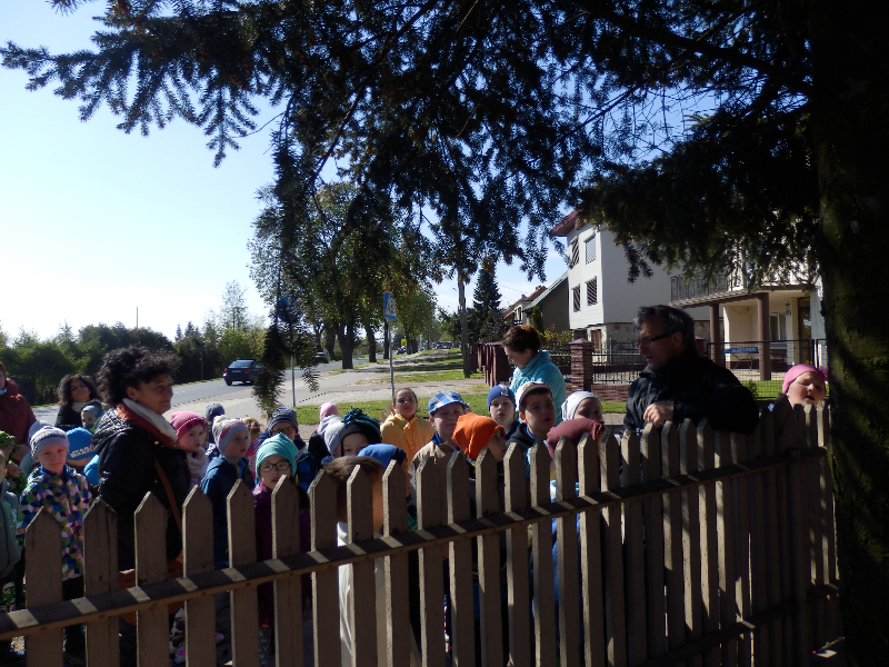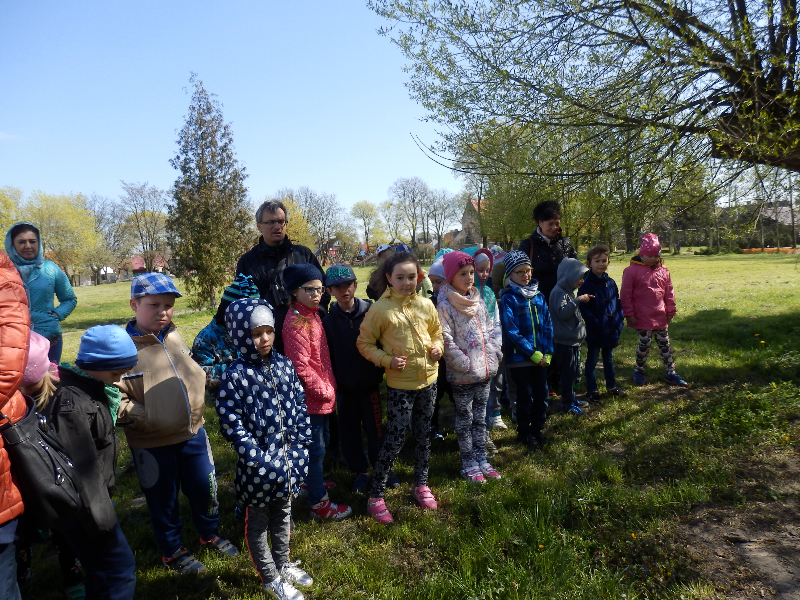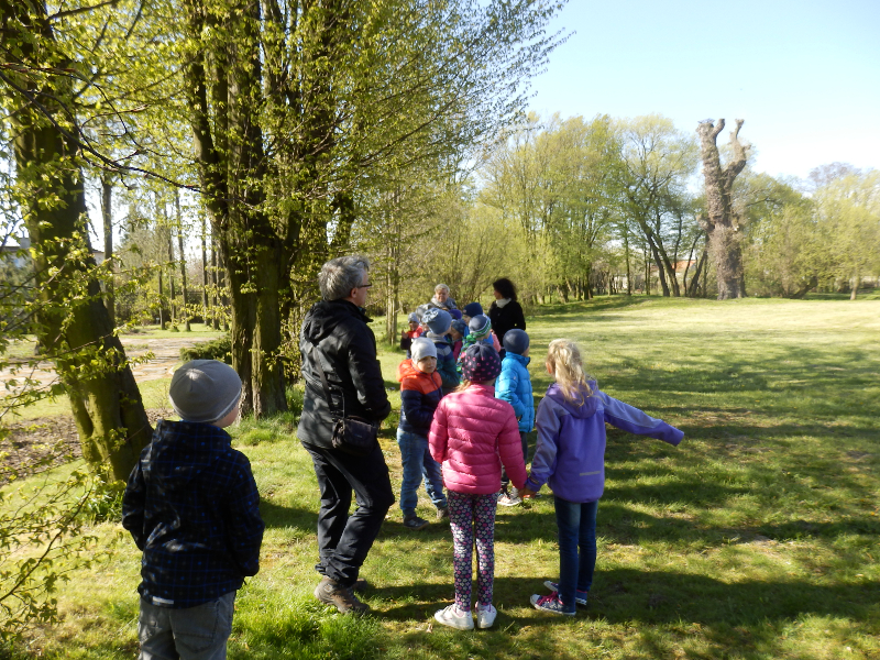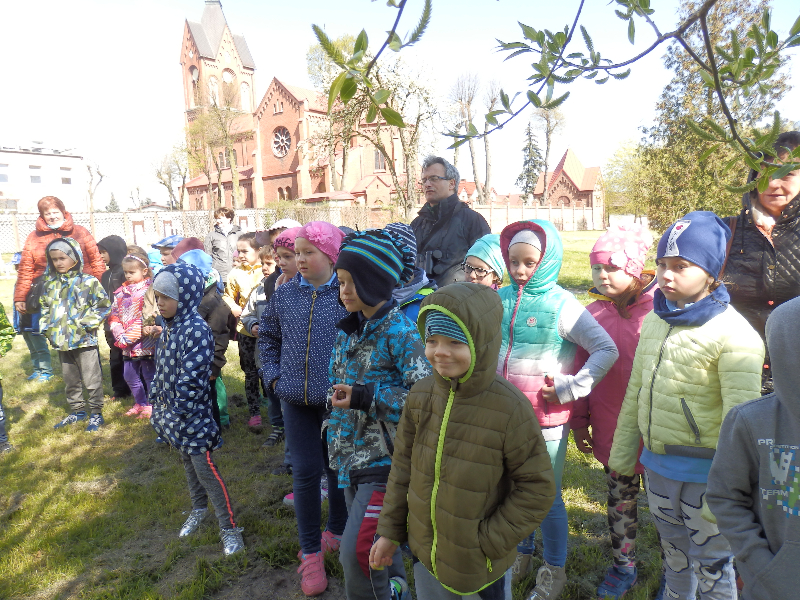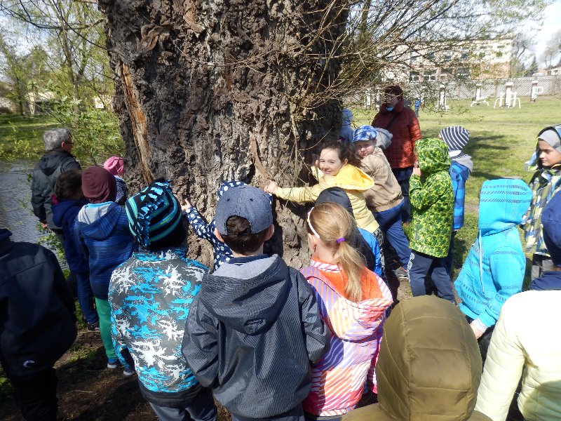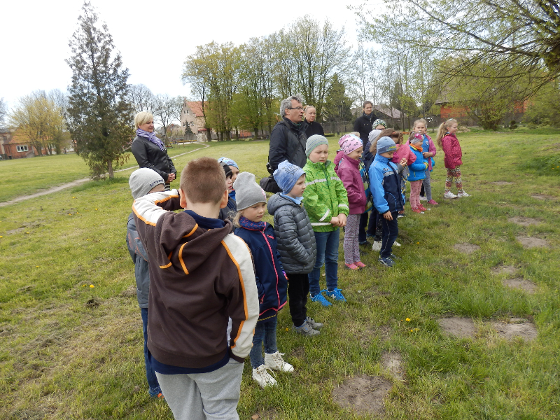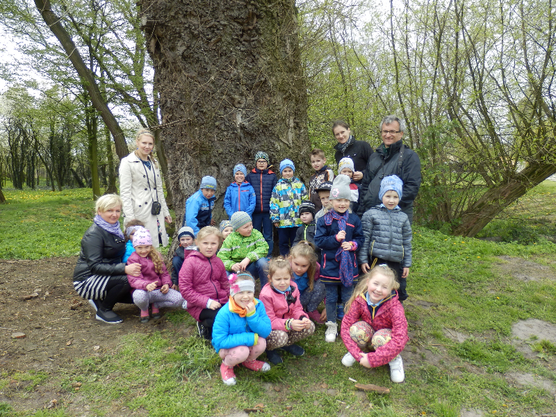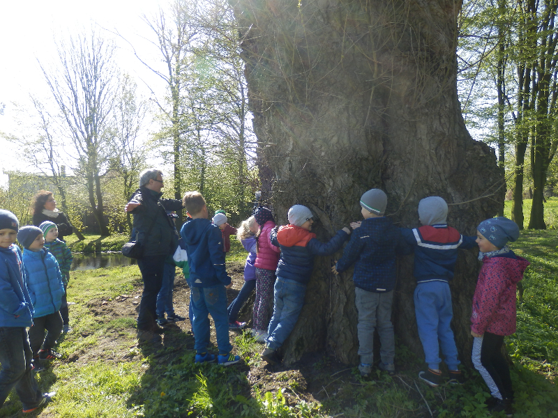 Zajęcia rozpoczęły się już przy szkole, gdzie rosną różne gatunki drzew, a także po drodze, m.in. w alei kasztanowców i jesionów. Pierwszoklasiści po raz pierwszy bawili się w „przyrodniczych detektywów”, ucząc się rozpoznawać poszczególne rodzaje lub gatunki drzew po ich pokroju, kształcie i kolorze kory, liściach i owocach (zeszłoroczne kasztany). W ten sposób, z pomocą prowadzącego zajęcia – pana Pawła T. Dolaty, wykryte i oznaczone zostały: brzozy, robinie akacjowe, graby, jesiony, kasztanowce, klony, wierzby, lipy, topola. Najwięcej radości sprawiało dzieciom rozpoznawanie poszczególnych drzew z zamkniętymi oczami i dotykiem dłoni.