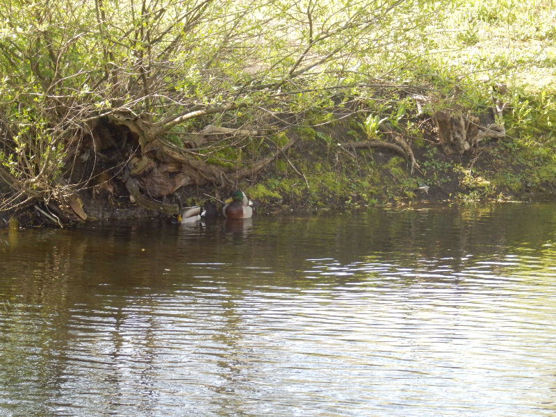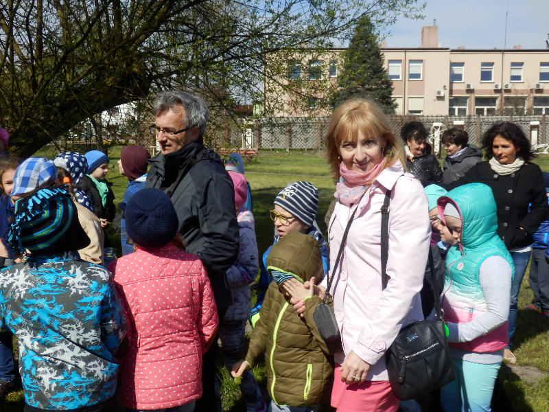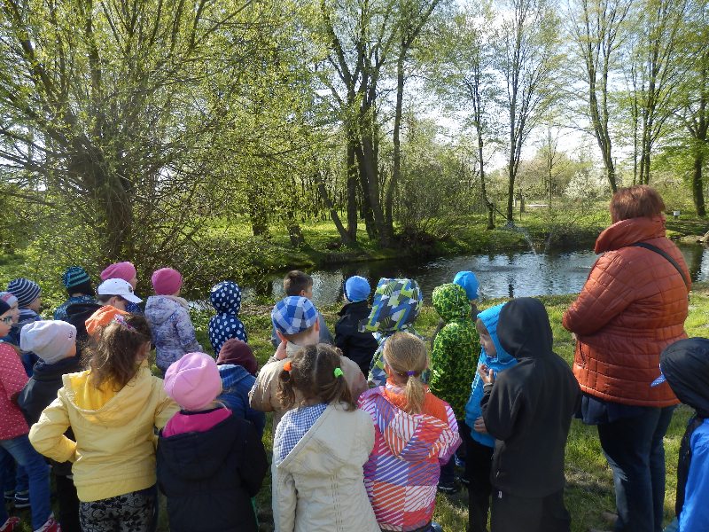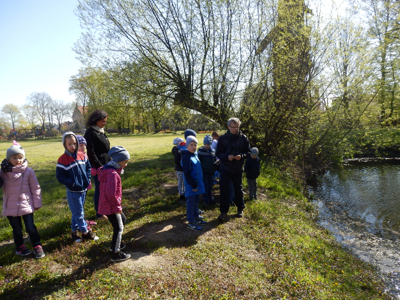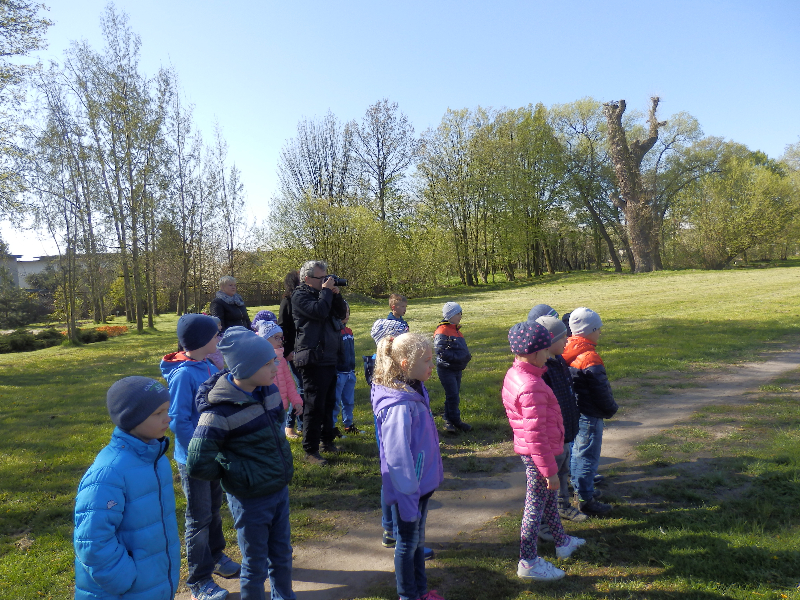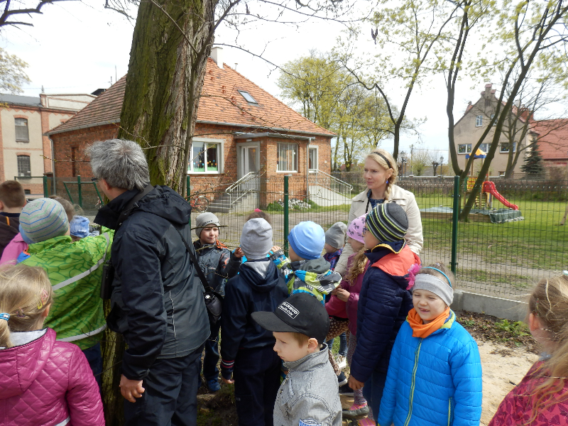 Uczniowie nie tylko zajmowali się drzewami, na stawie w parku obserwowali kaczki krzyżówki, u których niektórzy już umieli odróżnić płeć kolorowych samców od brązowych samic, a pozostali się tego nauczyli. Ostatnia grupa młodych obserwatorów przyrody znalazła wysiadującą zapewne jajka kaczkę krzyżówki w bardzo nietypowym miejscu – na podstawie przygotowanej dla bociana białego na potężnej topoli, największym drzewie w parku.